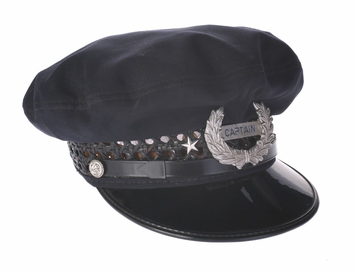 (Disneyland, 1970s) Cast member hat and Captain's badge for Disneyland's "Mark Twain" riverboat. The cloth, vinyl and leather hat stands 3" tall. In very good condition with expected wear from use. Marked size 7 1/8 on the interior leather trim.