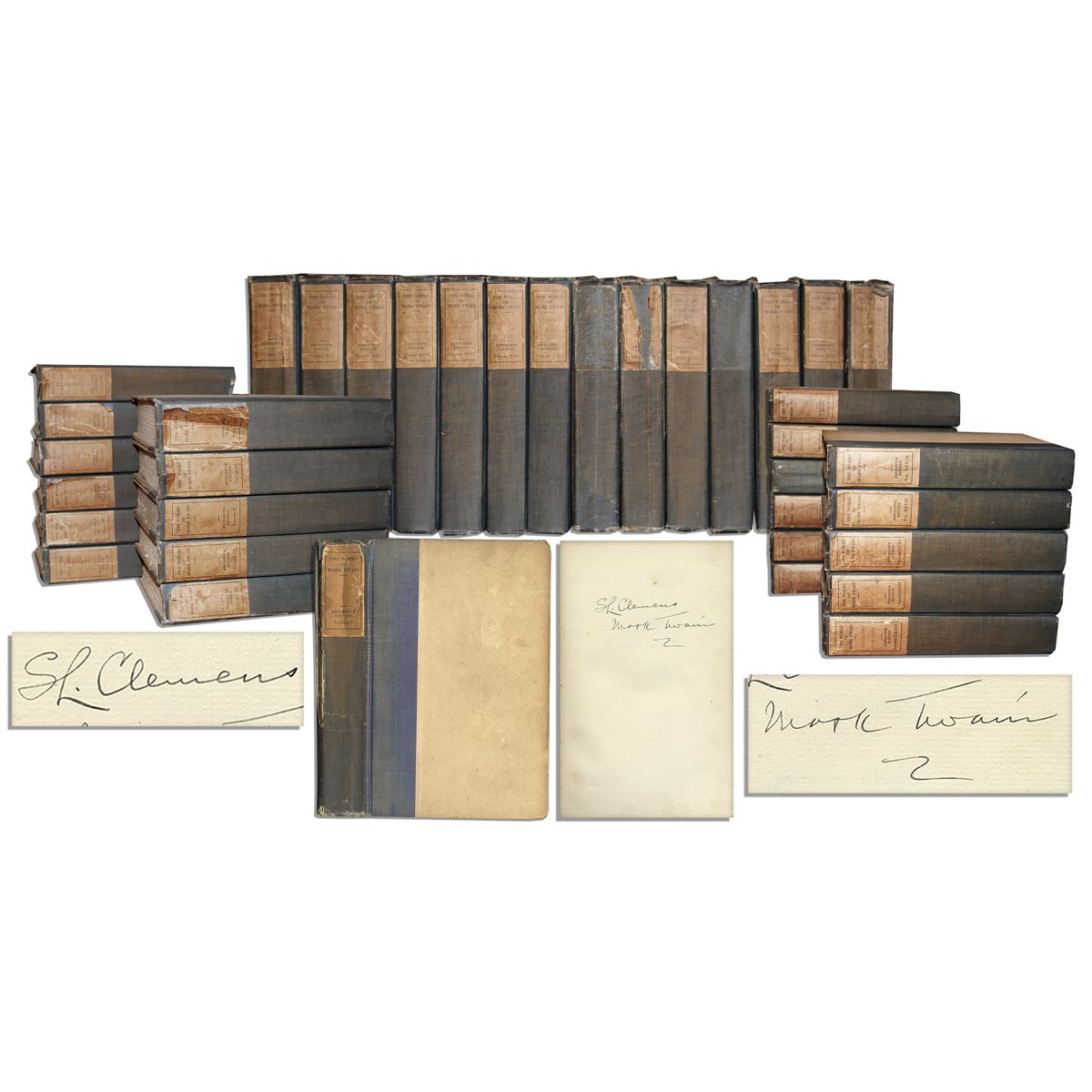 Mark Twain twice-signed edition of ''The Works of Mark Twain'', published by Gabriel Wells: New York: 1922-1925. Complete 37 volume set; the first 8 volumes were published in 1922, volumes 9-35 were published in 1923 and the set concludes with Paine's ''Biography of Twain'', published in 1925. One of the most celebrated of American authors, Twain signs the first volume upon a tipped-in fly-leaf with both his given and pen names, ''S. L. Clemens / Mark Twain''. The preceding page is signed, ''Allen Bigelow Paine'' beneath a printed statement that reads in full, ''This fly-leaf was signed by Mark Twain in 1906 in anticipation of the present definitive edition of his works''. The signed leaves remained in the Harper & Co. vaults for more than a decade until Wells purchased the rights and published Twain's works posthumously. Edition is labeled as number 217 of 1,024. Complete set comprises 37 illustrated volumes, also featuring photogravure frontispieces and printed parchment sheets in every book. Volumes feature deckled edges and are bound in beige paper boards with blue cloth spines and applied paper labels. Each measures 6'' x 9''. Set weighs 50 pounds altogether. Toning to boards and wear to exteriors, especially to edges, and some volumes show cracking to interior hinges, absent spine labels, and some tearing to backstrips, else very good to near fine, with signed leaf in near fine condition.