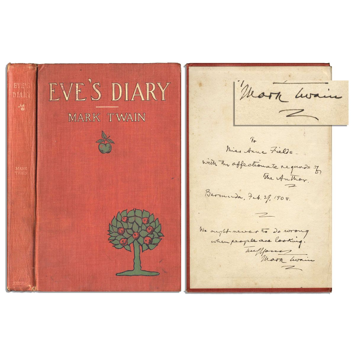 ''Eve's Diary'' by Mark Twain, published by Harper and Brothers: London and New York: 1906. Signed boldly on the pastedown with typical wit by the legendary American author: ''To Miss Anne Fields -- with the affectionate regards of The Author. / Bermuda, Feb. 29, 1908. / We ought never to do wrong when people are looking. Truly yours, Mark Twain''. Originally published in ''Harper's Bazaar,'' the book purports to be Eve's first person account of her experience in the newly-created Garden of Eden ''translated from the original ms.'' It was written shortly after the death of Twain's wife of 34 years and ends poignantly at Eve's grave with Adam's statement: ''Wheresoever she was, there was Eden.'' The book's black and white woodcut illustrations by Lester Ralph caused a controversy at the time of publication because the first couple was shown without clothing. All of Ralph's fifty-five illustrations are present as are first printing points, ''Published June, 1906'' on copyright page and ''London and New York'' on title page. The book, measuring 5.25'' x 8'', in original red-cloth boards, without dustjacket, shows minor foxing and toning throughout. Minor soiling to boards and fading to backstrip; overall in very good condition.