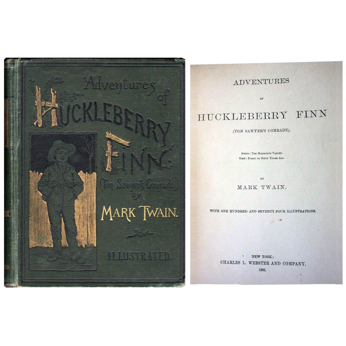 First edition of ''Adventures of Huckleberry Finn'' by Mark Twain with illustrations by E.W. Kimble. New York: Charles L. Webster and Company: 1885. First edition of the beloved classic that became the wellspring of American literary fiction. Hemingway once said of it, ''All modern American literature comes from just one book by Mark Twain called 'Huckleberry Finn.''' All but one first printing points present including: (1) heading for chapter 6 reads ''decided'' (later corrected to ''decides'') on page 9; (2) ''Him and another man'' listed incorrectly at page 88 (on page 13); (3) page 57, 11 lines from bottom, reads: ''with the was''; (4) ''Heliotype Printing Co.'' imprint is present on frontis; (5) on page 155, the second ''5'' is missing; (6) page 143: ''l'' missing in ''Col.'' (that is part of the illustration at the top line of text). This copy lacks the title page and there is some light rubbing to boards and foxing to endpapers. With some archival restoration to preserve condition, overall a presentable copy in very good condition.