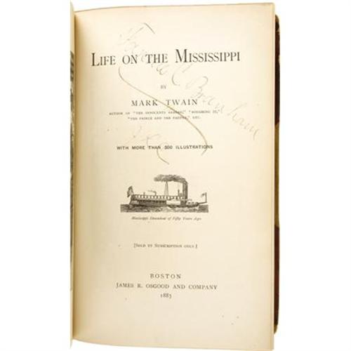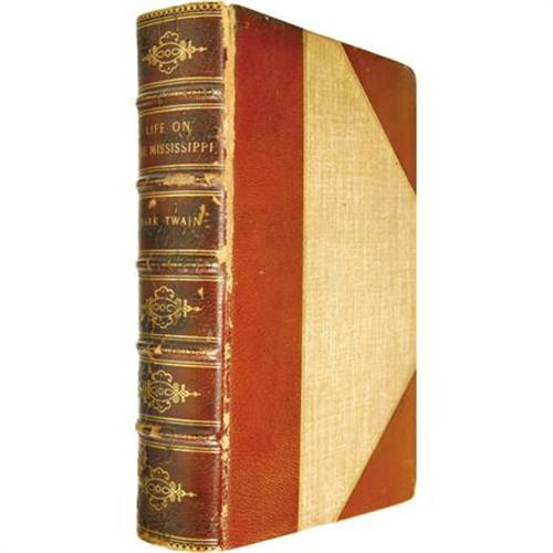 <B>Mark Twain: <I>Life on the Mississippi</B></I></B></I> (Boston: James R. Osgood and Company, 1883), first edition, intermediate issue (the illustration captioned "THE ST. LOUIS HOTEL" on page 443, but no Twain in flames illustration on page 441), 624 pages, brown half leather binding on light brown cloth, 8vo (6" x 8.75"). One of Twain's favorites among his own works. The book is in good condition, with noticeable wear to the leather spine and edges, bumped corners, and toning to the textblock edges. Previous owner has signed her name to the title page.<BR><BR><b>Shipping:</b> Books & Catalogs (<a target="_blank" href="http://www.heritageauctions.com/common/shipping.php">view shipping information</a>)