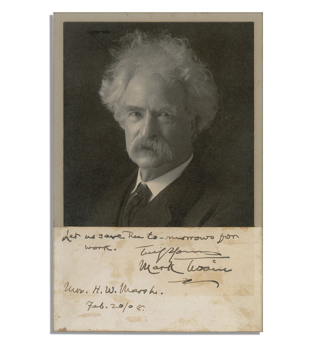 Mark Twain photograph and autograph quotation signed from 1908. Upon the white mat beneath the photo, Twain writes, ''Let us save the to-morrows for work. Truly Yours / Mark Twain / Mrs. H. W. Marsh / Feb. 20/08''. Verso of photo has original photographer's backstamp, ''Louis Katz Art Galleries / No. 7656.'' Photo measures 6.5'' x 4.25'', matted to an overall size of 8'' x 10''. Some portions of discoloration to mat, otherwise very good with bold handwriting.