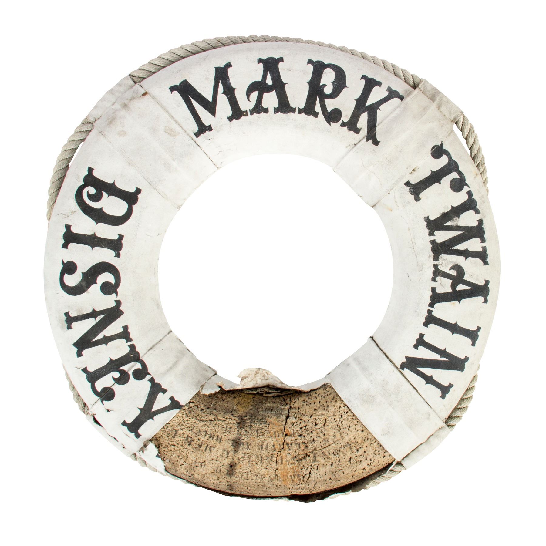 (Disneyland, c.1960s) A rare life-preserver prop that once hung on Disneyland's Mark Twain Riverboat in the 1960s. The life-preserver is constructed of canvas and rope and measuring approximately 26" in diameter. The condition is fair with some wear from use and a portion of exposed padding.