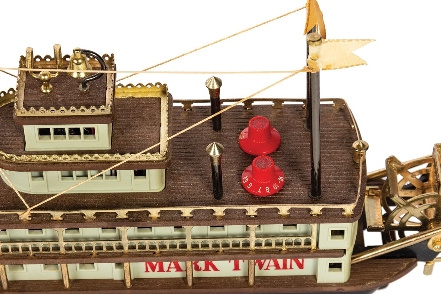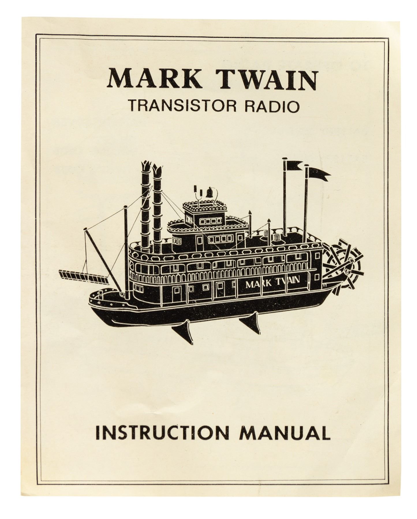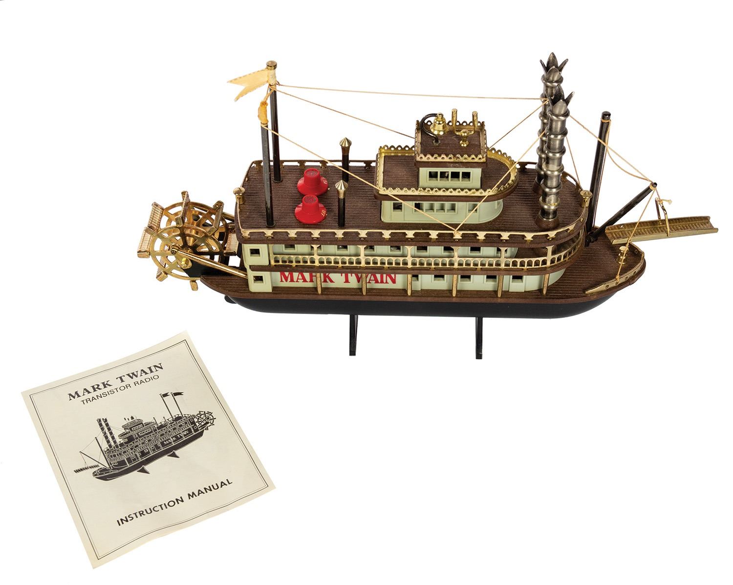 (Disneyland, 1960s) An original solid state radio shaped like the Mark Twain Riverboat at Disneyland. This beautiful replica comes with the original instruction manual. The radio measures 2.25"x11.5" and 7.5" tall and is in very good functioning condition with very light scuffing on the deck.