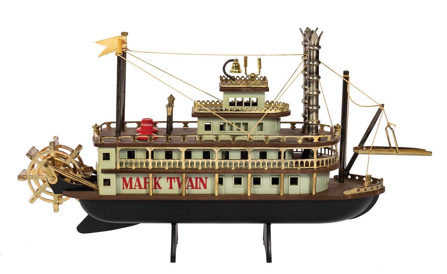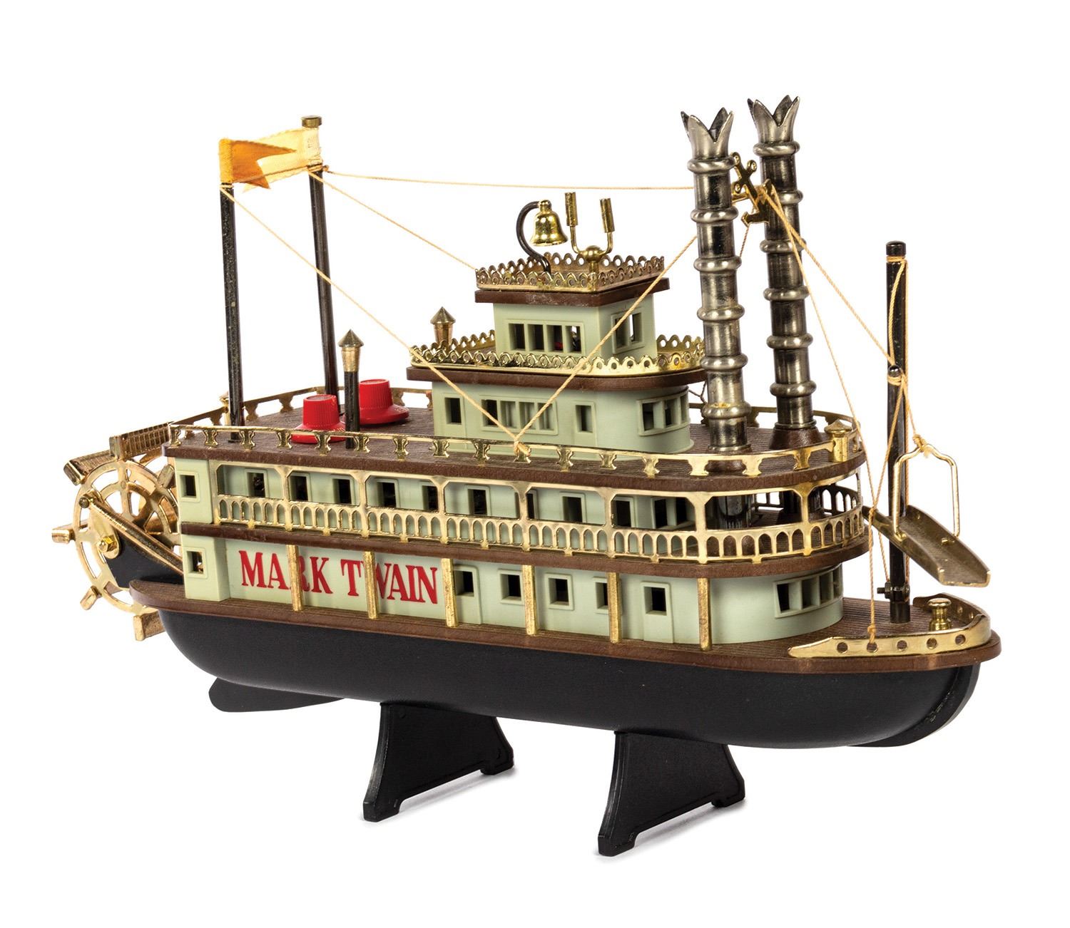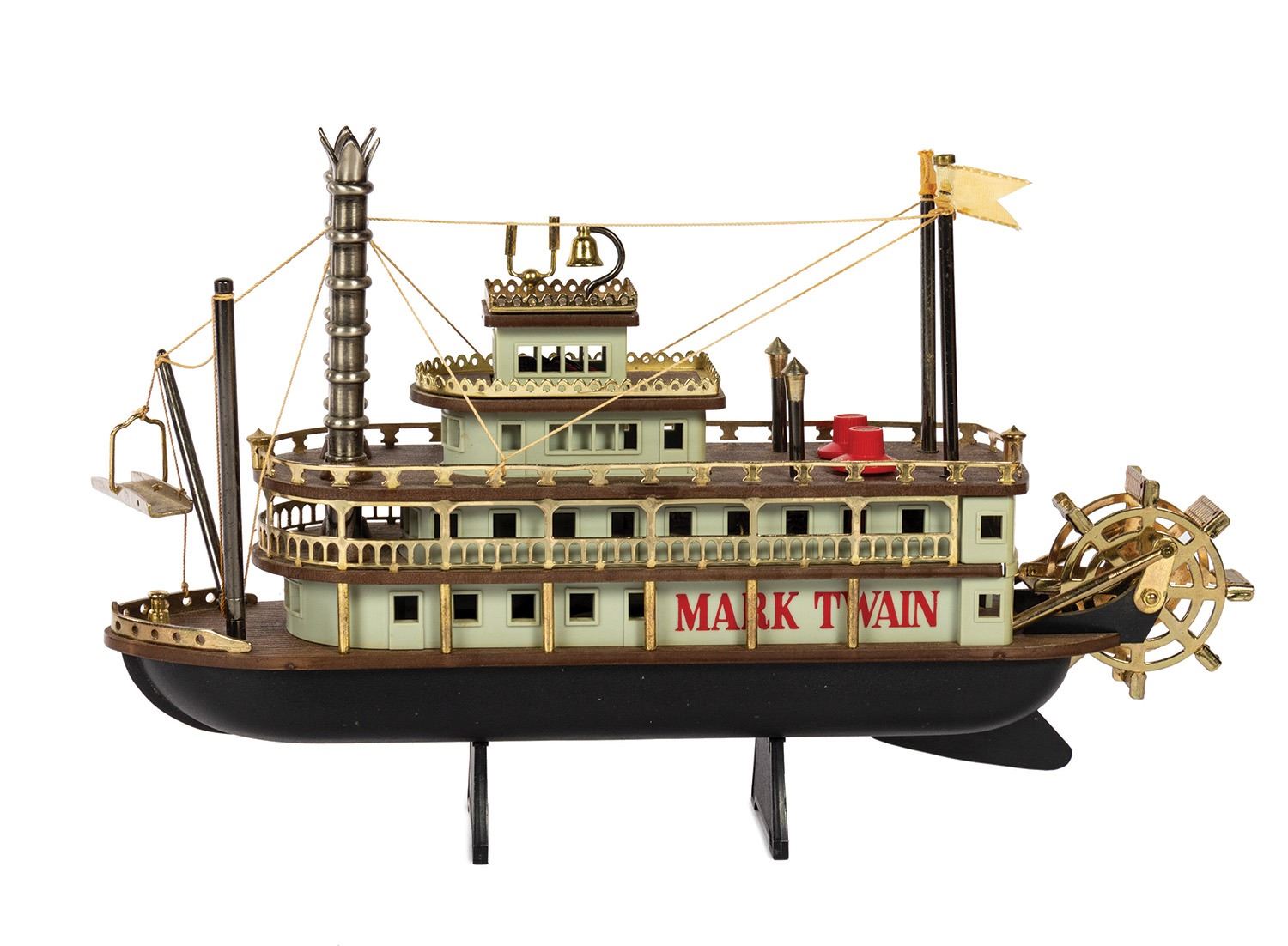 (Disneyland, 1960s) An original solid state radio shaped like the Mark Twain Riverboat at Disneyland. This beautiful replica comes with the original instruction manual. The radio measures 2.25"x11.5" and 7.5" tall and is in very good functioning condition with very light scuffing on the deck.