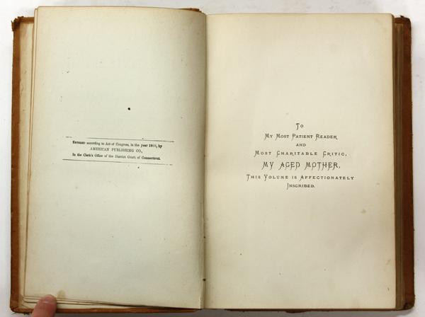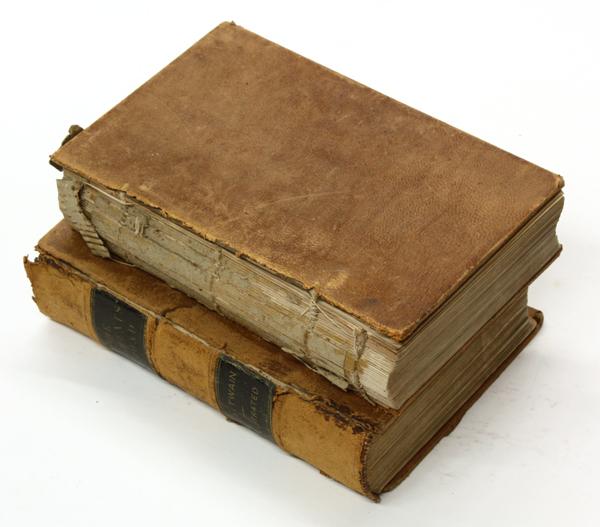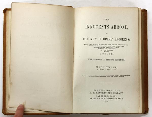 (lot of 2) Books, Mark Twain (Samuel Clemens), including Roughing It, American Publishing Company, 1872, and Innocents Abroad, or The New Pilgrims' Progress, San Francisco, Bancroft, American Publishing Company, 1869, each book, 9'' x 6.25''