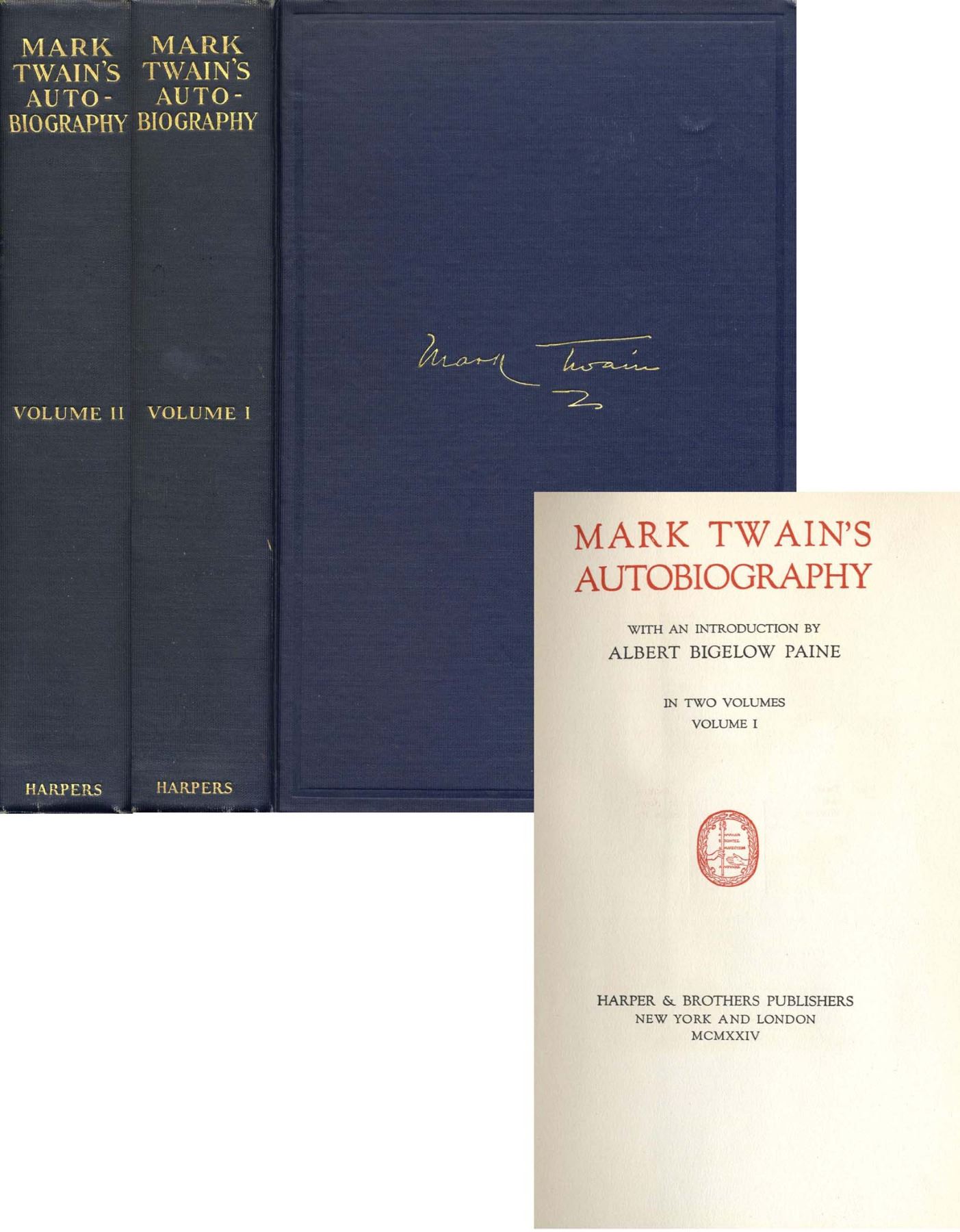 Mark Twain's Autobiography'' with a foreword by Twain's biographer, Albert Paine. First edition in two volumes. New York: Harper & Brothers: 1924. Octavo books run approximately 365pp. In order to ''speak freely'' of the ''privacies of his life,'' it was Twain's original wish that his autobiography not ''...be published until he had been dead at least a hundred years.'' Instead it was published a mere 14 years after his death. Blue cloth boards are adorned with gilt. Book is slightly edgeworn and toned, and tears are present on two pages in the second volume. Very good condition.