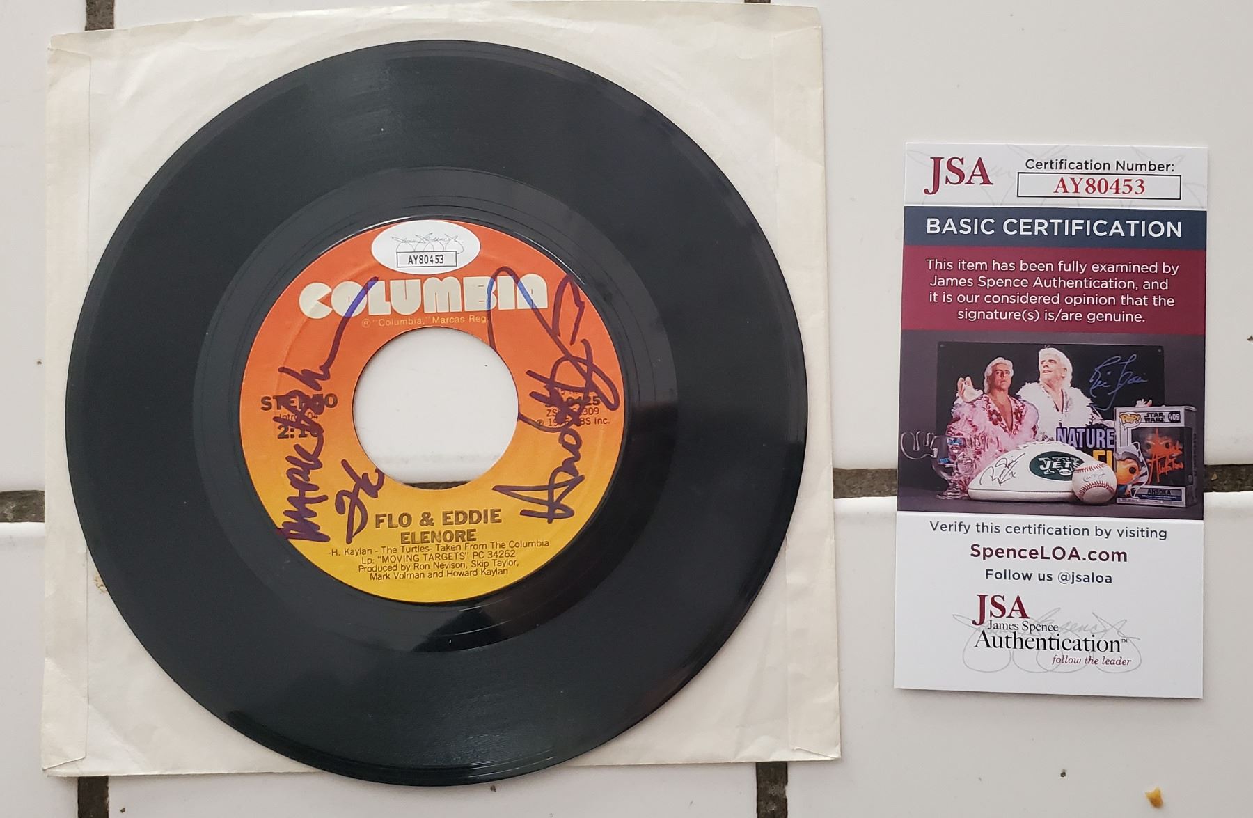 An Autographed Flo & Eddie 45 record signed by Mark Volman and Howard Kaylan, the founding members of The Turtles. JSA authenticated the autograph, providing a COA numbered AY80453.