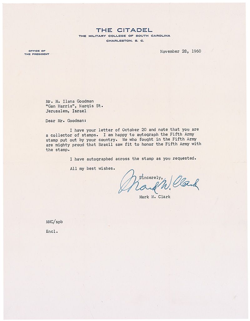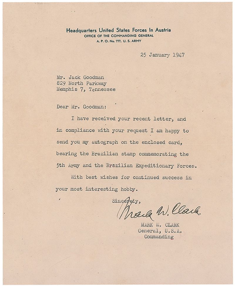 Two one-page TLSs, both signed “Mark W. Clark,” one from 1947 measuring 6.5 x 8 and one from 1960 measuring 8.5 x 11. The 1960 letter reads, in part: “I am happy to autograph the Fifth Army stamp put out by your country. We who fought in the Fifth Army are mighty proud that Brazil saw fit to honor the Fifth Army with the stamp.” In fine condition, with intersecting folds to both and mild toning to the 1947 letter.