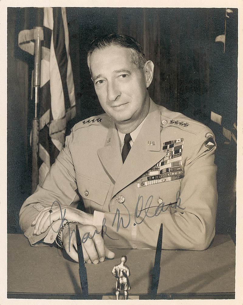 Vintage matte-finish 3.5 x 4.5 photo of Clark seated at his desk, signed in fountain pen. Moderate silvering to darker areas of image and background, otherwise fine condition.