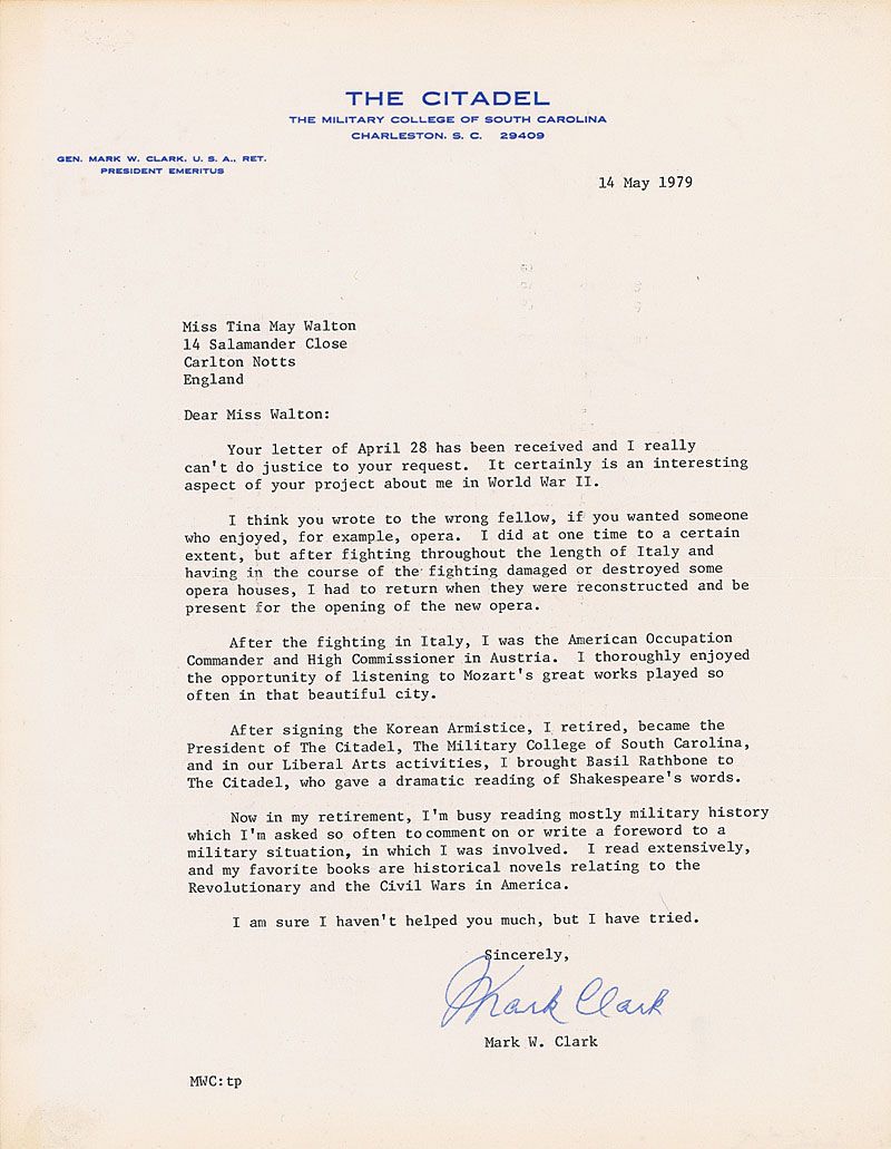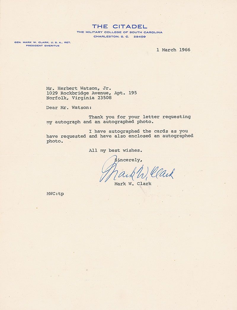 Two TLSs, each one page, 8.5 x 11, The Citadel letterhead, dated 1966 and 1979. The first, in part: “I have autographed the cards as you requested.” The second, in part: “I did at one time to a certain extent, but after fighting throughout the length of Italy and having in the course of the fighting damaged or destroyed some opera houses, I had to return when they were reconstructed…After the fighting in Italy, I was the American Occupation Commander and High Commissioner in Austria. I thoroughly enjoyed the opportunity of listening to Mozart’s great works played so often in that beautiful city.” In overall fine condition, with unobtrusive intersecting folds.