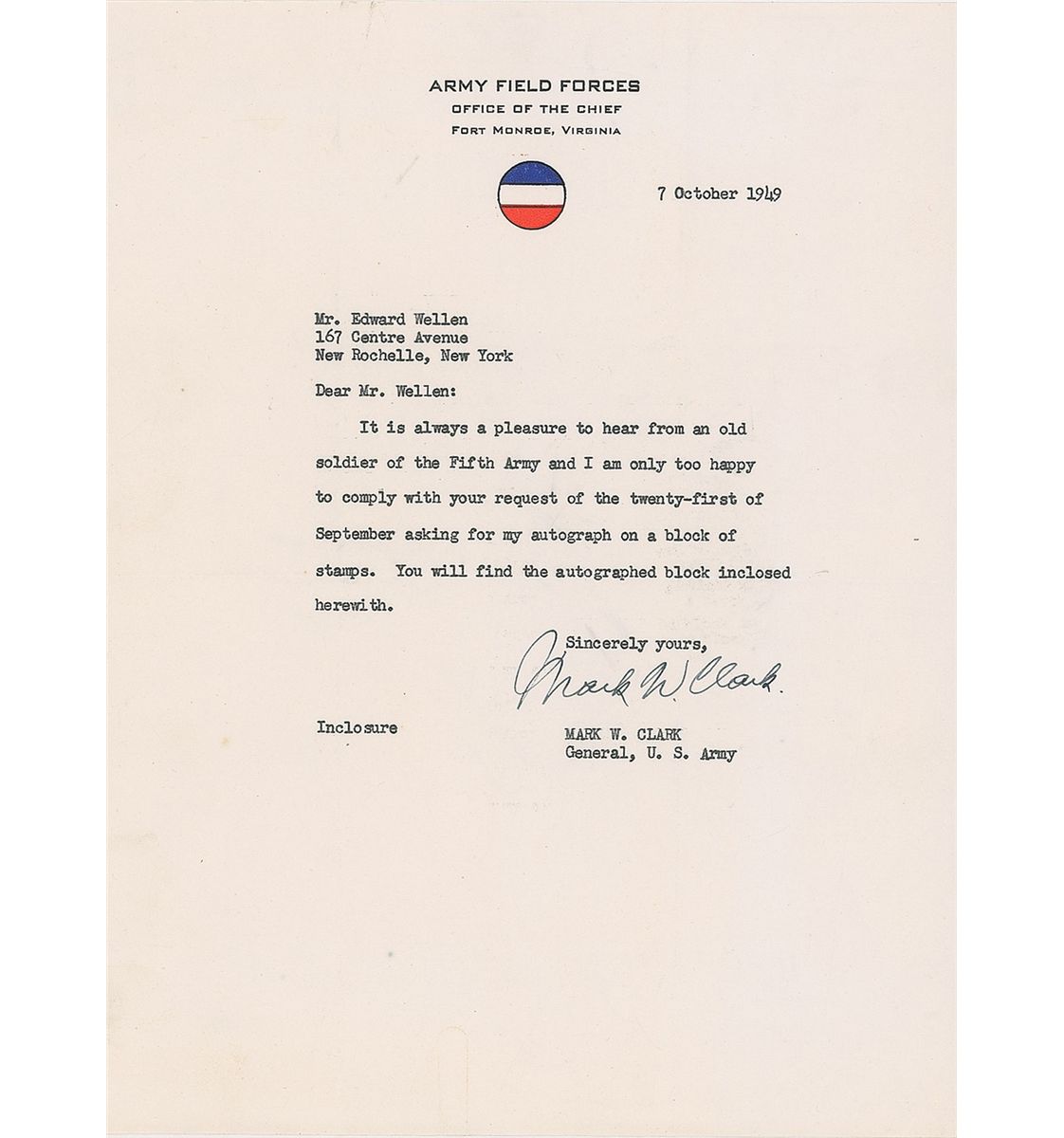 TLS, one page, 8 x 10.5, Army Field Forces letterhead, October 7, 1949. Letter to a collector. In part: “It is always a pleasure to hear from an old soldier of the Fifth Army and I am only too happy to comply with your request.” In fine condition, with intersecting folds, one through a single letter of signature.
