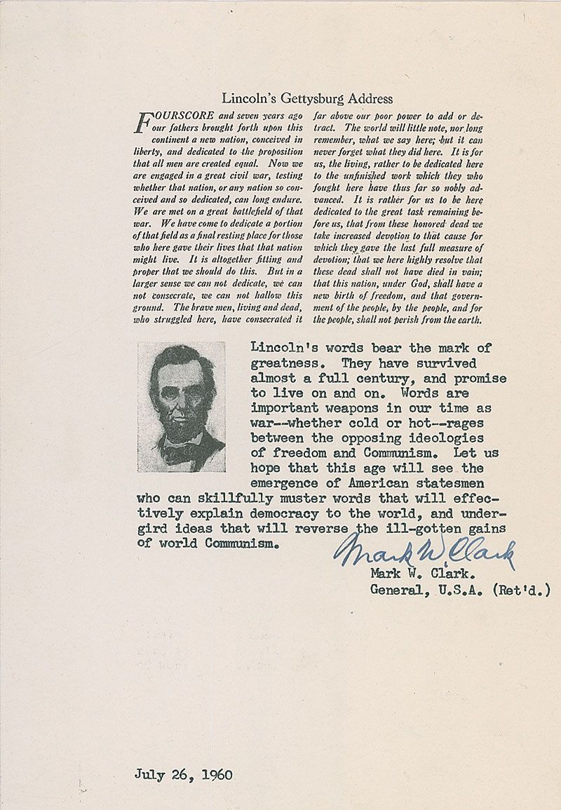 Typscript, one page, 6.25 x 9, July 26, 1960, consisting of the Gettysburg Address and Clark’s response to it, signed at the conclusion in fountain pen, “Mark W. Clark.” In part: “Lincoln’s words bear the mark of greatness. They have survived almost a full century, and promise to live on and on. Words are important weapons in our time as war—whether cold or hot—rages between opposing ideologies…Let us hope that this age will see the emergence of American statesmen who can skillfully muster words that will effectively explain democracy to the world.” In fine condition, with a central vertical fold.