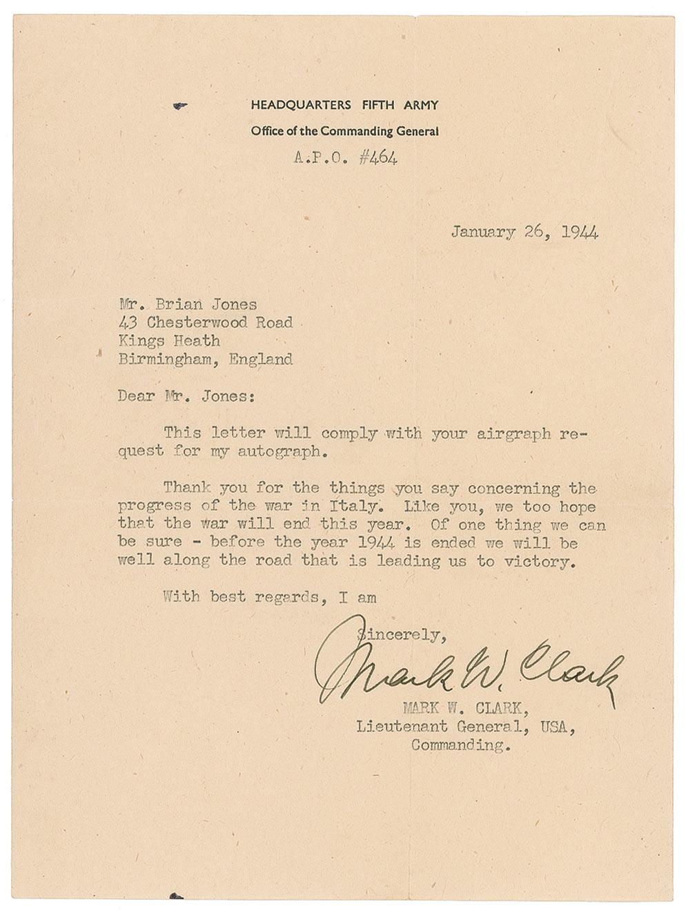 War-dated TLS, one page, 6 x 8, Headquarters Fifth Army letterhead, January 26, 1944. Letter to an admirer. In part: “Thank you for the things you say concerning the progress of the war in Italy. Like you, we too hope that the war will end this year. Of one thing we can be sure-before the year 1944 is ended we will be well along the road that is leading us to victory.” In fine condition, with intersecting folds, one through a single letter of signature, and a uniform shade of mild toning. Accompanied by the original mailing envelope.