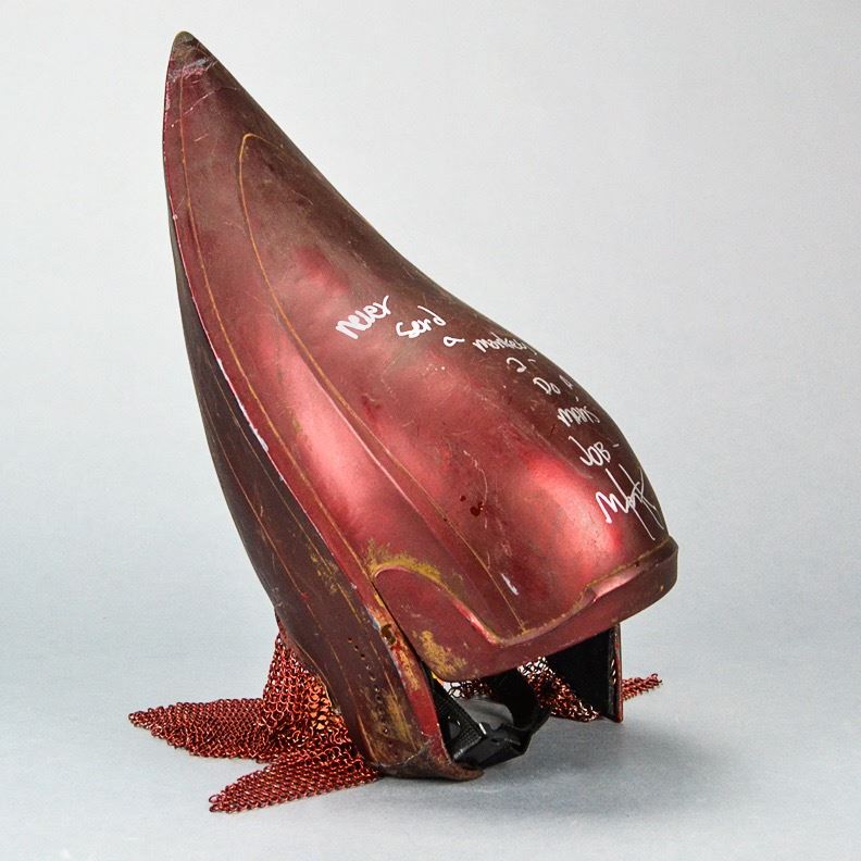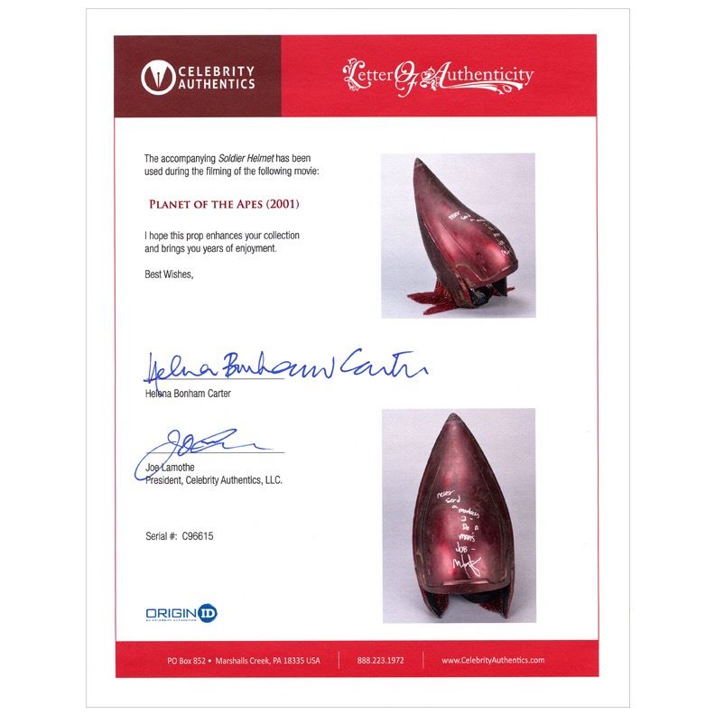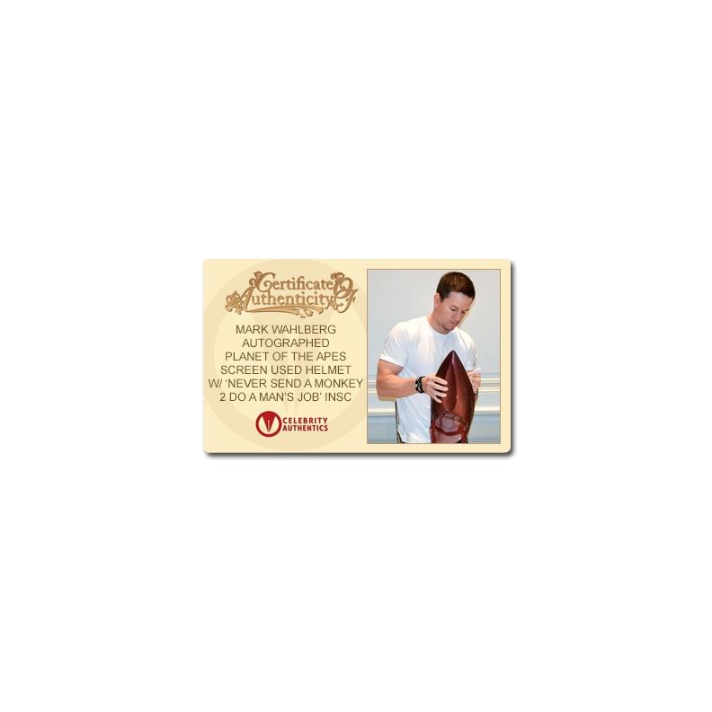 This Planet of the Apes Screen Used Solider Helmet has been personally hand-signed by Mark Wahlberg during his signing with Celebrity Authentics. A genuine film prop of this caliber were only made for gorillas closest to the camera! Ready for combat, this helmet is approximately 7" W x 16" L and shows incredible detail and screen use throughout with segmented areas, ridged throughout, and richly finished in shimmering burgundy. Equally impressive is the incredibly RARE inscription added by Mr. Wahlberg: "Never send a monkey 2 do a man's job." Helmet features black adjustable fastening chin strap, which makes it one size fits most, soft padded lining inside the helmet and metal chainmail netting on the back of the neck. Astronaut Leo Davidson (Mark Wahlberg) whips through space and time to a world where apes and gorillas rule the humans. Ships affixed with the Celebrity Authentics serial-numbered and tamper evident Authentication Hologram and includes a Celebrity Authentics Certificate of Authenticity featuring a picture of Mr. Wahlberg signing helmet. Additionally includes Celebrity Authentics Letter of Authenticity signed by Helena Bonham Carter verifying item's on screen use and provenance. This listing's featured images picture the exact item you will receive. A true gem for the finest Planet of the Apes collection!