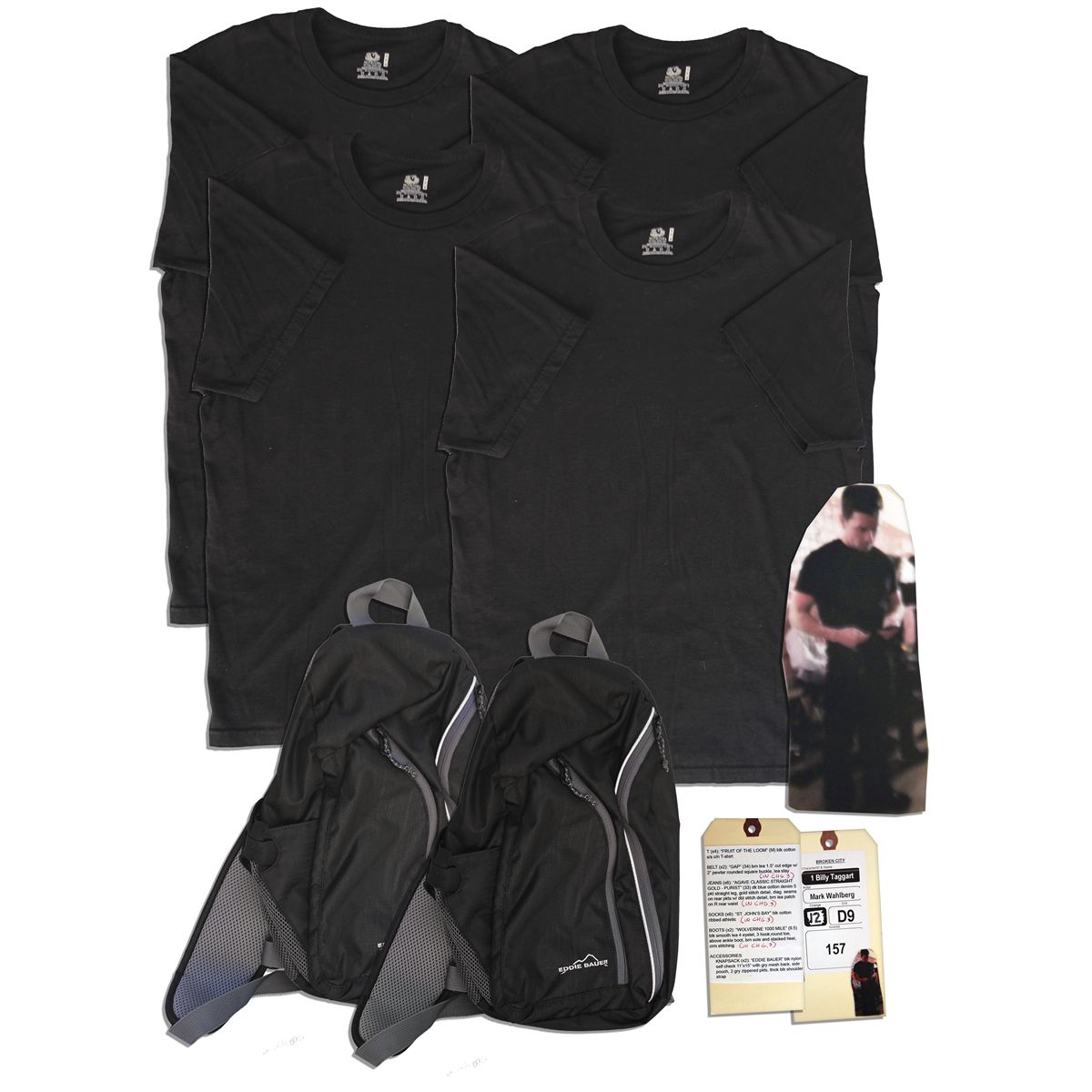 Mark Wahlberg worn hero wardrobe from ''Broken City''. Wahlberg was dressed in these black t-shirts and knapsack in the final scene of the thriller. Lot includes 4 identical shirts by Fruit of the Loom in size M and 2 identical Eddie Bauer knapsacks in black nylon with grey mesh backing, measuring 11'' x 15''. Near fine. With wardrobe tag featuring a color photo of Wahlberg wearing the shirt on set. With a COA from Premiere Props.