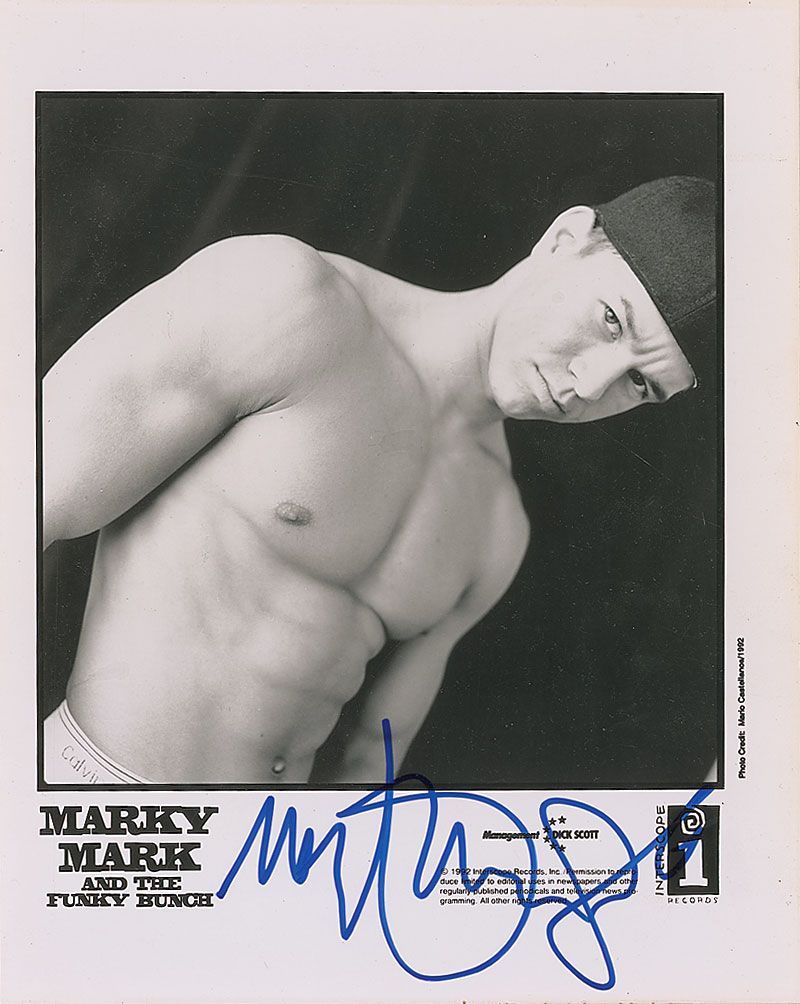 Glossy 8 x 10 publicity photo of Wahlberg from his time with the Funky Bunch, signed in person in blue felt tip. In fine condition, with trivial toning to borders. Originally obtained by in-person specialist Mike Wehrmann.