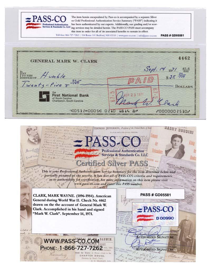 MARK WAYNE CLARK (1896-1984) American General during World War II. Clark’s personal check #4462 accomplished in Clark’s hand and Signed “Mark W. Clark.” September 14, 1971. Stamp cancellation affects Clark’s signature. Overall Extremely Fine. This item has been encapsulated by PASS-CO, LLC and is accompanied by a Certified Silver PASS.