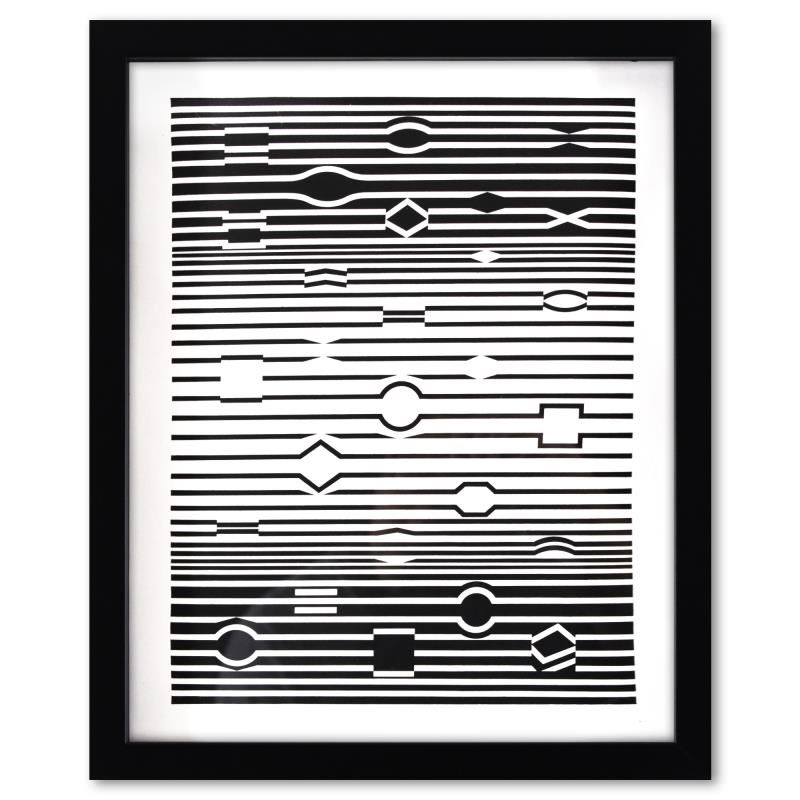 Markab de la serie Ondulatoires by Vasarely (1908-1997). "Markab de la série Ondulatoires" is a heliogravure print on paper, published in 1973, by Victor Vasarely (1908-1997). This piece comes custom framed, with a letter of authenticity and with a 1976 Vasarely paperback. Measures approx. 12.5" x 15" (frame), 10" x 13" (image).