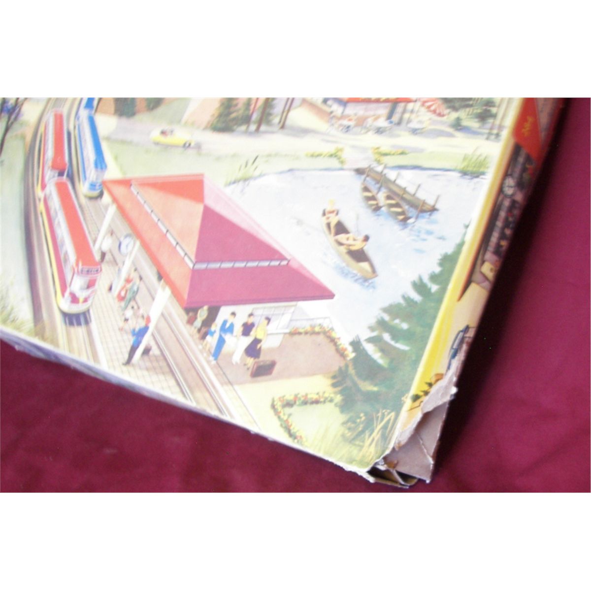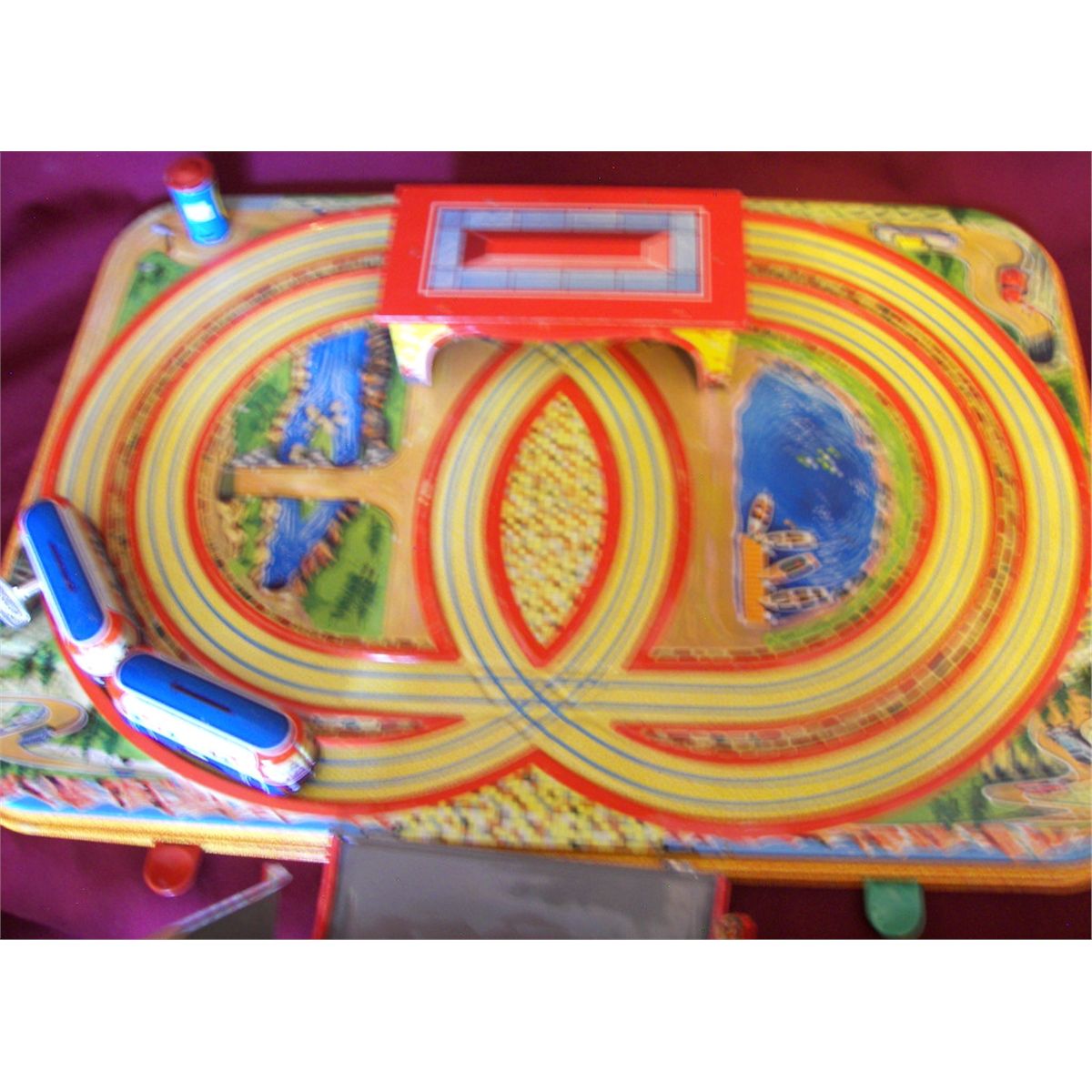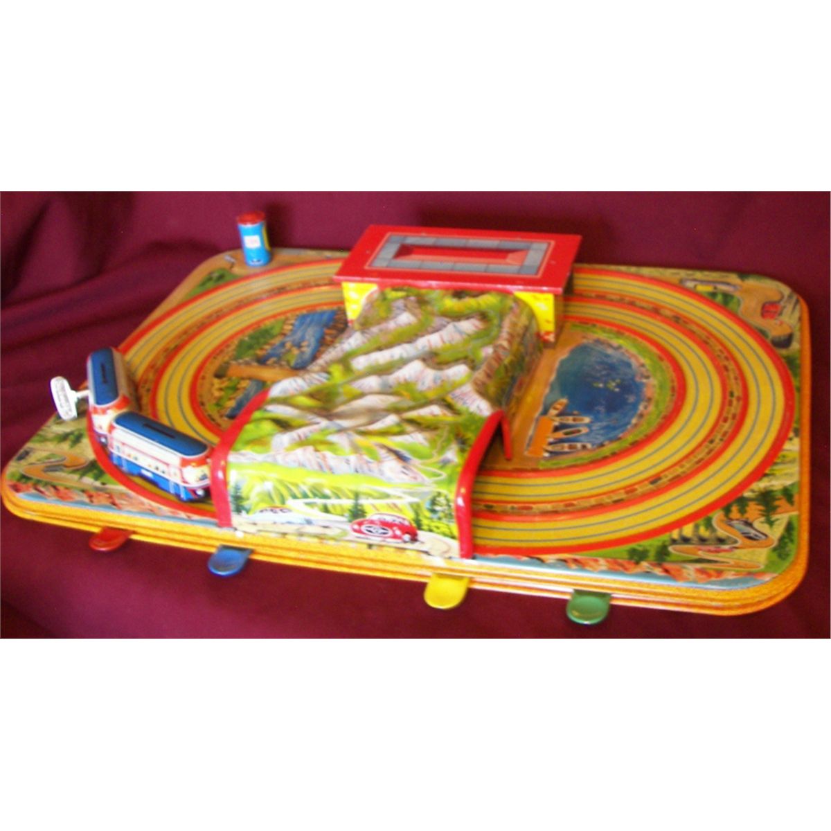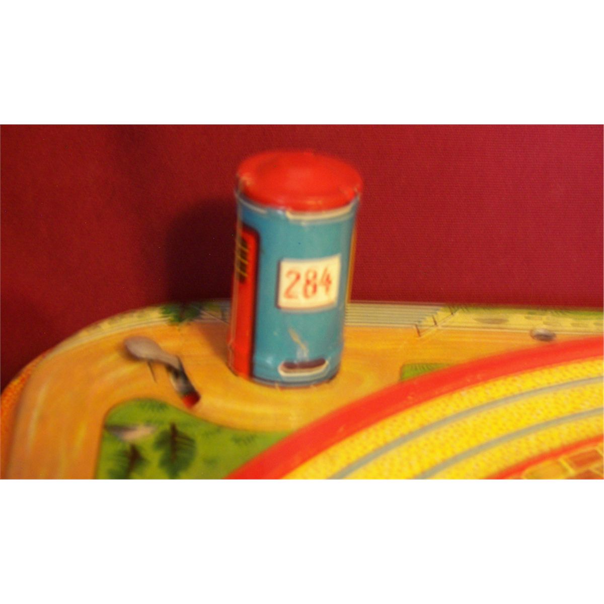 Marke Technofix 284 Tin Litho Toy Racetrack with One Pair of Buses with Key and Orginal Box, Box Has Two Torn and Missing Portions of the Edges, Top of Box is Intact with Minor Corner Damage, The Two Buses are not Linked Together as the Linking as the Linking Devise is Damaged, Estimate: $50- $100