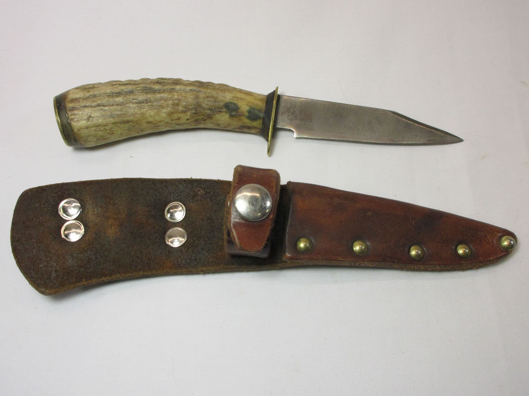 Marked AJS Antler Handled Knife- Engraved= 3.75" Blade- 4" Handle- Sheath