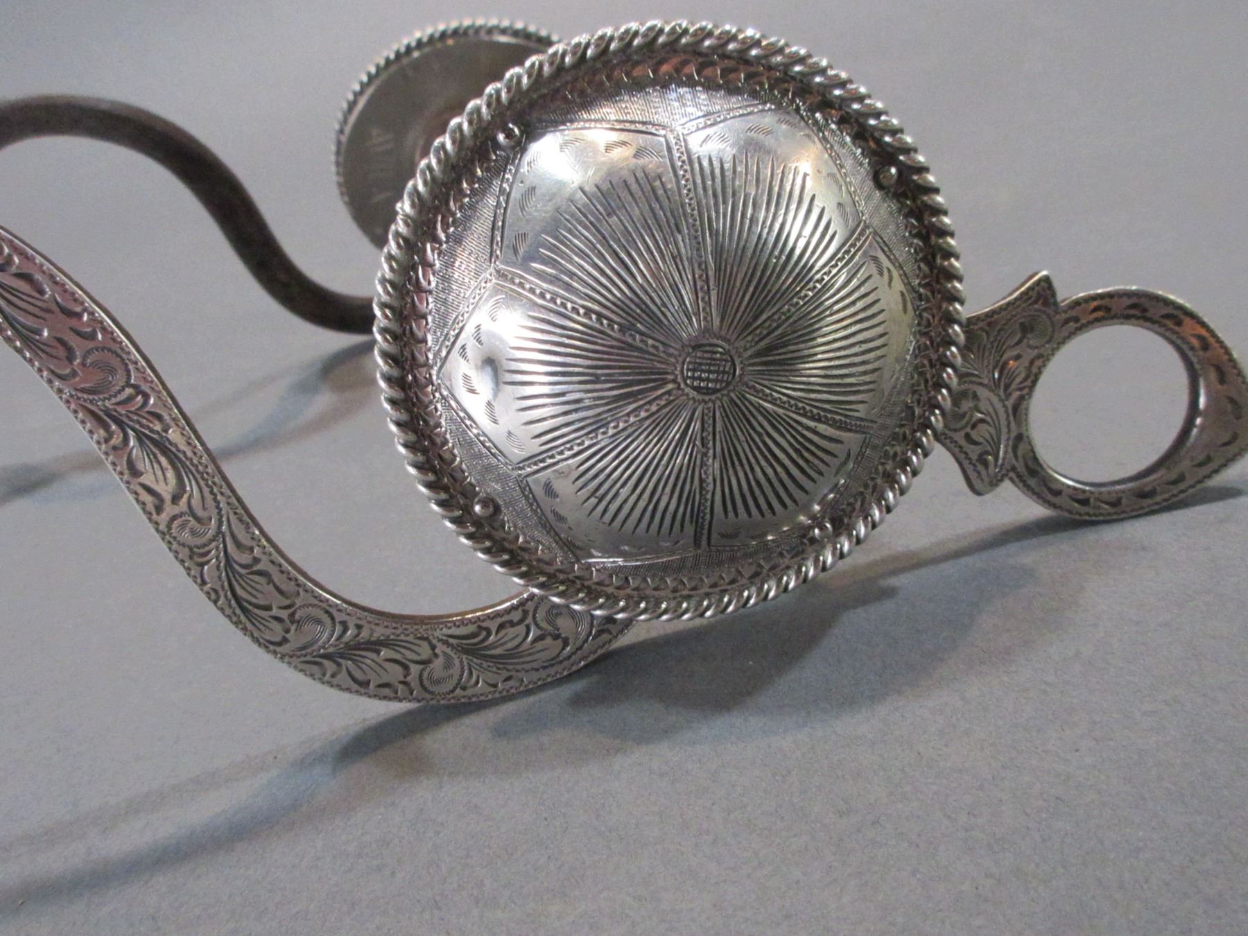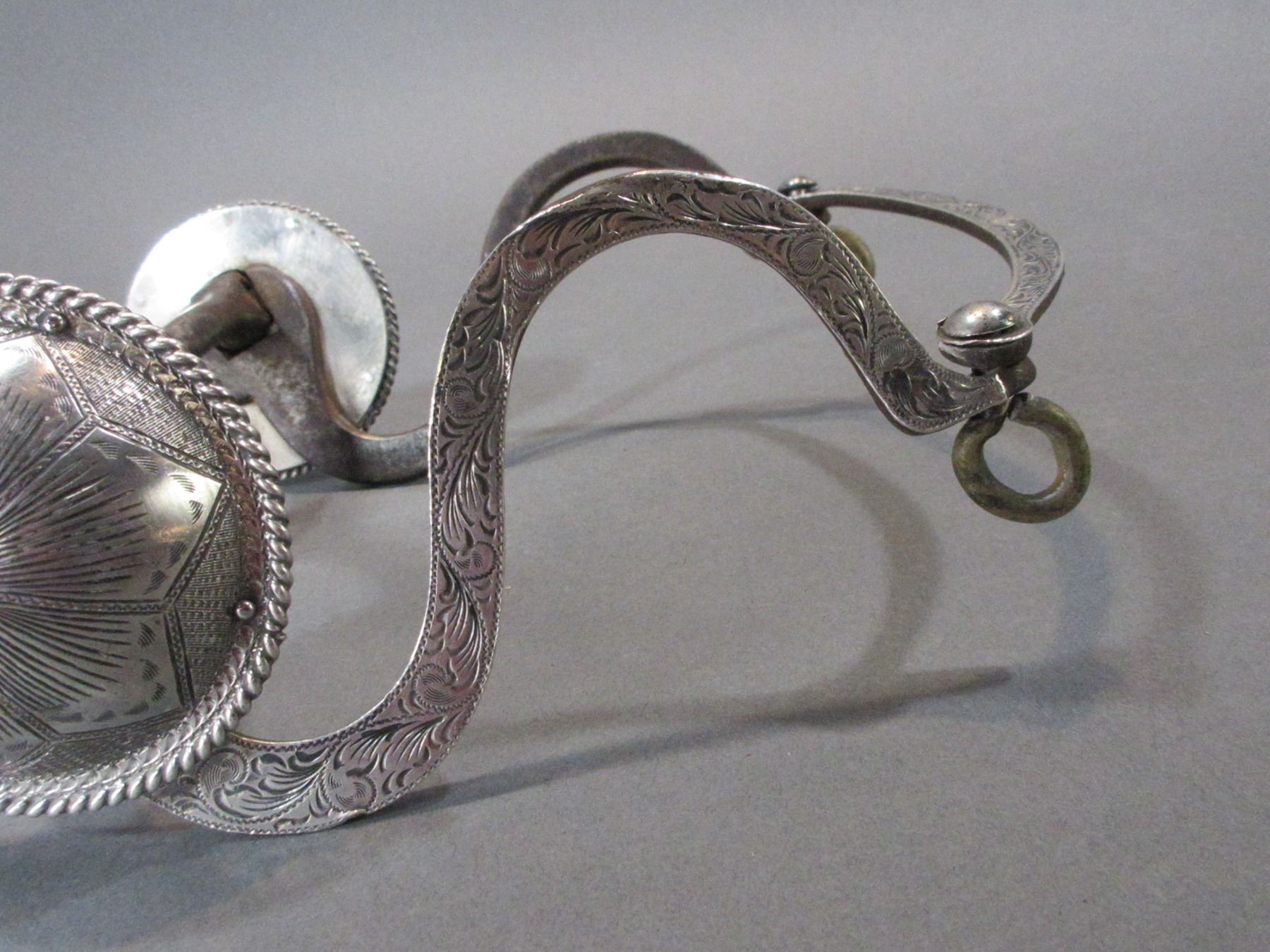 Marked Avila Silver Overlaid Bit- Martinez Cheek- Hooded Halfbreed Mouth- Slobber Bar- 3" Roped Edged Domed Engraved Silver Conchos- Rein Chain Swivels- Very Good Condition
