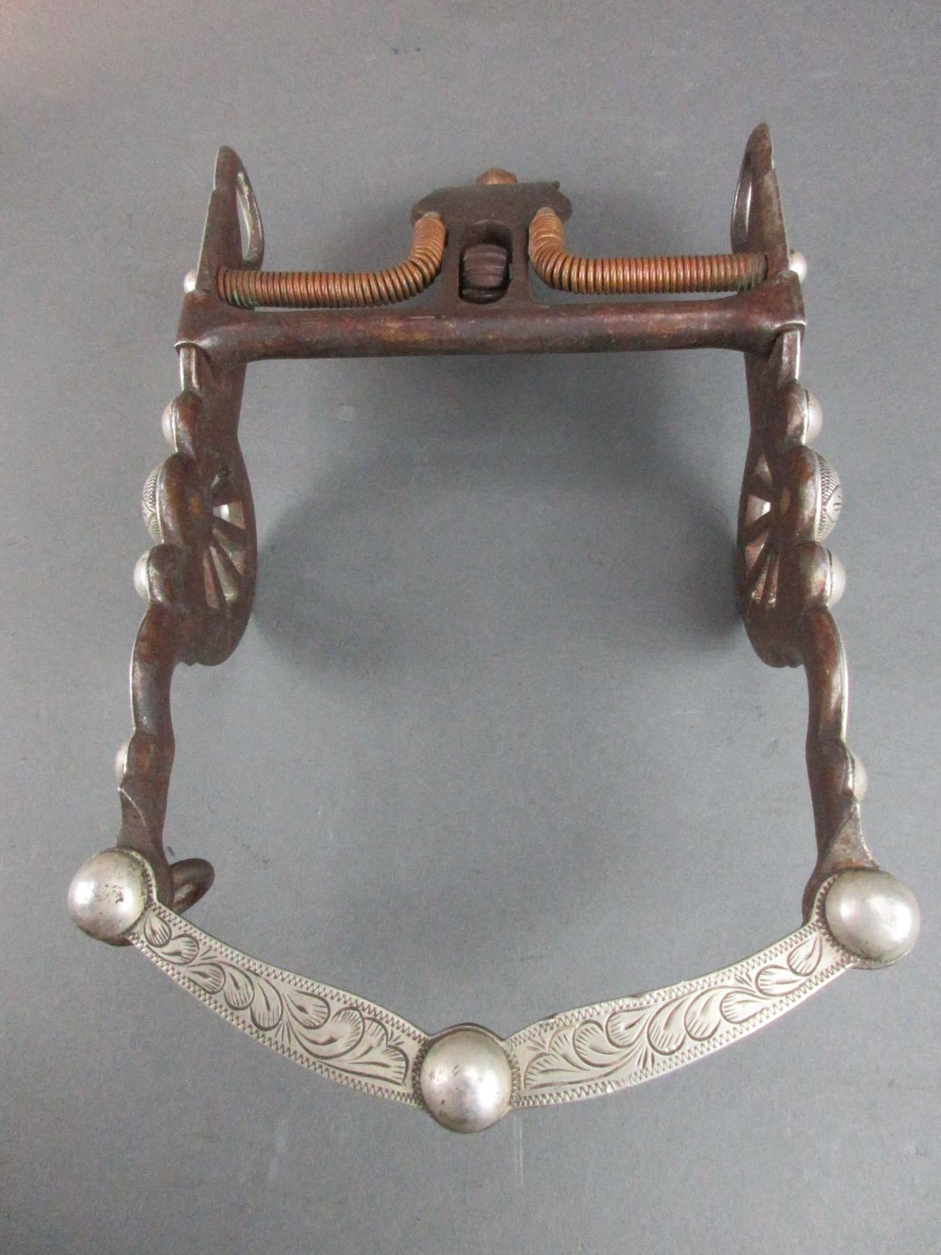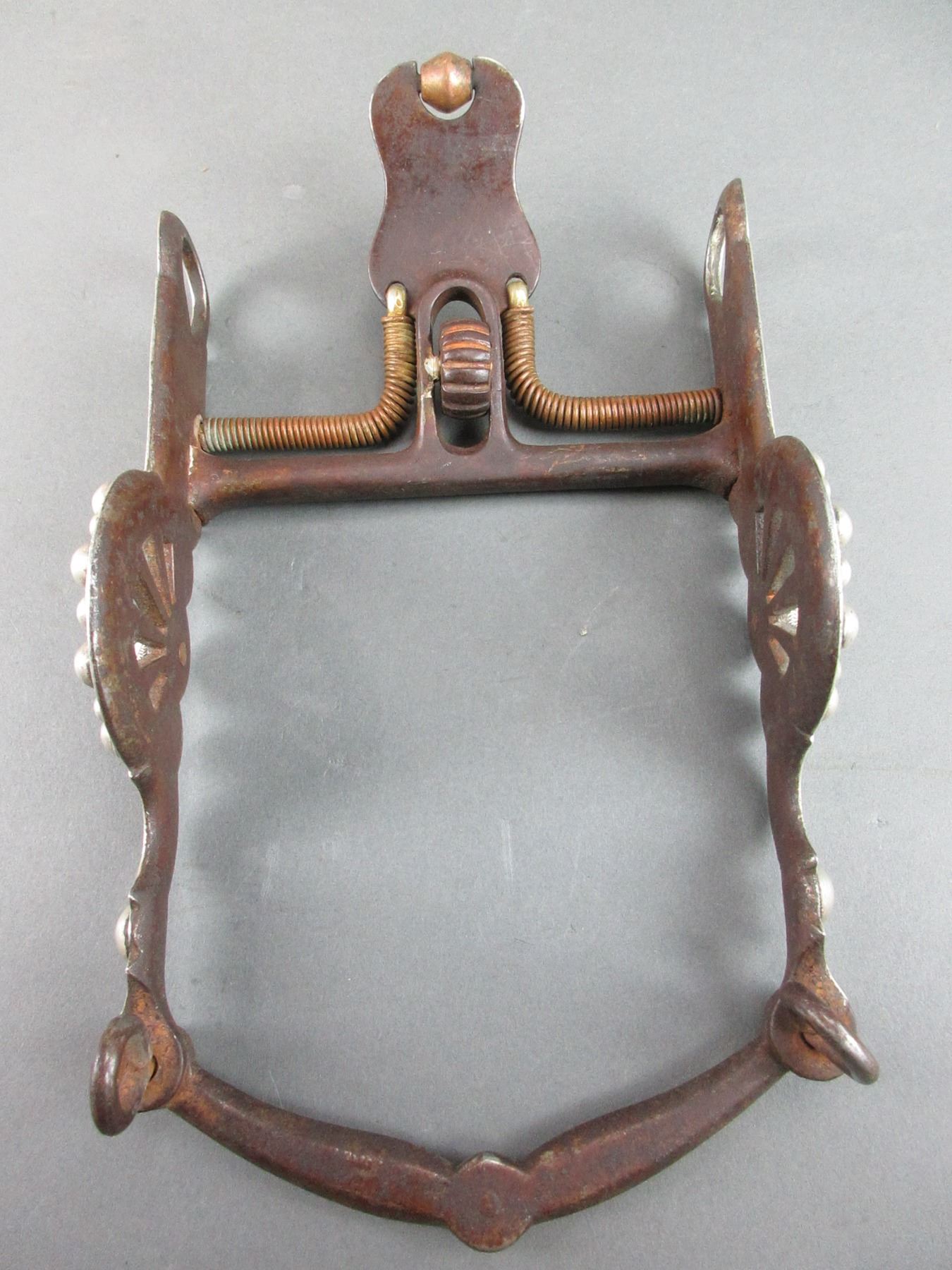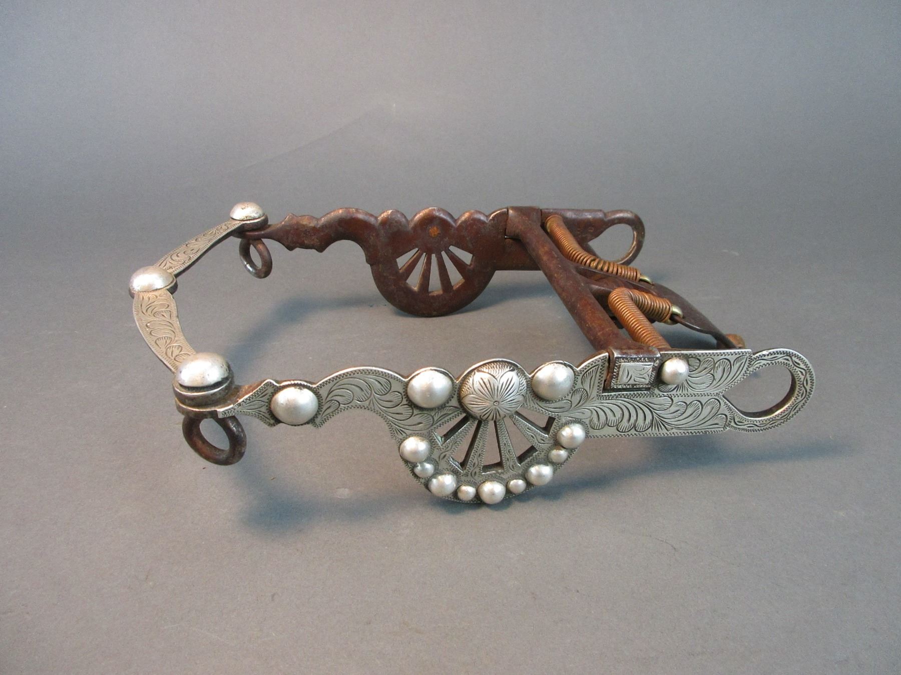 Marked B-C Mexico Silver Overlaid Bit- Santa Barbara Cheek- Spanish Spade Mouth- Slobber Bar- Rein Chain Swivels- Semi Loose Jaw- Good Condition