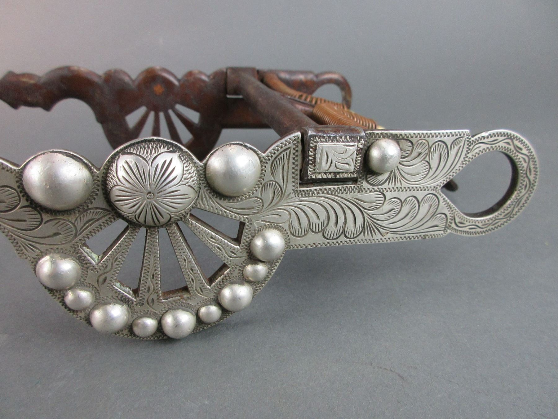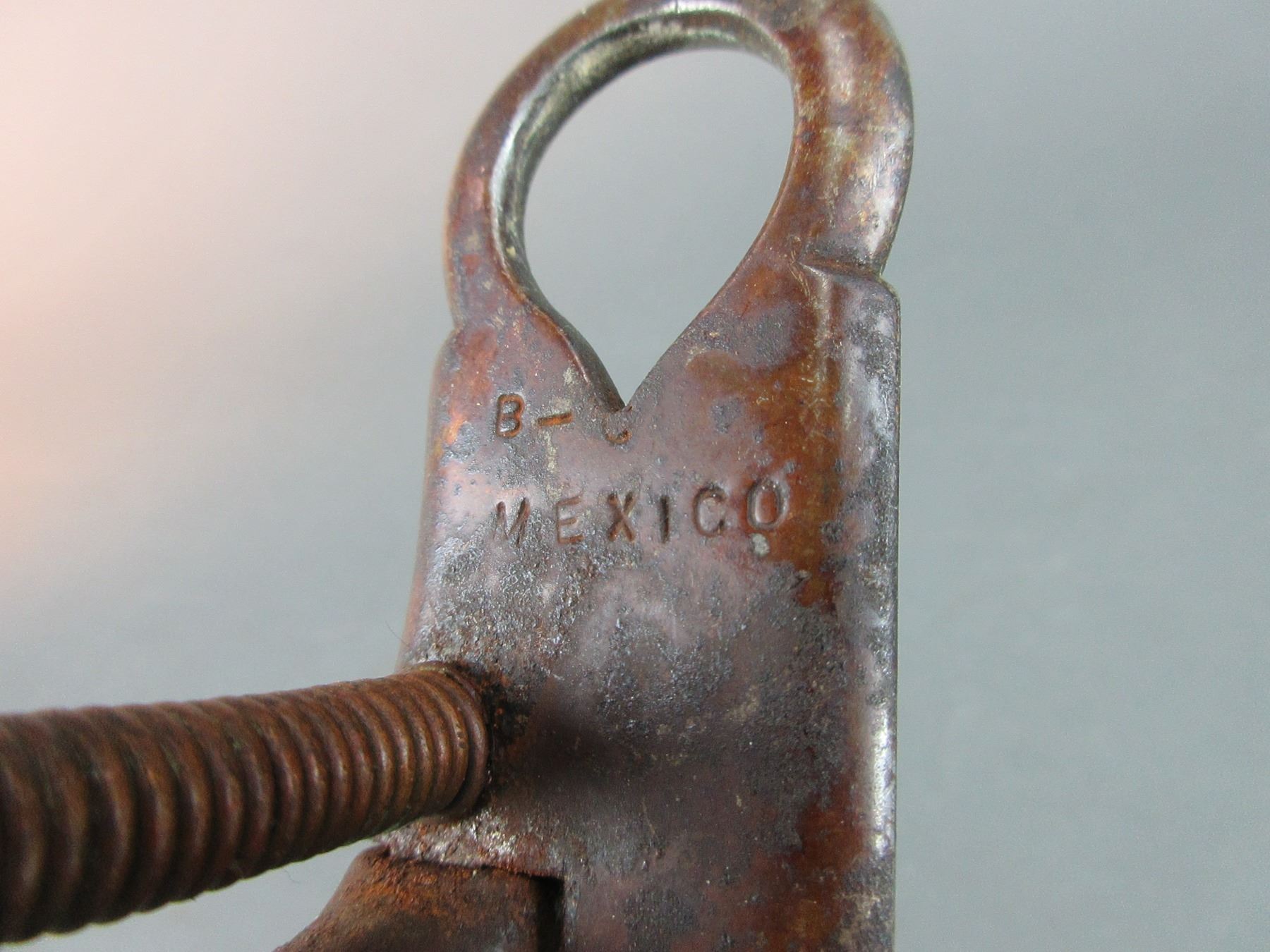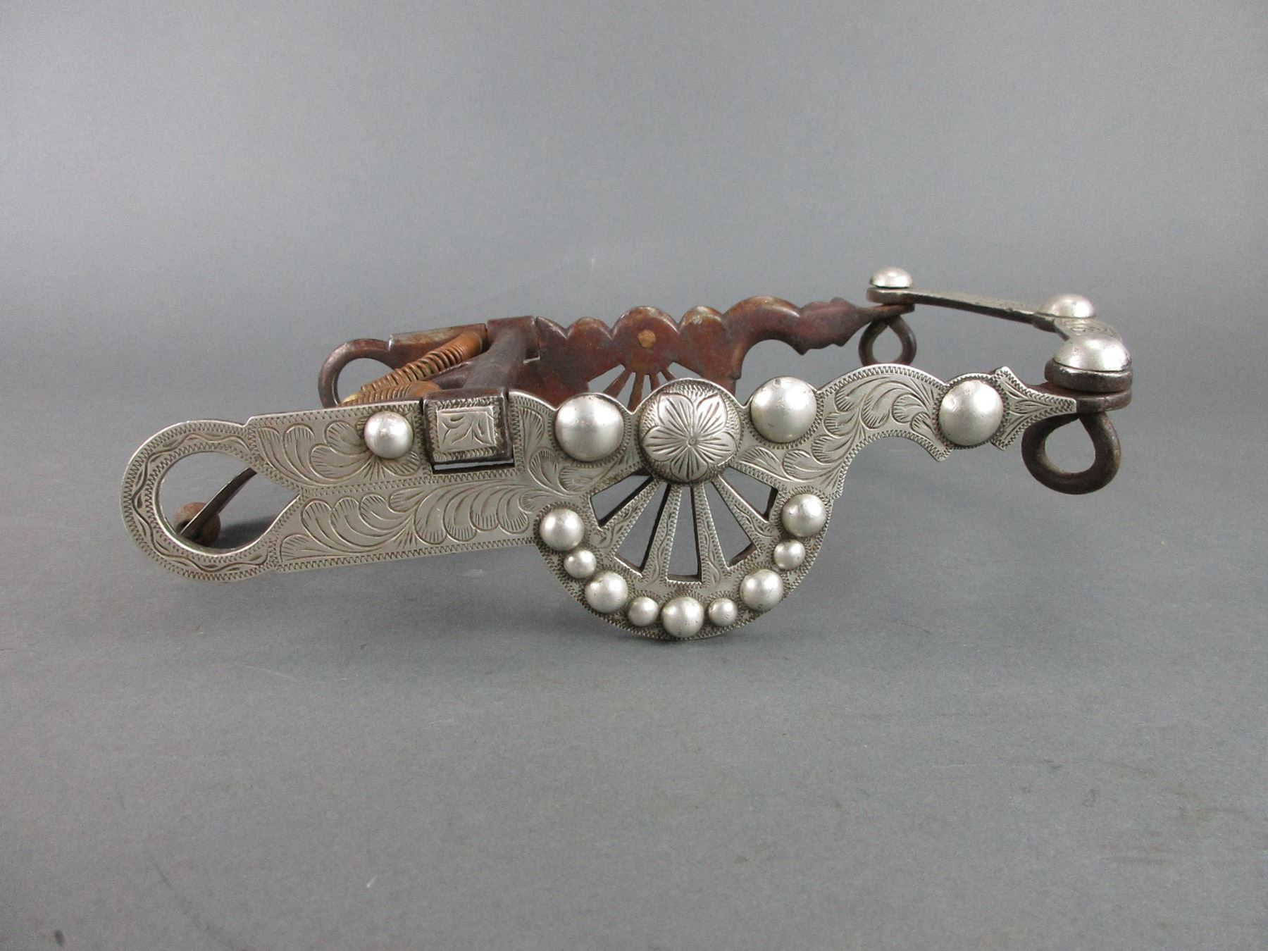 Marked B-C Mexico Silver Overlaid Bit- Santa Barbara Cheek- Spanish Spade Mouth- Slobber Bar- Rein Chain Swivels- Semi Loose Jaw- Good Condition