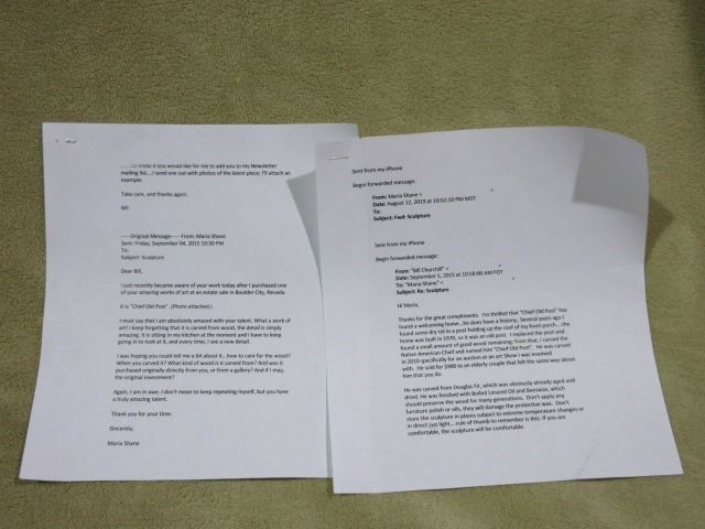 Marked "Chief Old Post" WM Churchill Jr Wooden Statue- Carved by Churchill from a an Old Post From His Porch- Carved in 2010 From Douglas Fir- Accompanying Letter- 9.5" W X 7.5"D X 24"H