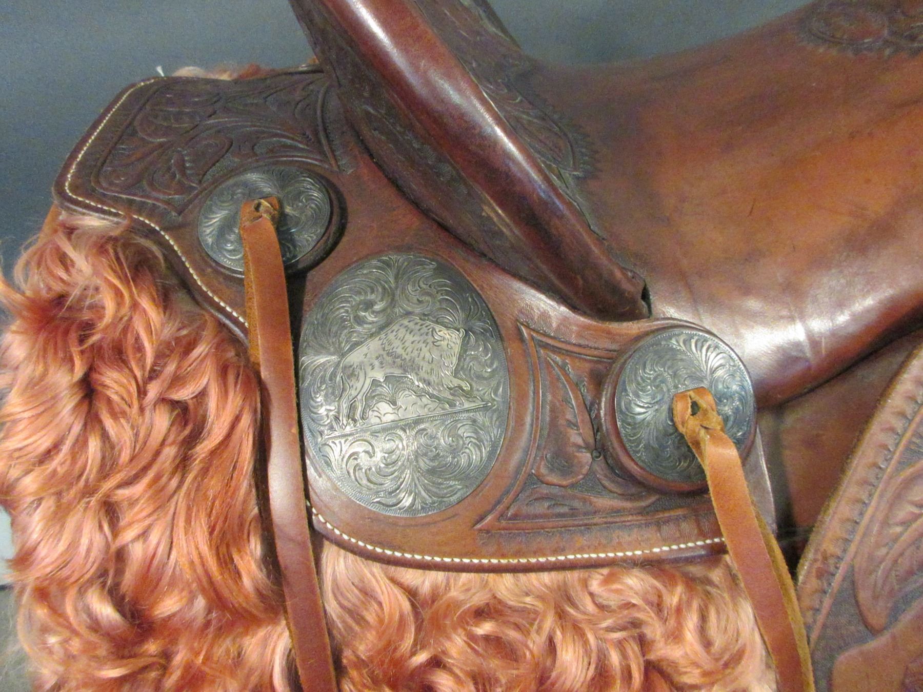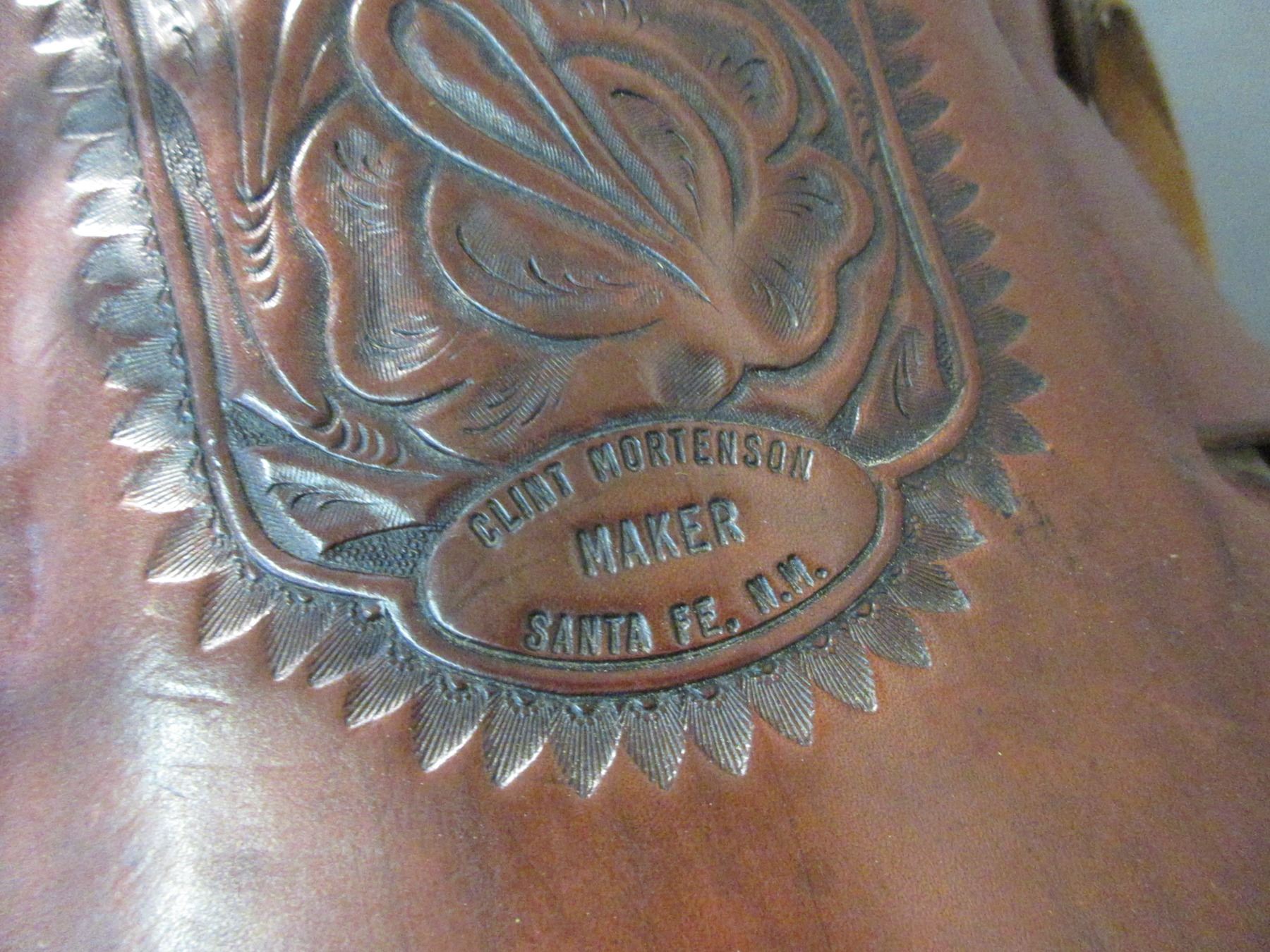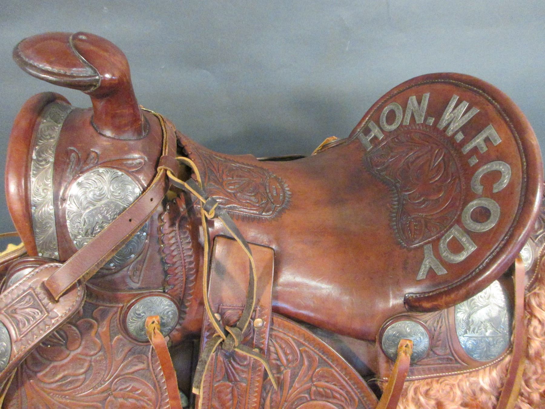Marked Clint Mortenson Maker Santa Fe NM Loop Seat Slick Fork Saddle- Fully Hand Carved- 15.5" Seat Marked HON W F CODY- Angora Skirt Covers- Lots Of Engraved Marked Sterling Overlaid Silver- Tooled Breast Collar With 10 2" Sterling Conchos- New Condition- Stand With Decorated Brands And Presidential Coins Sells With Saddle- Previously Sold At High Noon Auction