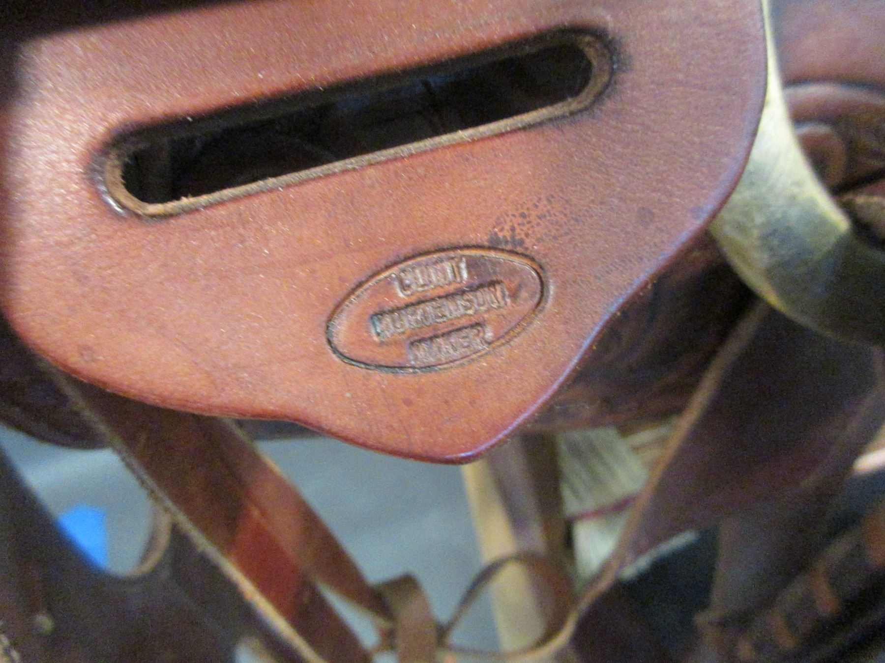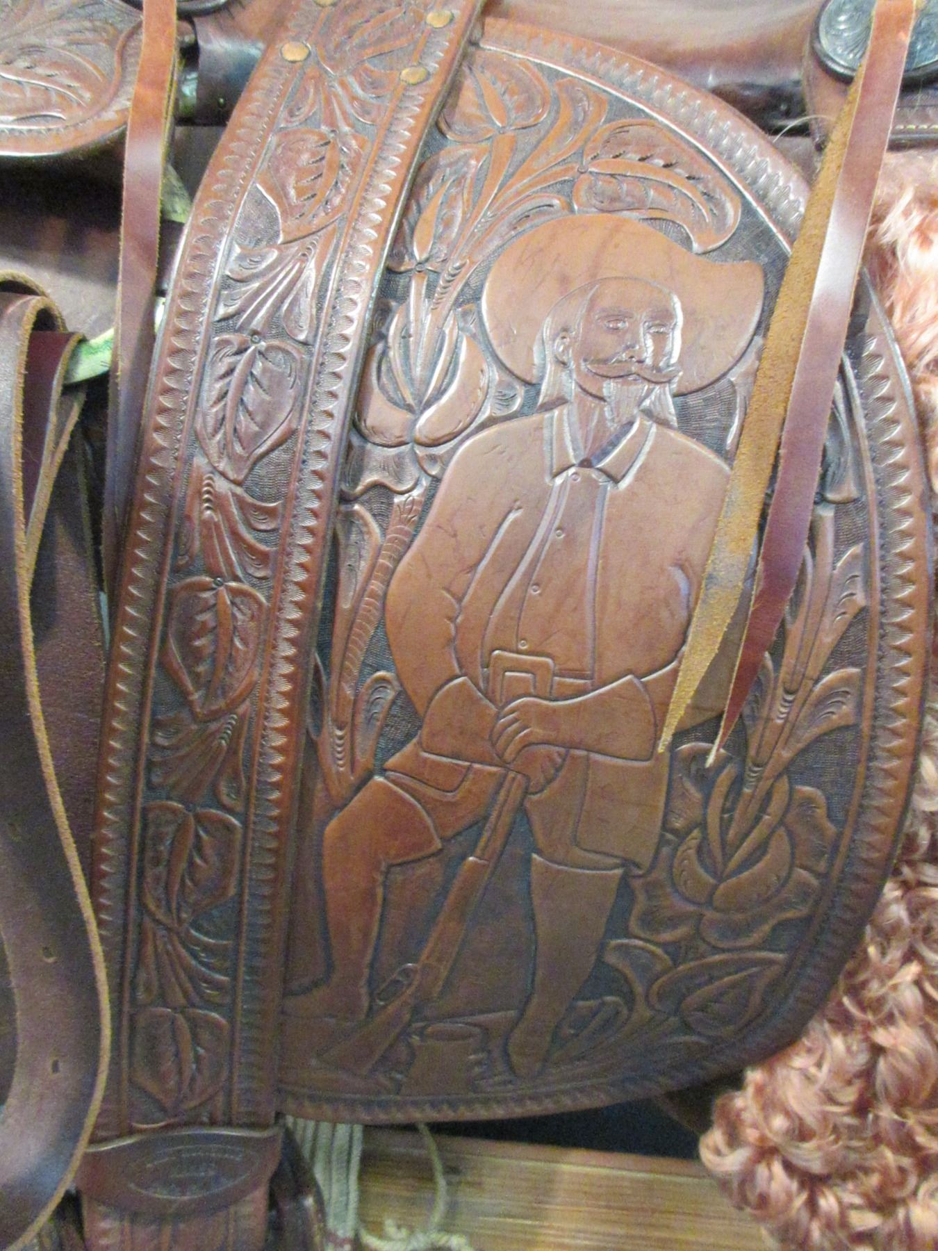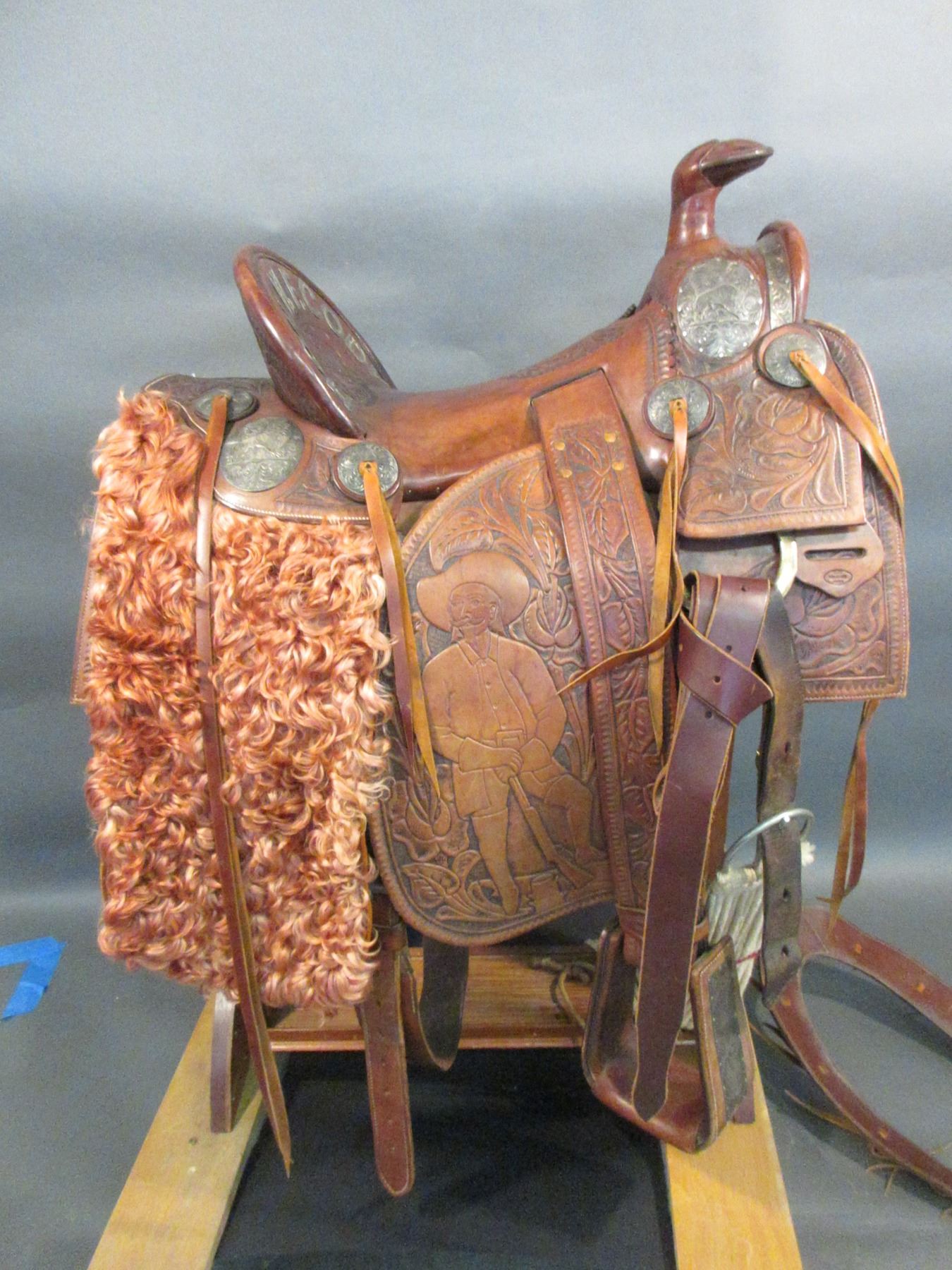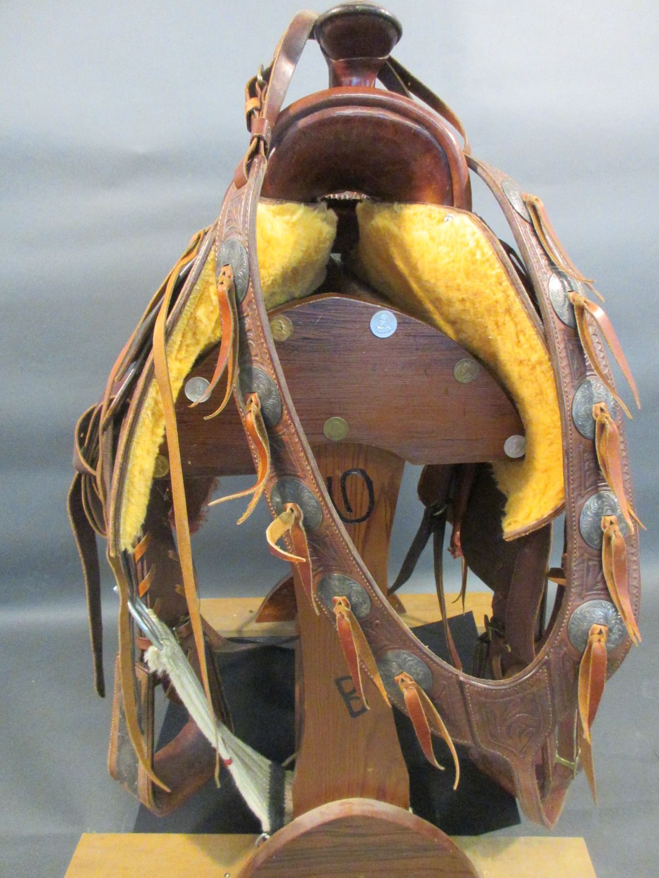 Marked Clint Mortenson Maker Santa Fe NM Loop Seat Slick Fork Saddle- Fully Hand Carved- 15.5" Seat Marked HON W F CODY- Angora Skirt Covers- Lots Of Engraved Marked Sterling Overlaid Silver- Tooled Breast Collar With 10 2" Sterling Conchos- New Condition- Stand With Decorated Brands And Presidential Coins Sells With Saddle- Previously Sold At High Noon Auction