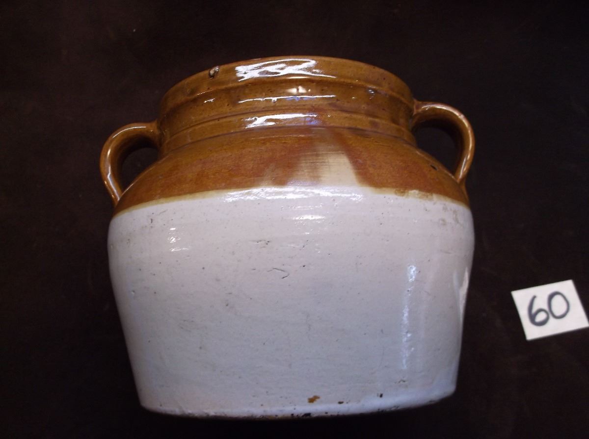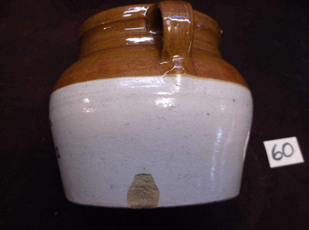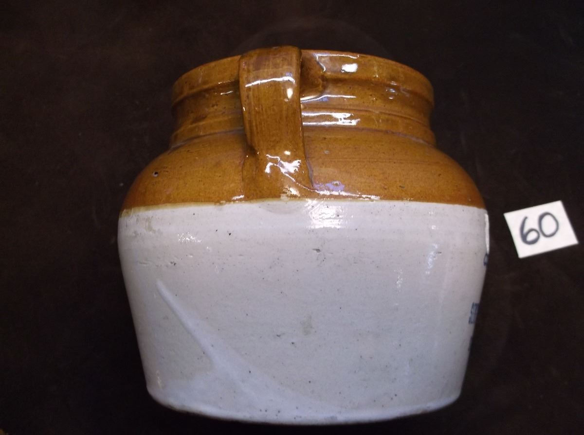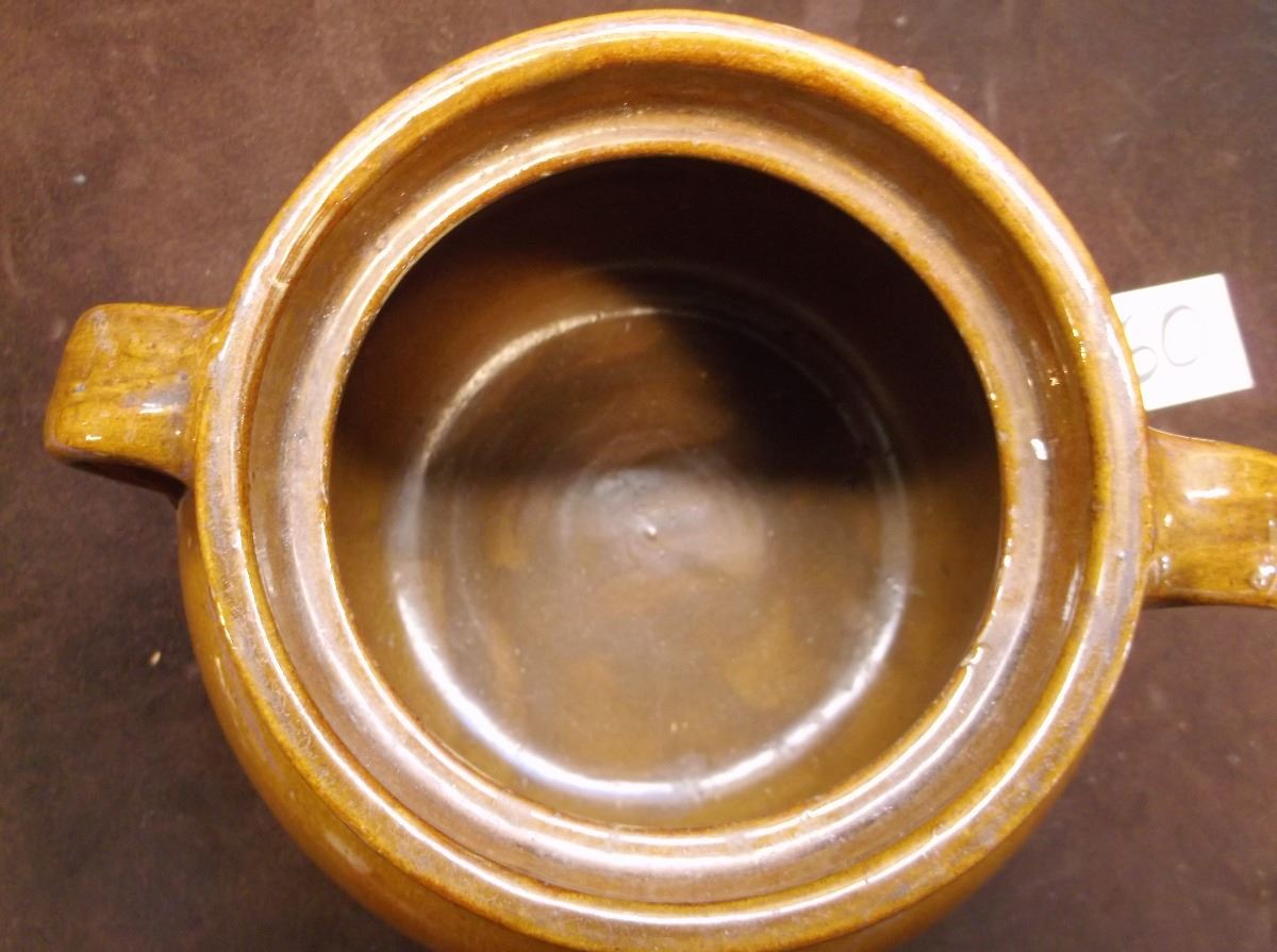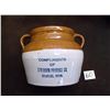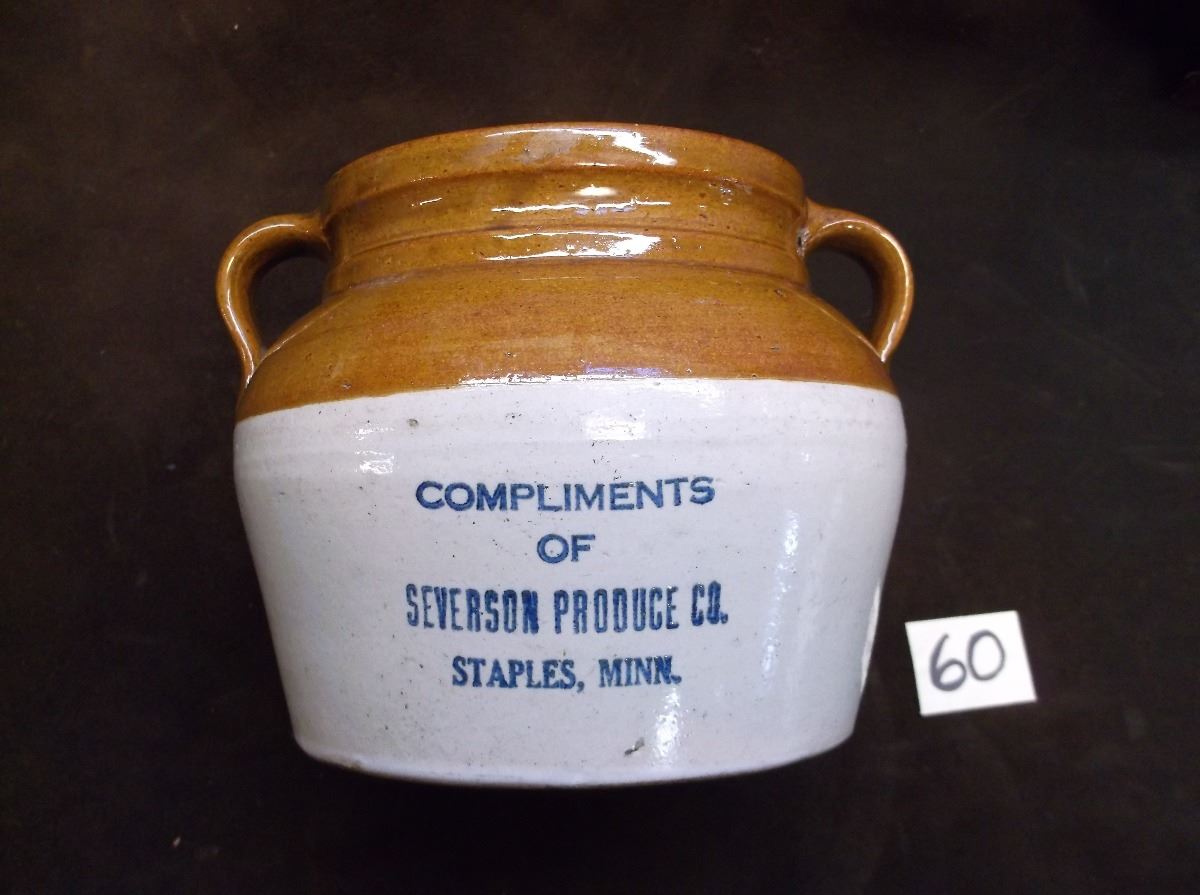 Marked Compliments of Severson Produce Co. Staples, Minn., Crock Bean Pot, Has Chip, 7”W x 6.5”H