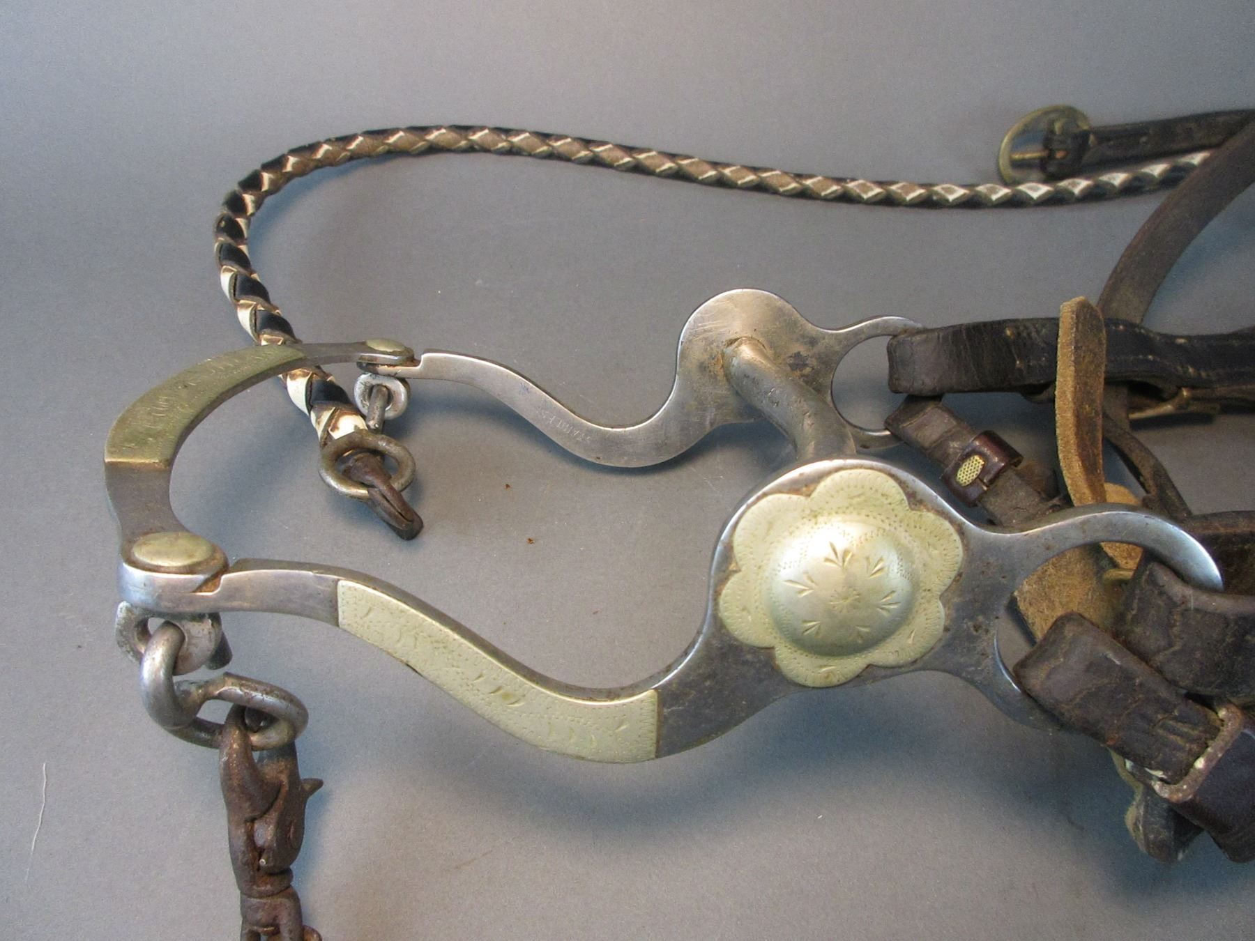 Marked Crockett Nickel Silver Overlaid Stainless Frontier Pattern Bit And Spurs- Martinez Cheek- Mullen Mouth- Slobber Bar- Old Repaired Dotted Headstall With Braided Leather Reins- .75" Bands- 2.25" Shanks- 16 Point Rowels- Tooled Straps