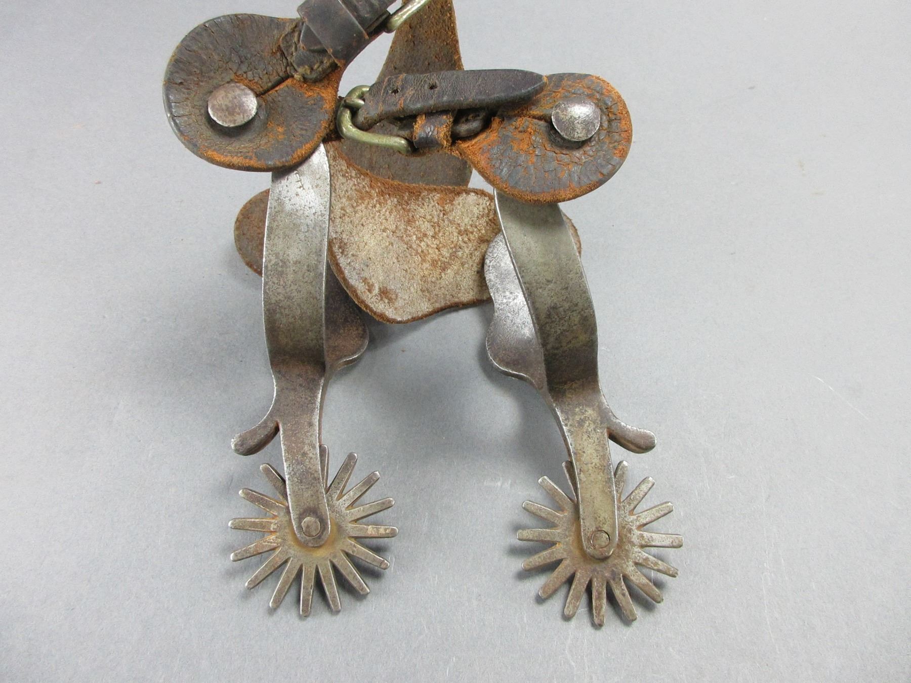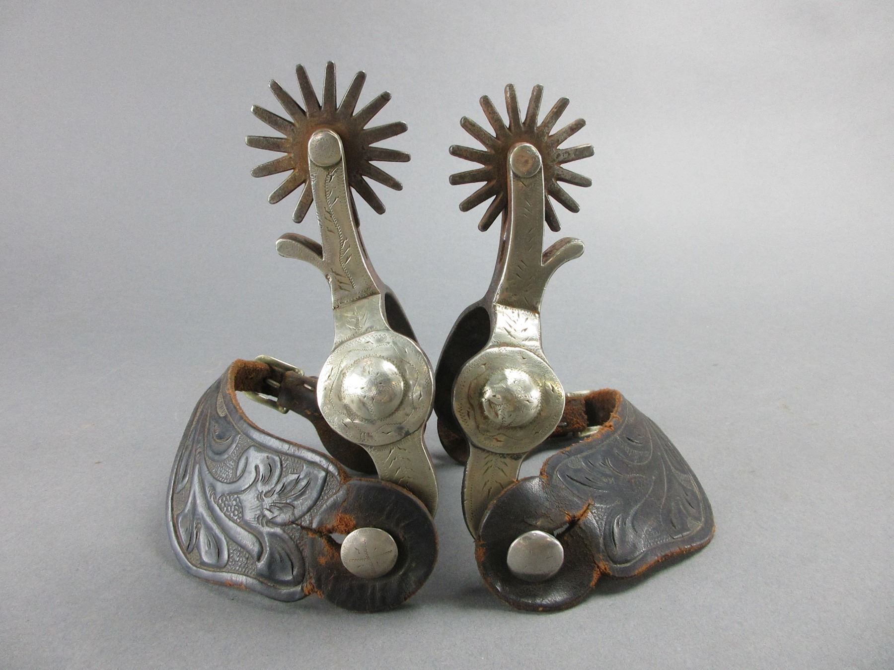 Marked Crockett Silver Overlaid Spurs- 1.5" Bands At The Widest- 2.3" Shanks- 16 Point Rowels- Chap Guards- Oak Leaf Tooled Straps- Fair Condition