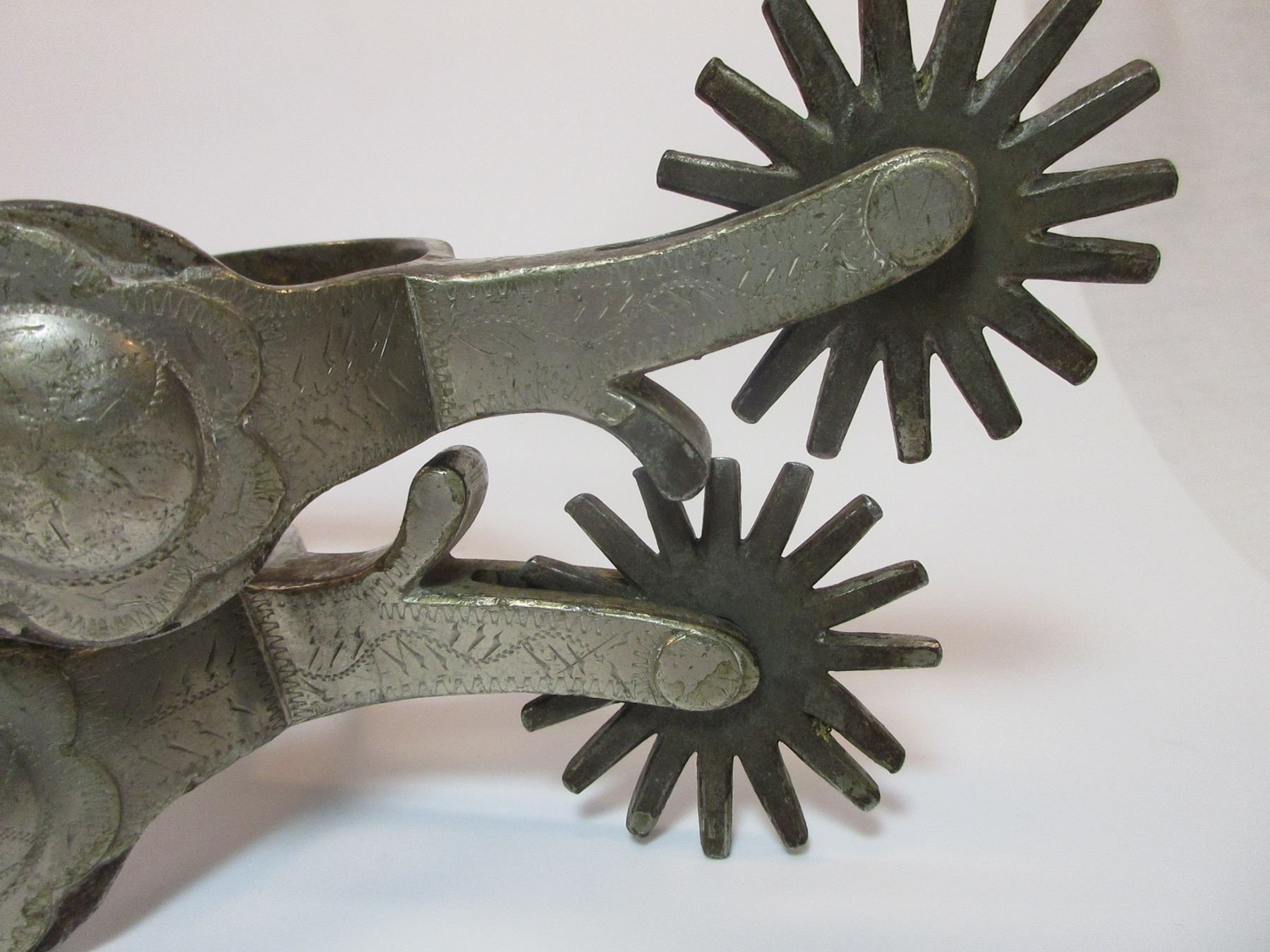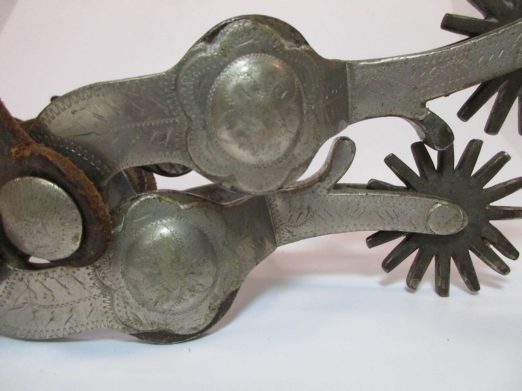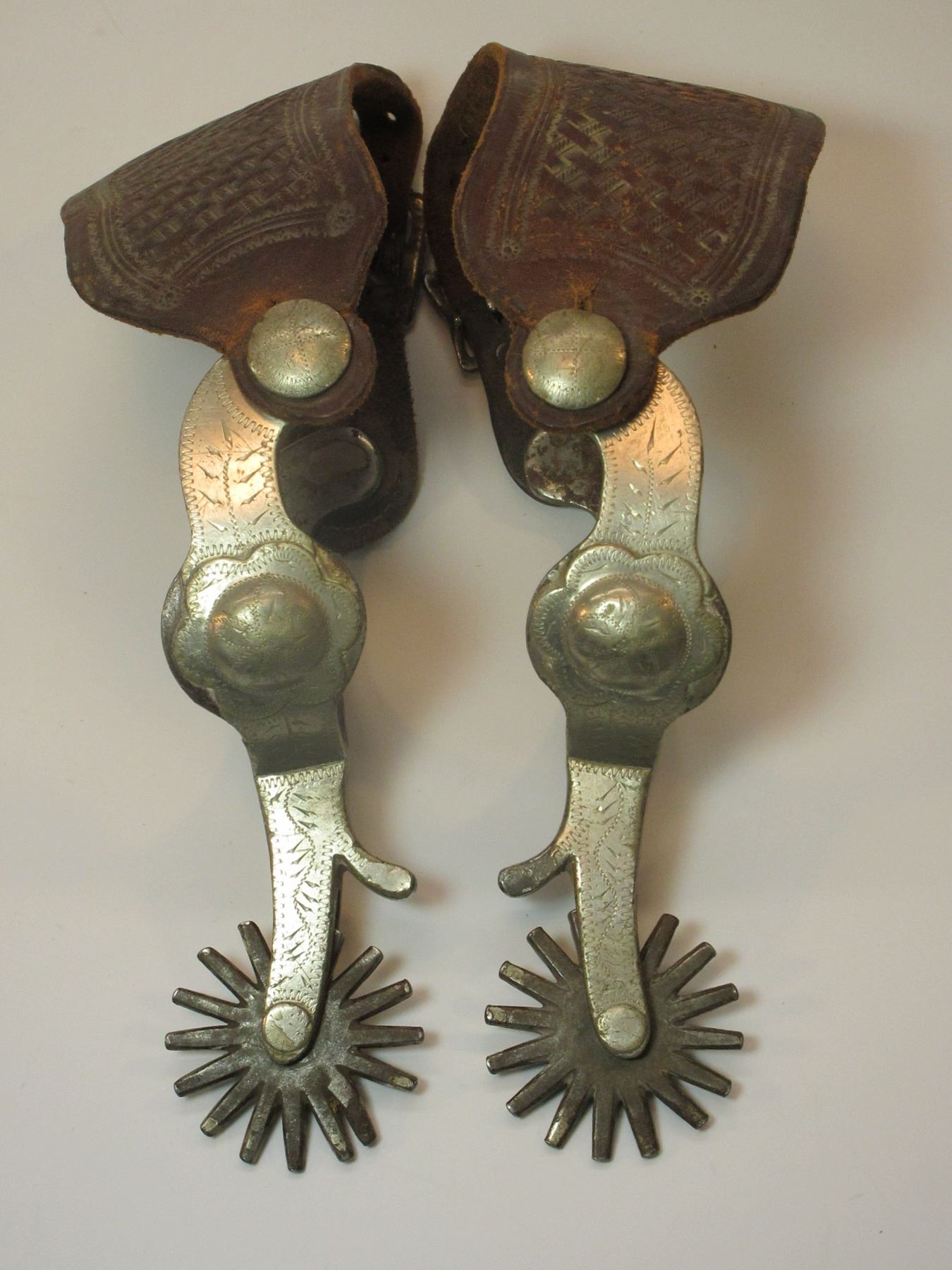 Marked Crockett Silver Overlaid Spurs- Frontier Pattern- 1.5" Bands- 2.25" Shanks- 16 Point Rowels- Small Piece of Silver Missing on 1 Chap Guard.