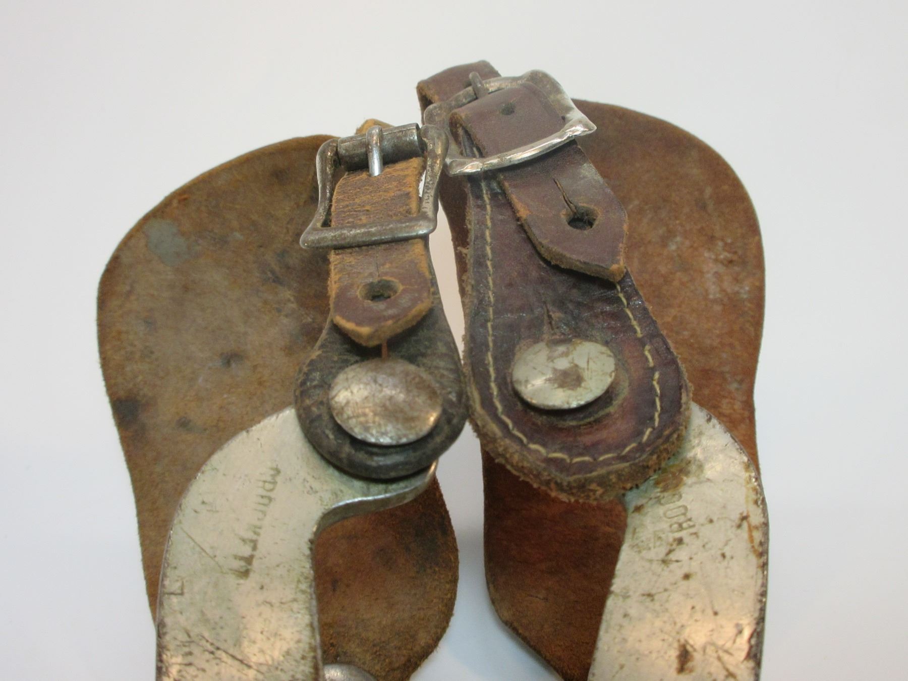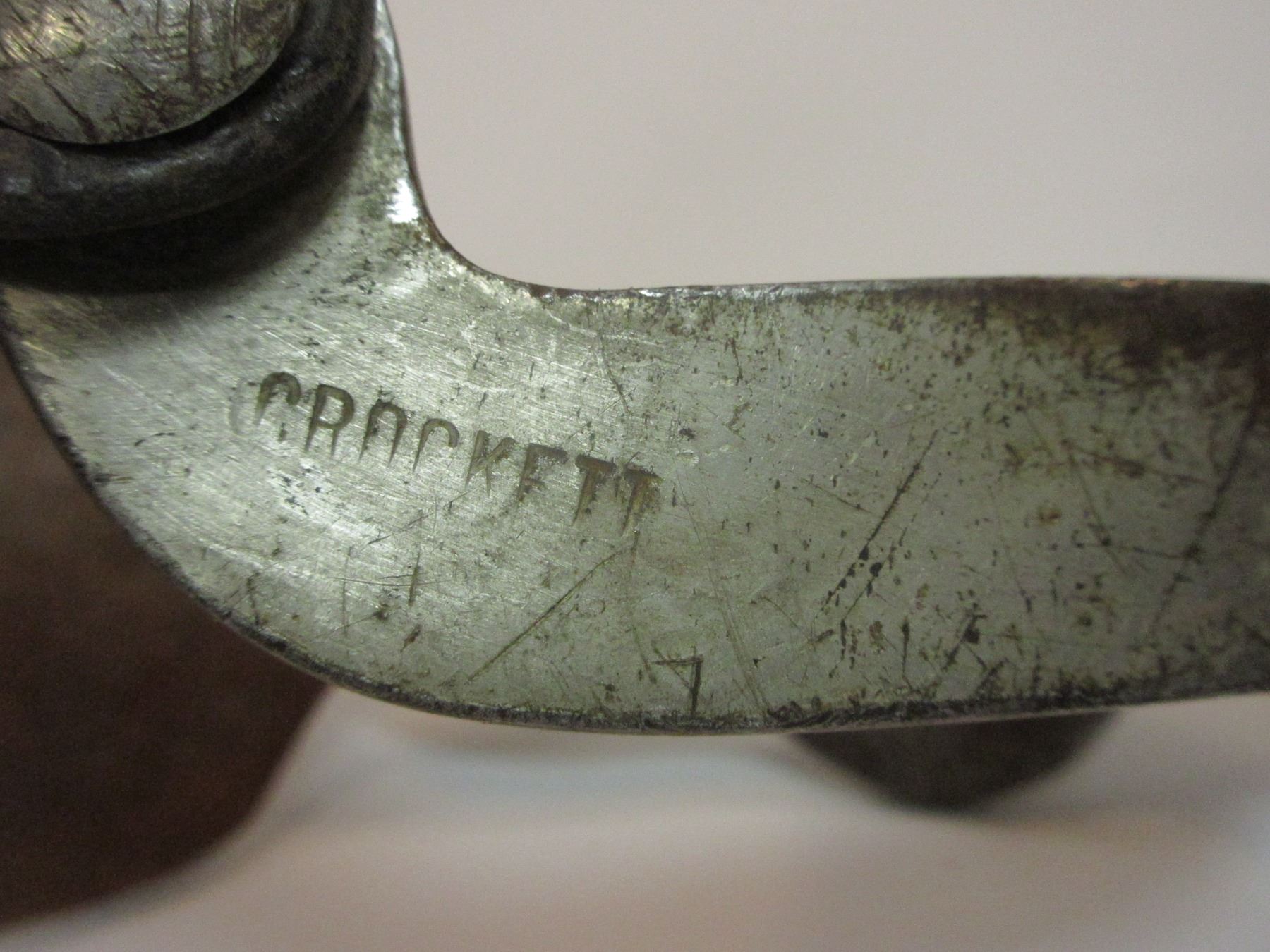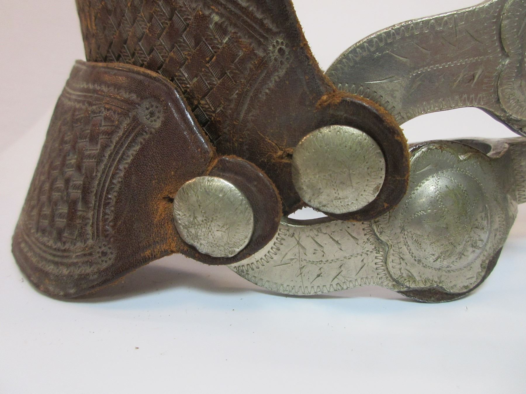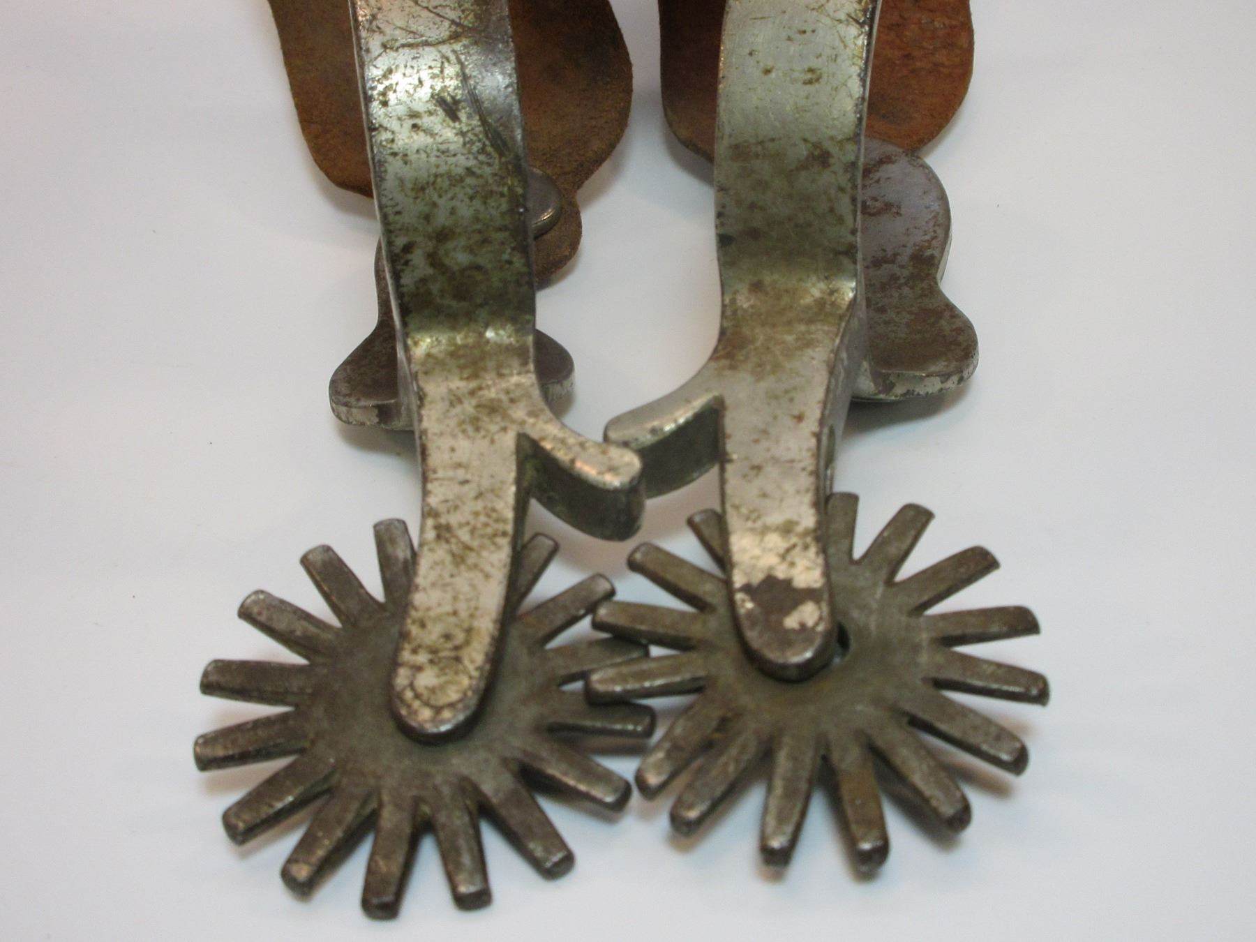 Marked Crockett Silver Overlaid Spurs- Frontier Pattern- 1.5" Bands- 2.25" Shanks- 16 Point Rowels- Small Piece of Silver Missing on 1 Chap Guard.