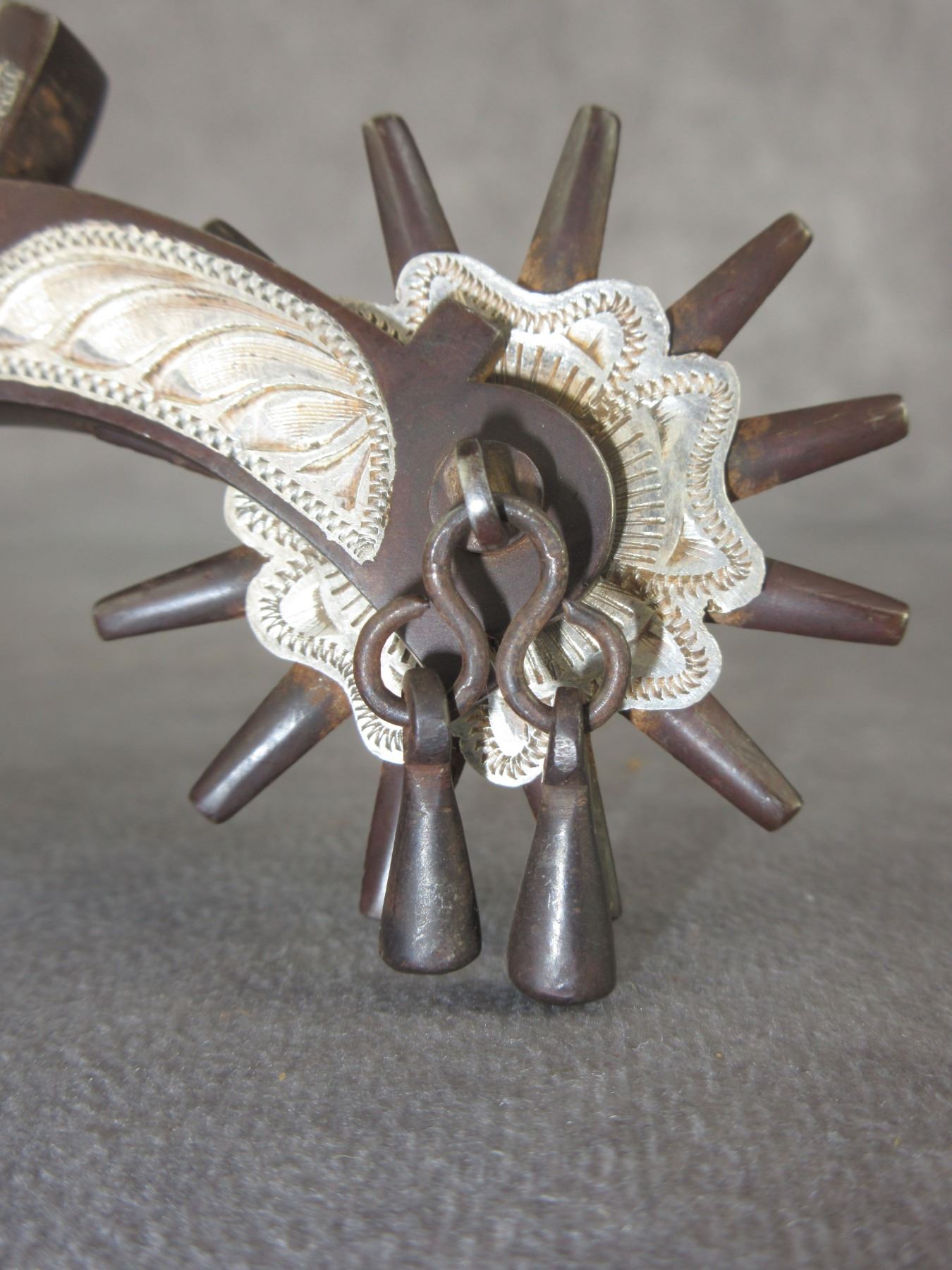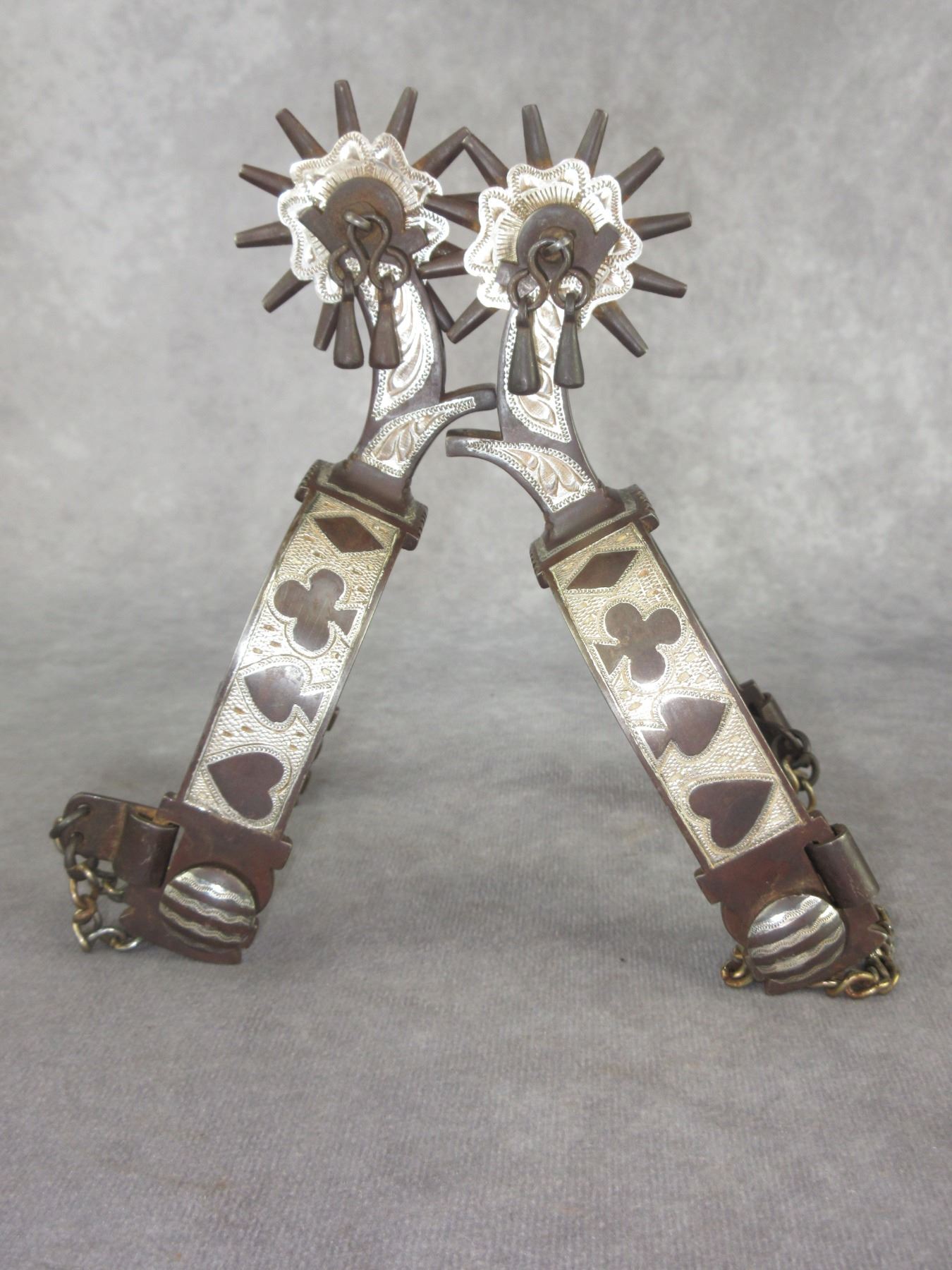 Marked E Garcia Silver Inlaid Card Suit Spurs .8" Bands- 2.25" Drop Shanks- 2" 12 Point Rowels With Covers- Chap Guards- Jingle Bobs- Double Heel Chains- New Condition
