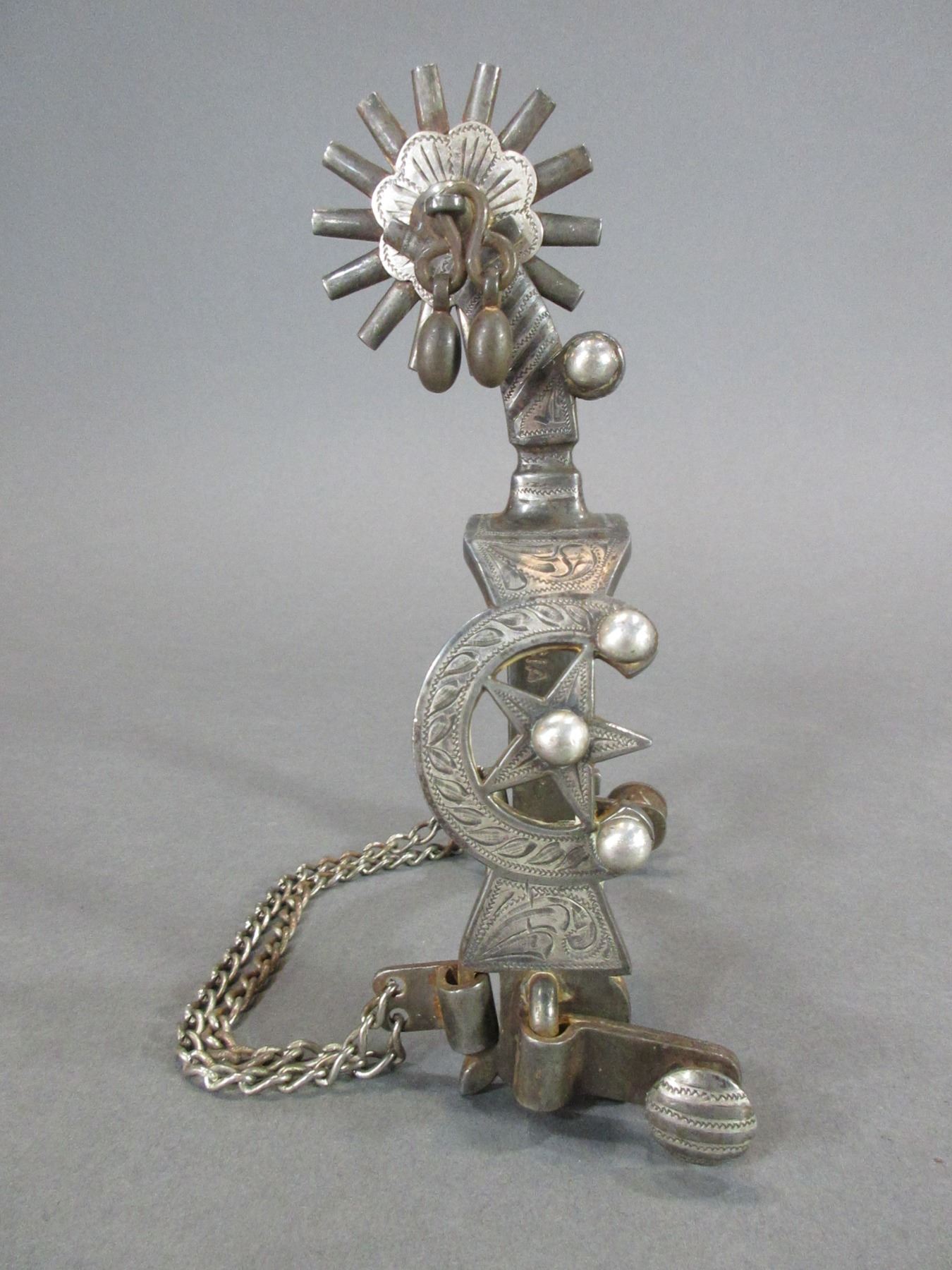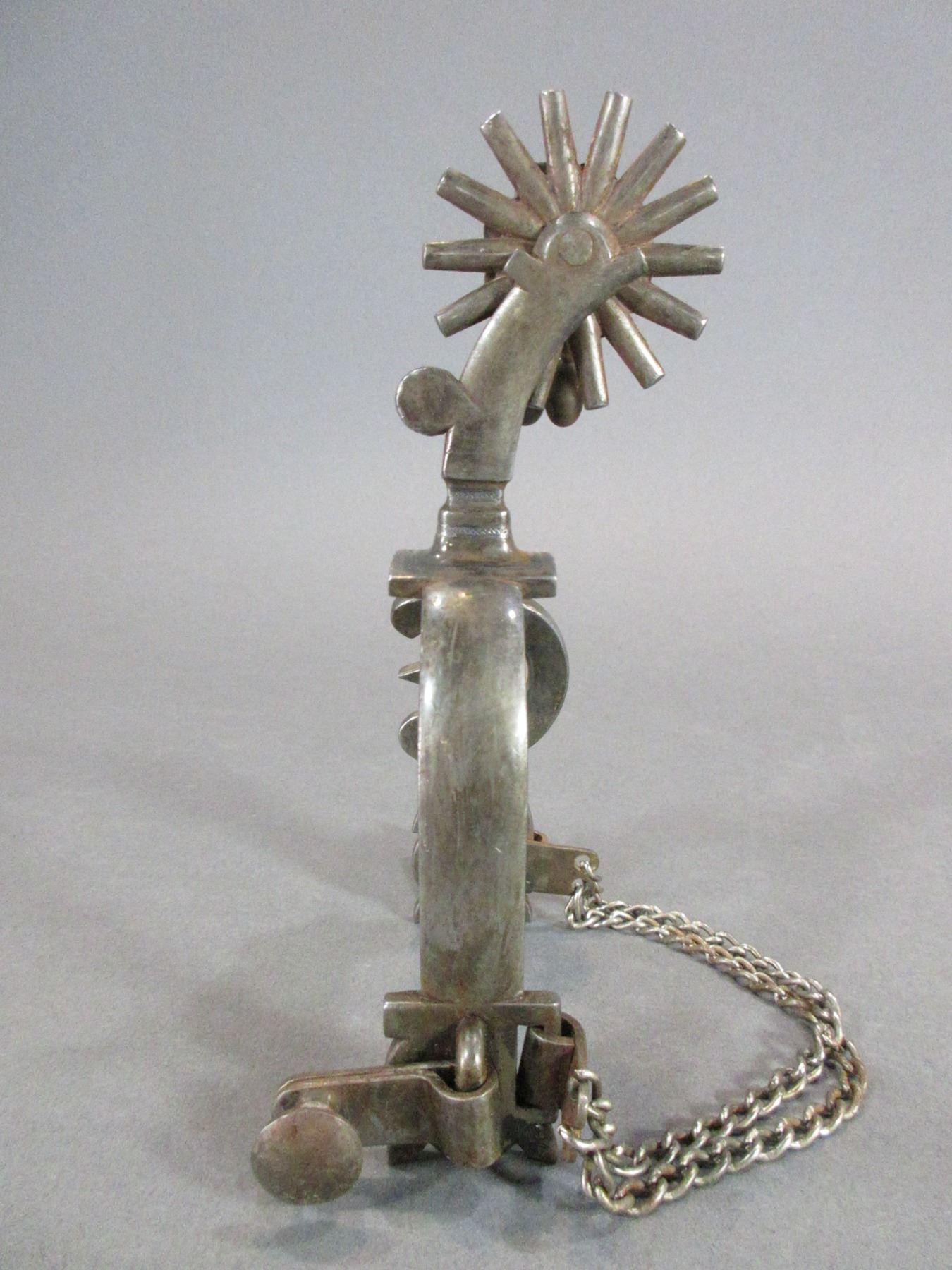 Marked E Garcia Silver Inlaid Spurs- Elko Star Pattern- 1.5" Bands- 2.5" Shanks- 14 Point Rowels With Covers- Barrel Chap Guards- Jingle Bobs- Double Heel Chains- Very Good Condition