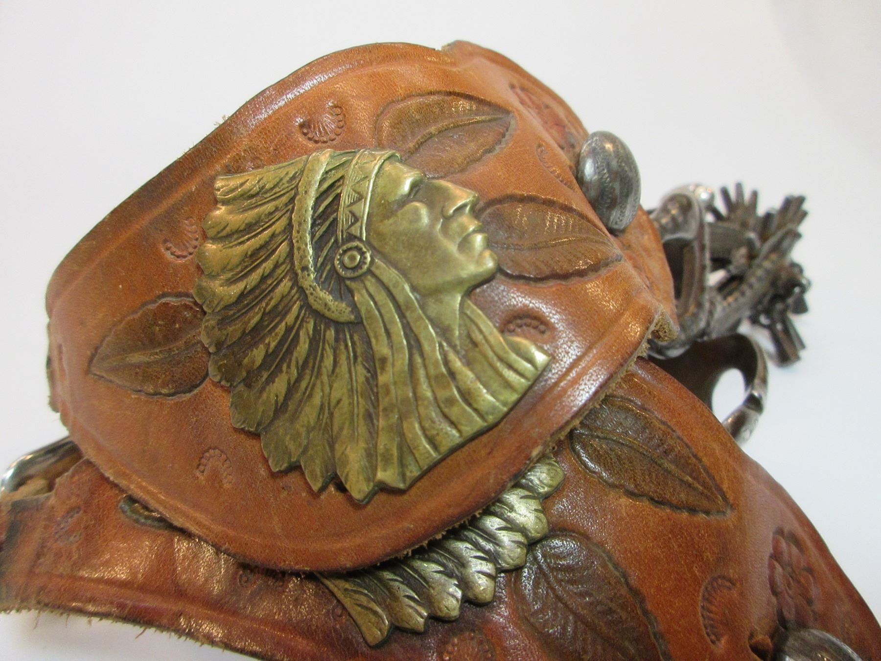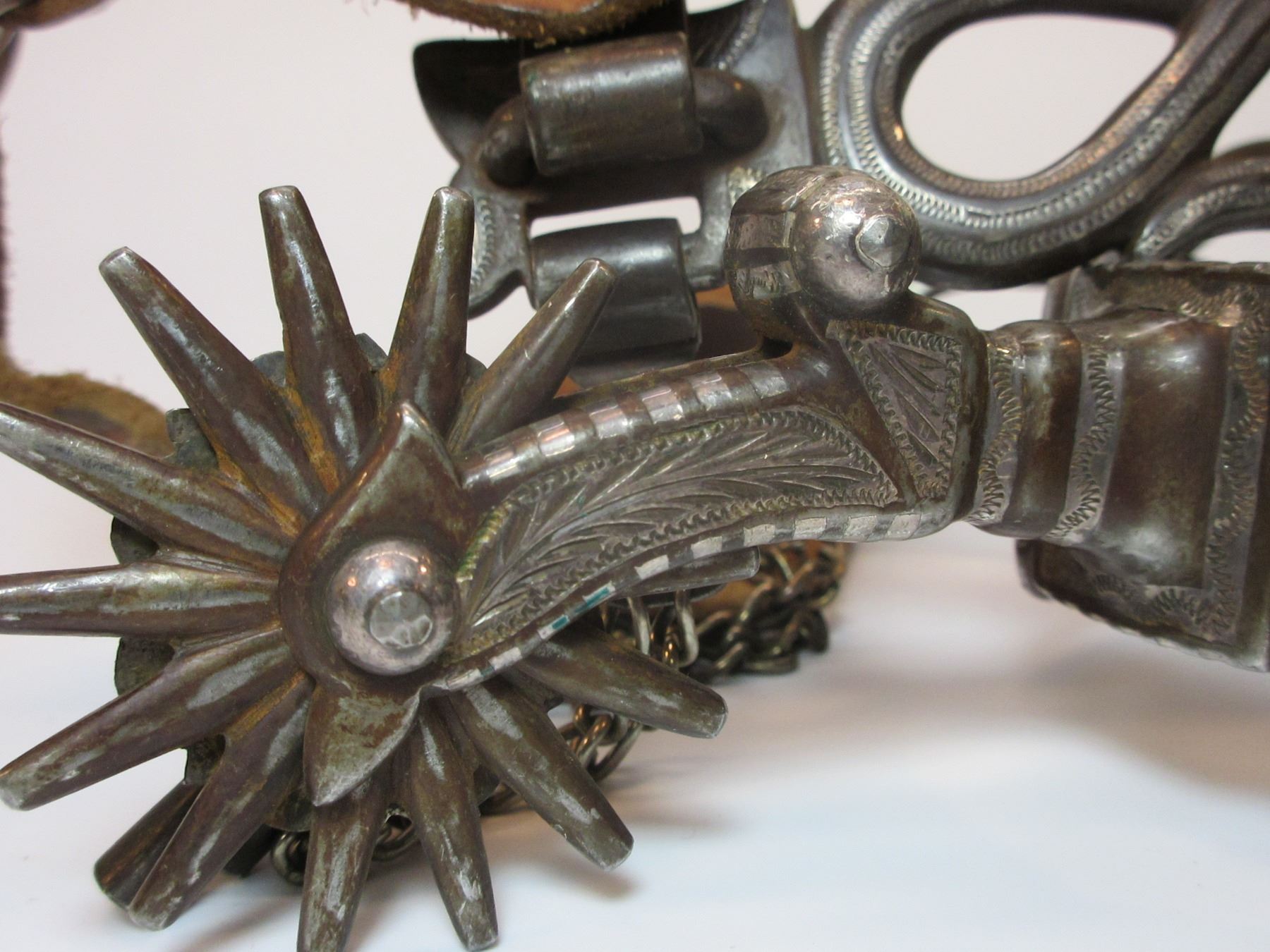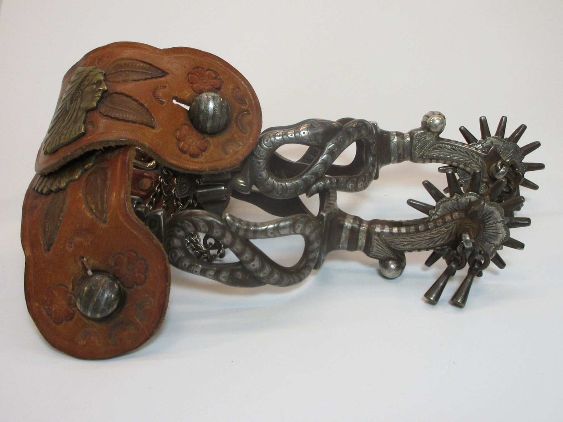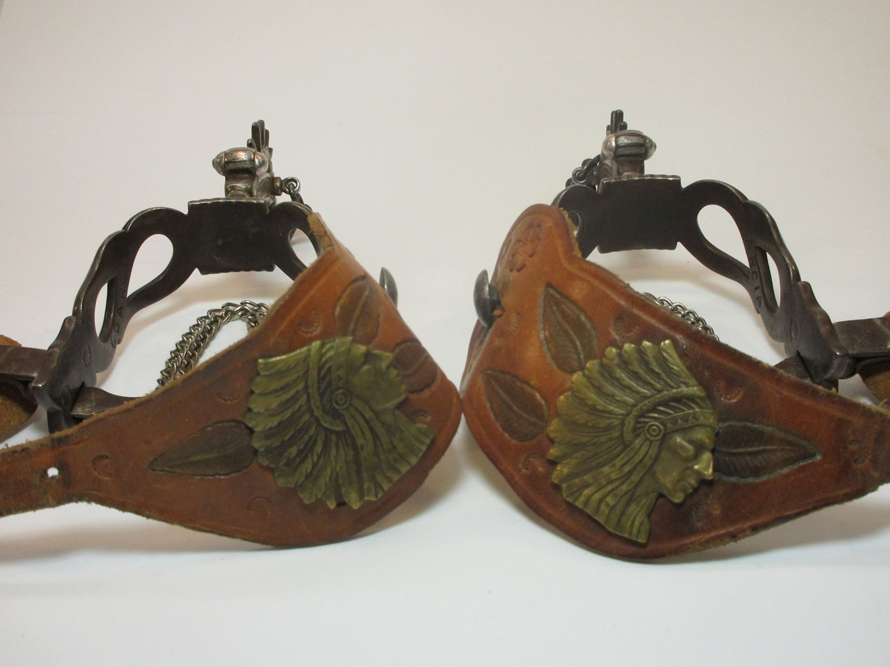 Marked E Garcia Silver Inlaid Spurs- Snake Pattern- 1.5" Bands- 2.5" Shanks- 14 Point Rowels- Barrel Chap Guards- Rowel Covers- Feather Stamped and Brass Indian Heads on Straps