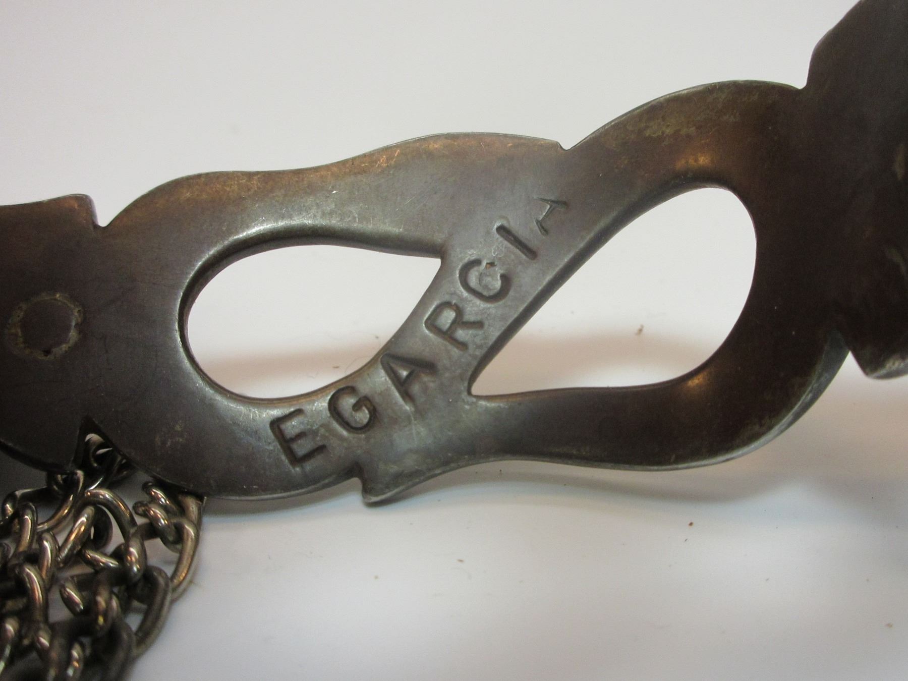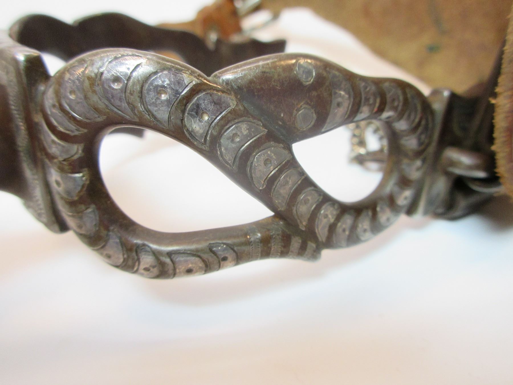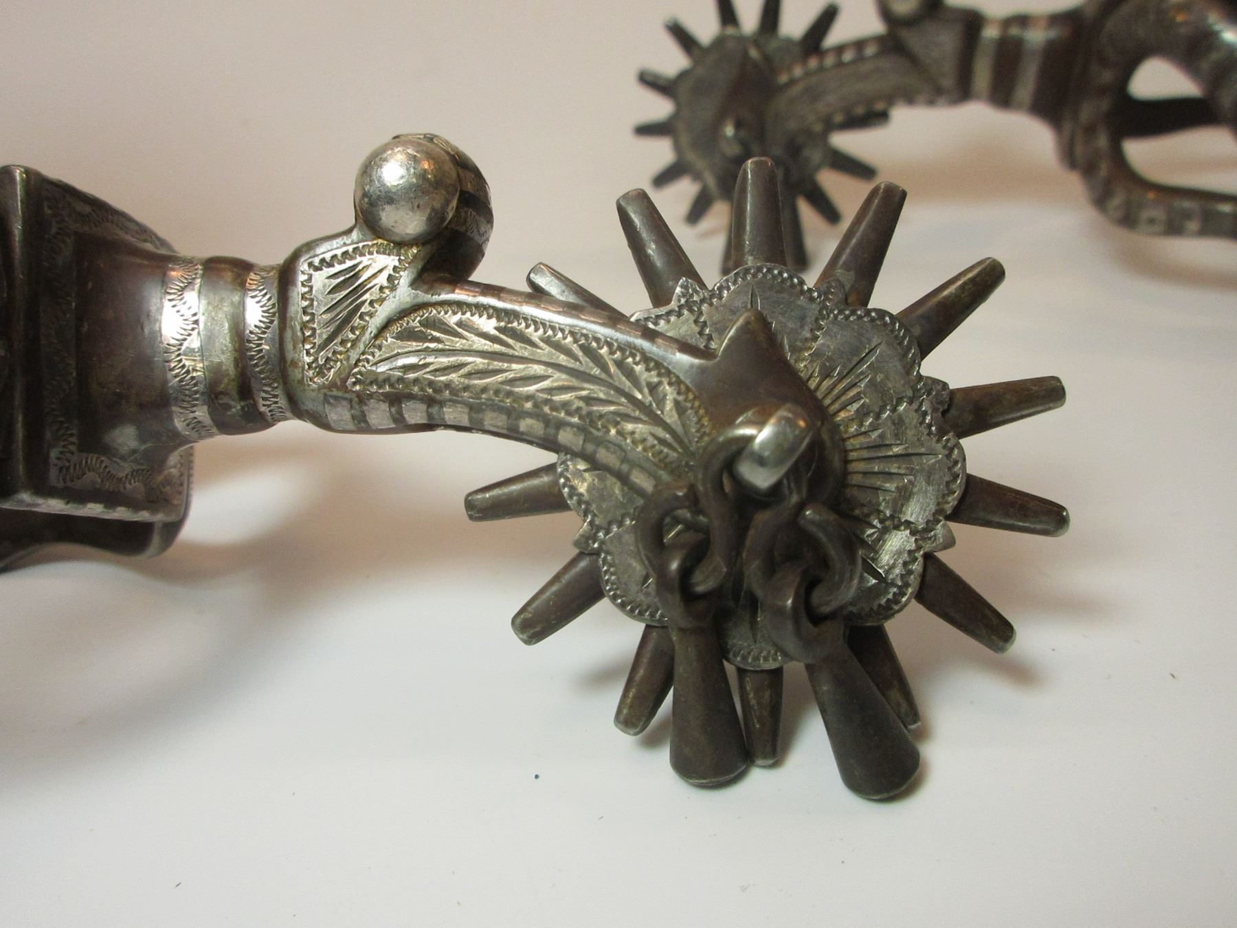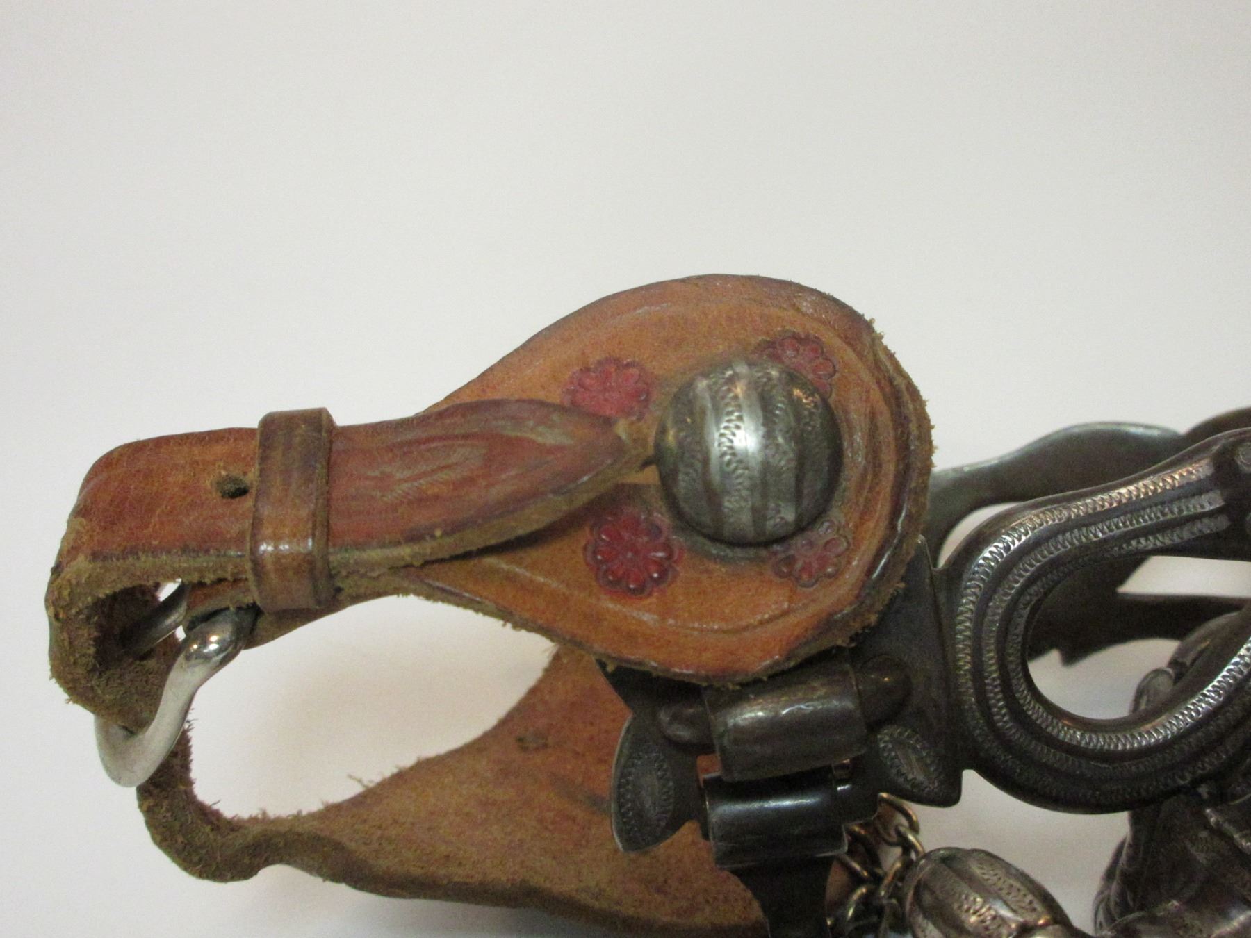 Marked E Garcia Silver Inlaid Spurs- Snake Pattern- 1.5" Bands- 2.5" Shanks- 14 Point Rowels- Barrel Chap Guards- Rowel Covers- Feather Stamped and Brass Indian Heads on Straps