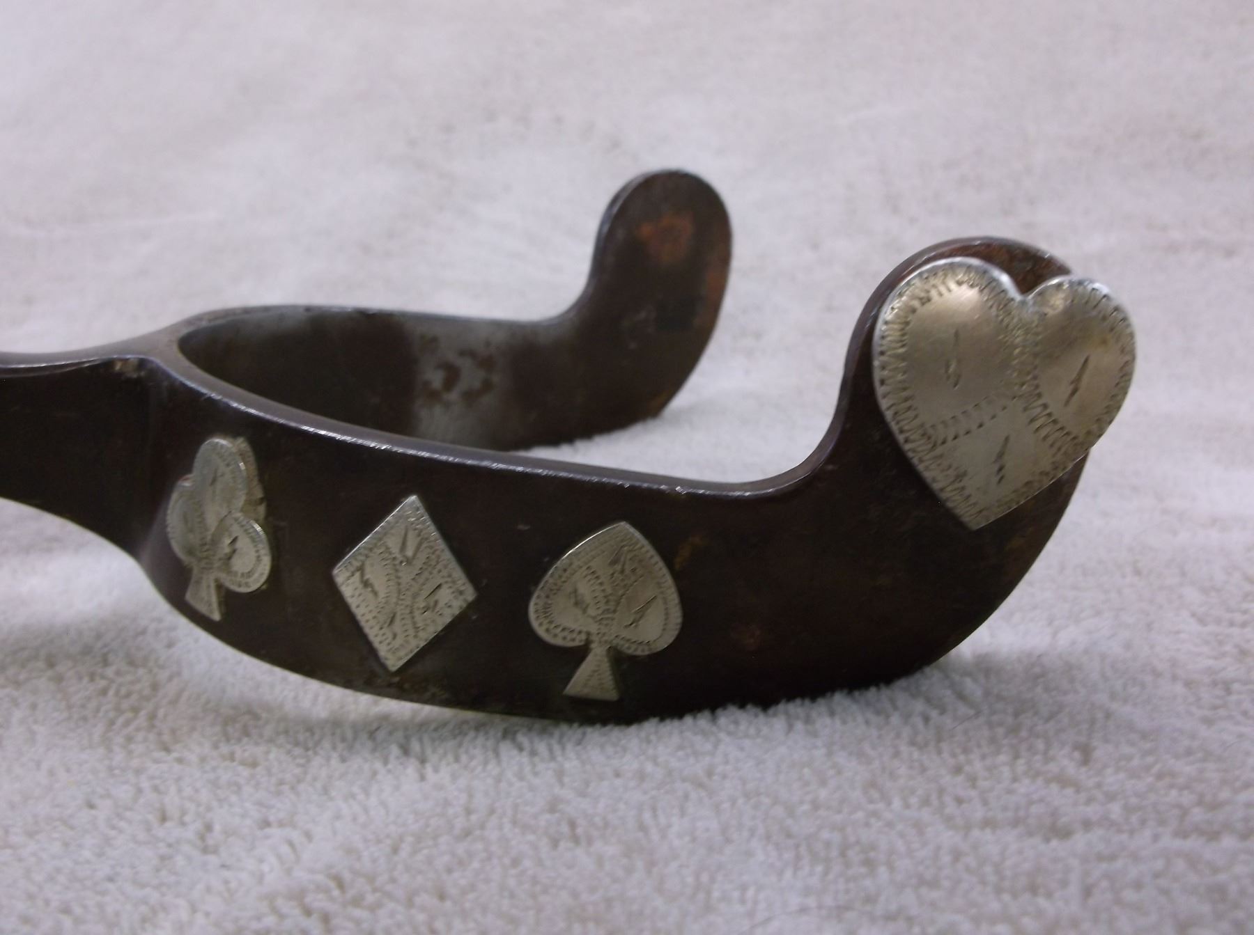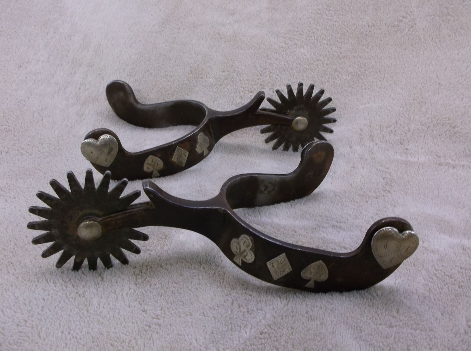 Marked ET Silver Overlaid Card Suit Spurs- Chap Guards- 20 Point Rowels- 1"Bands 2.5" Shanks