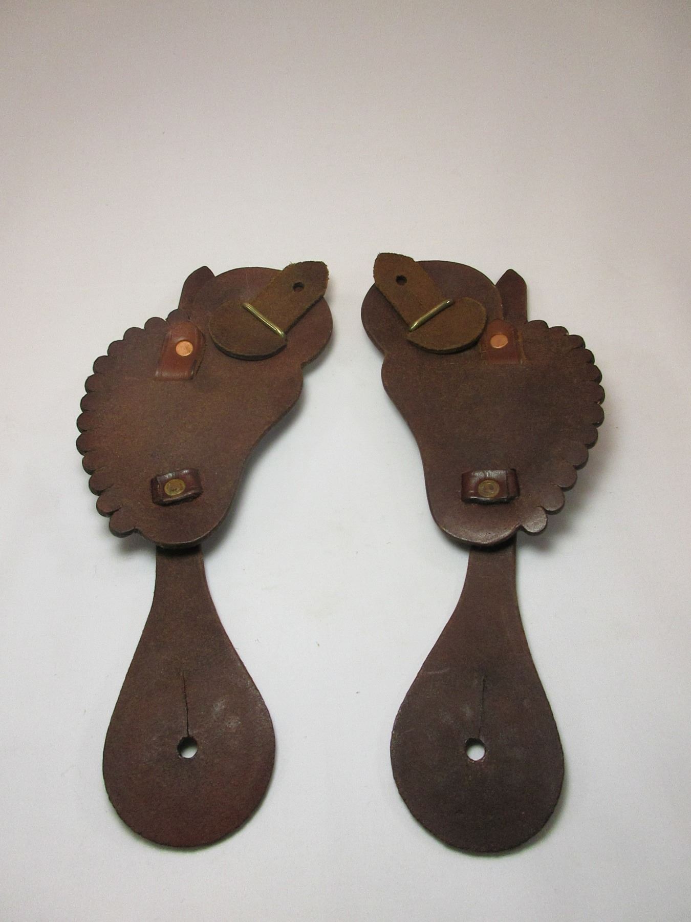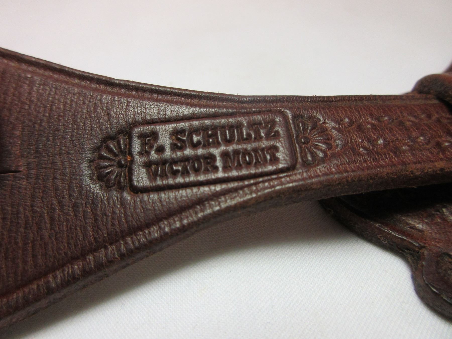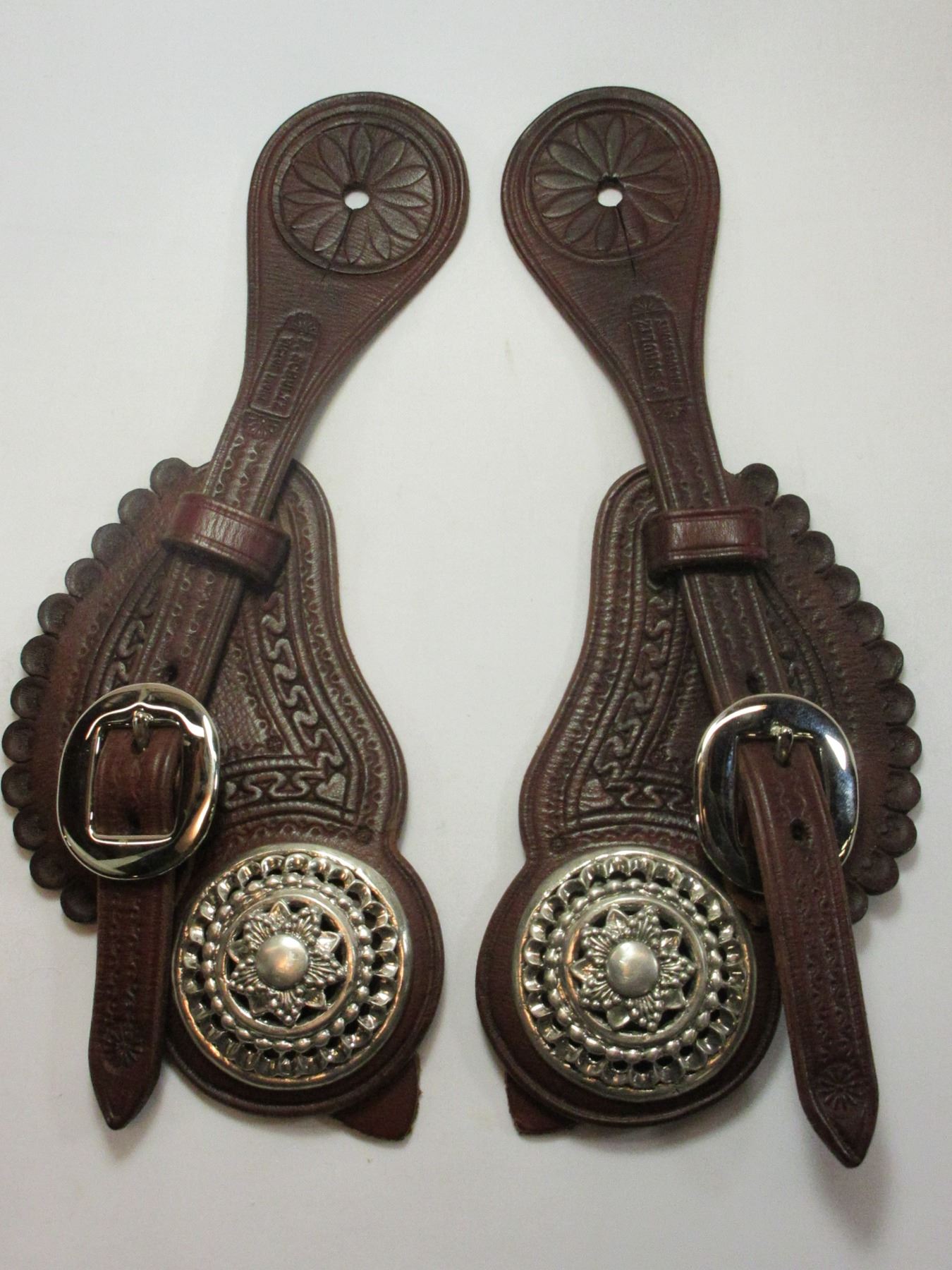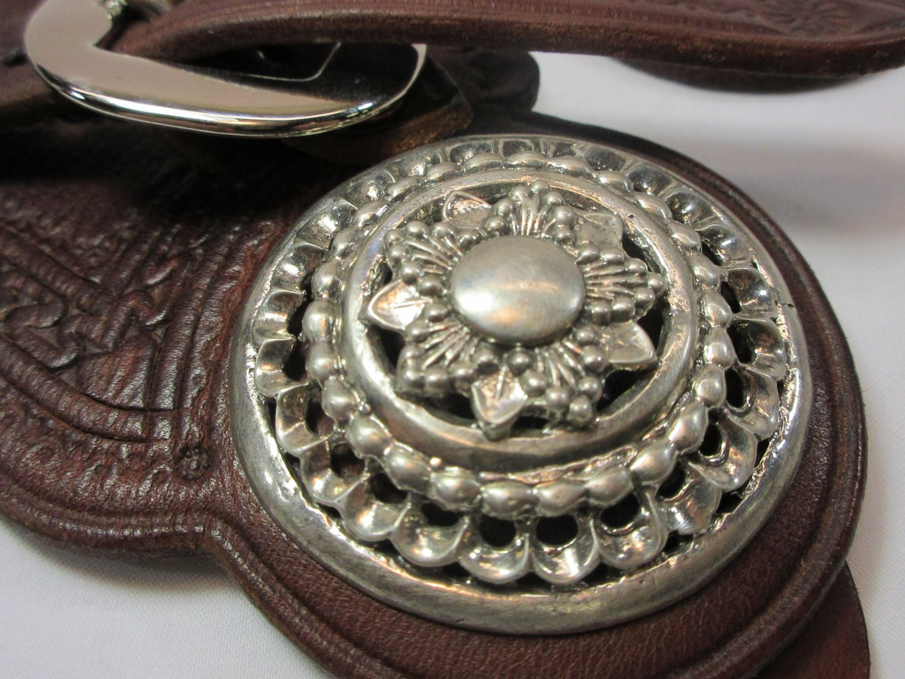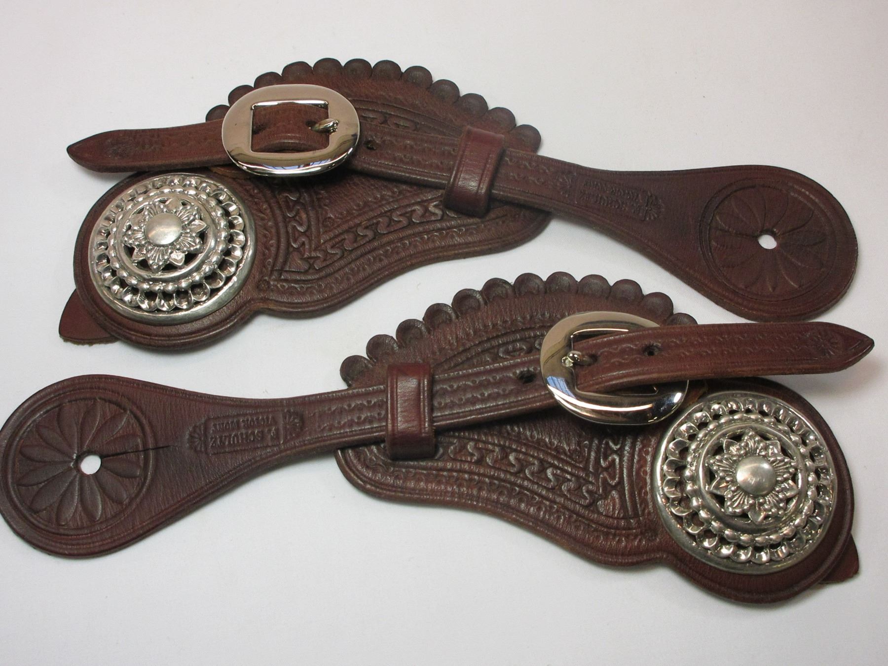 Marked F Schultz Tooled Spur Straps- Unmarked F Schultz Silver Filigree 2" Conchos
