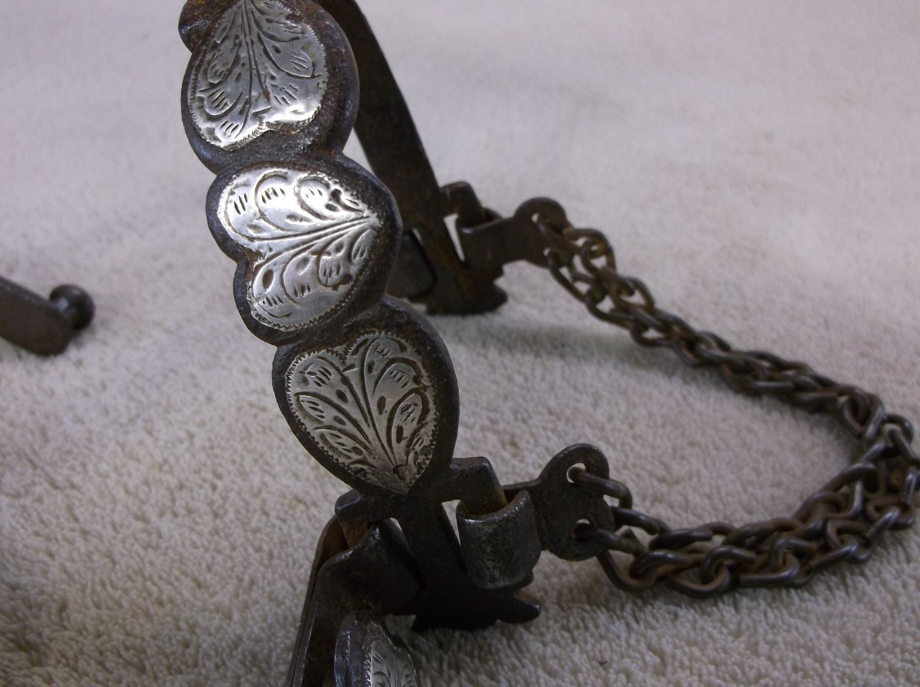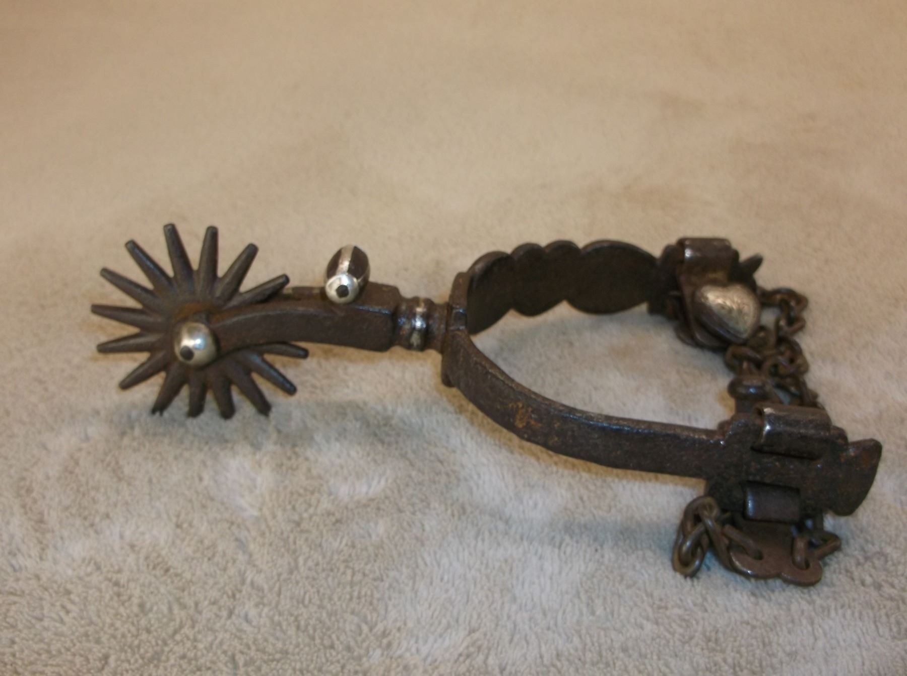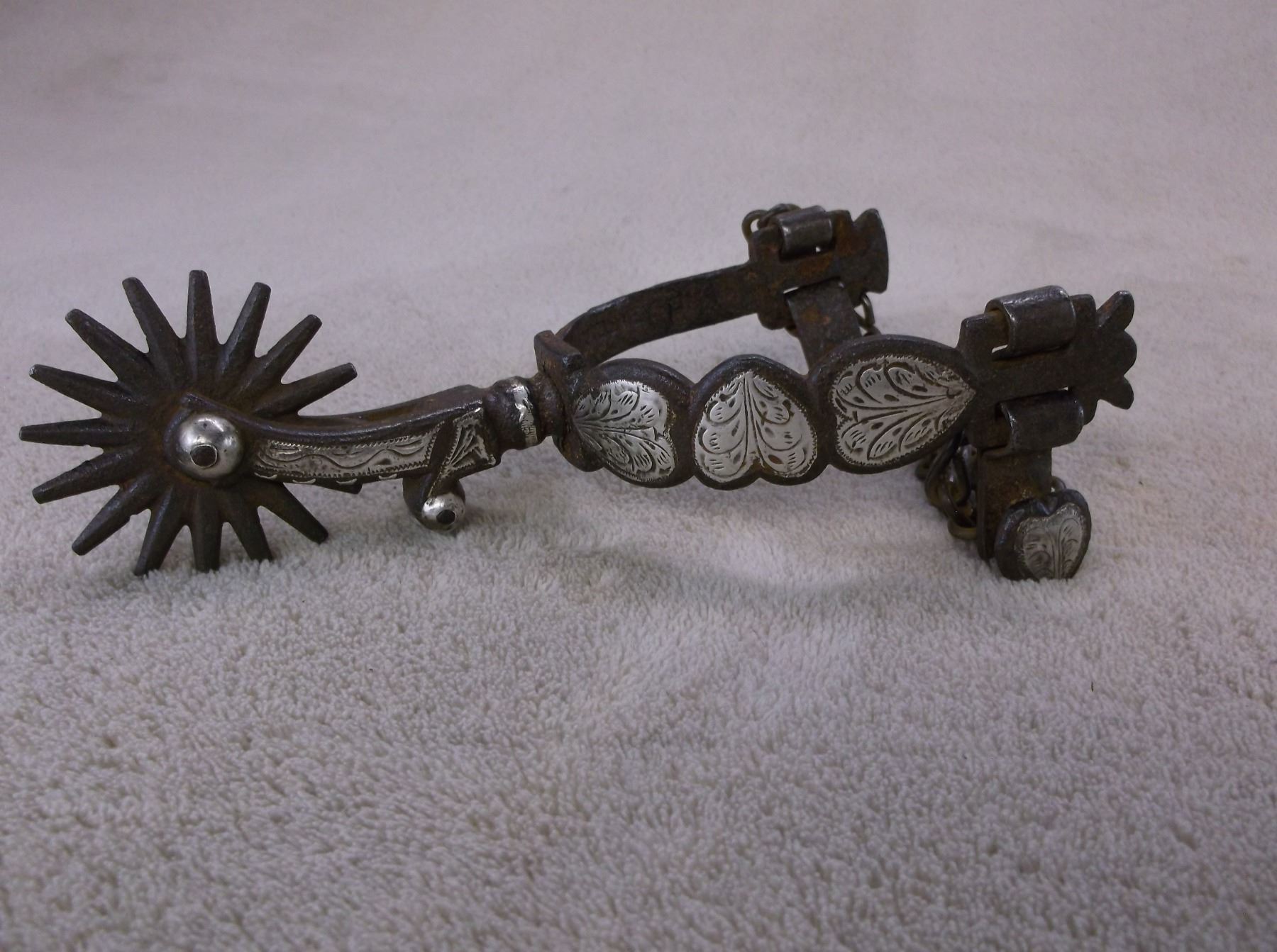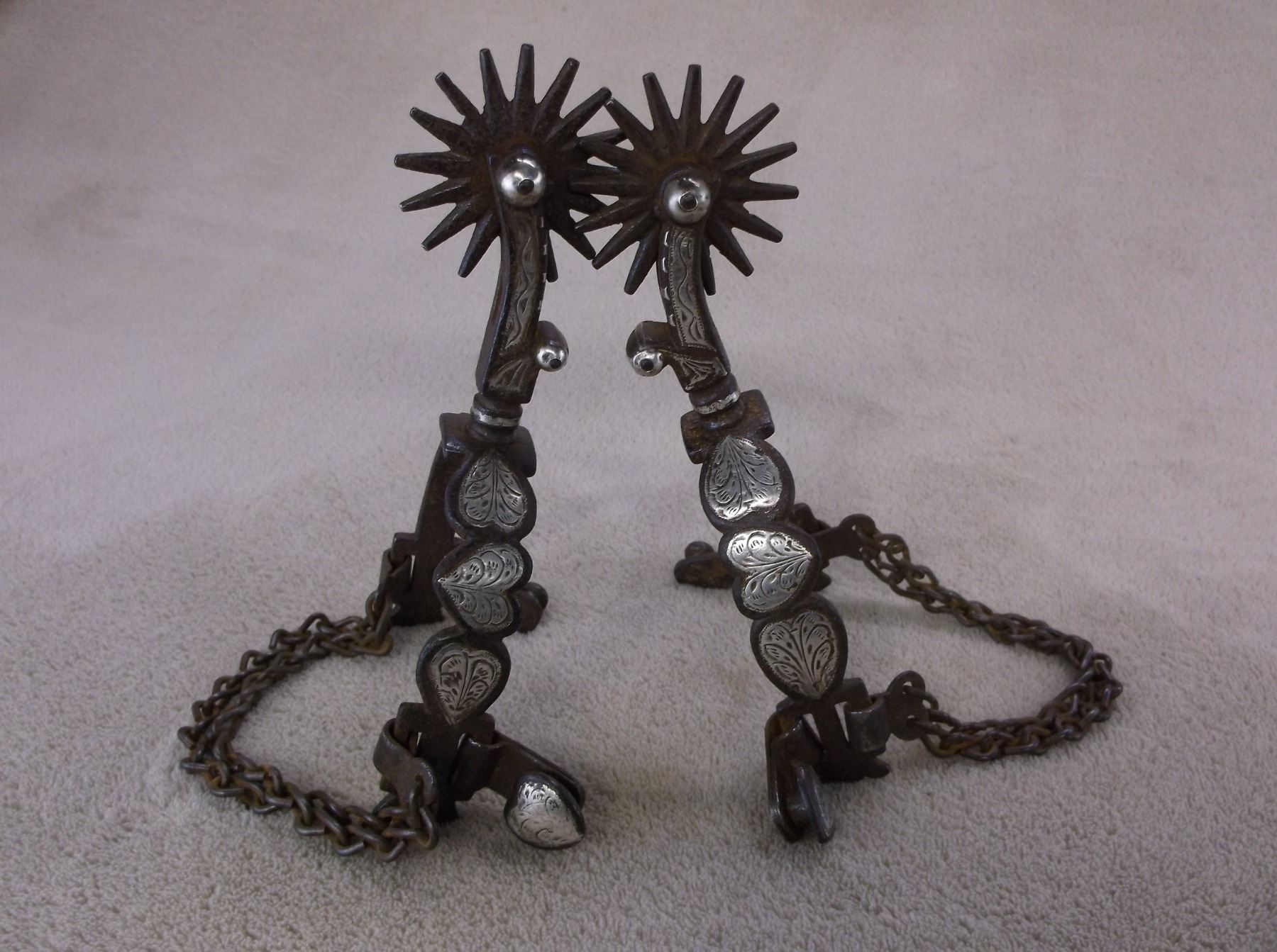 Marked GS Garcia Elko Nev Silver Inlaid Spurs- Backwards N- 4 Heart Pattern- Barrel Chap Guards- Heel Chains- 16 Point Rowels- .75" Banks 2.5" Shanks- Slight Pitting On Inside Shank of Left Spur