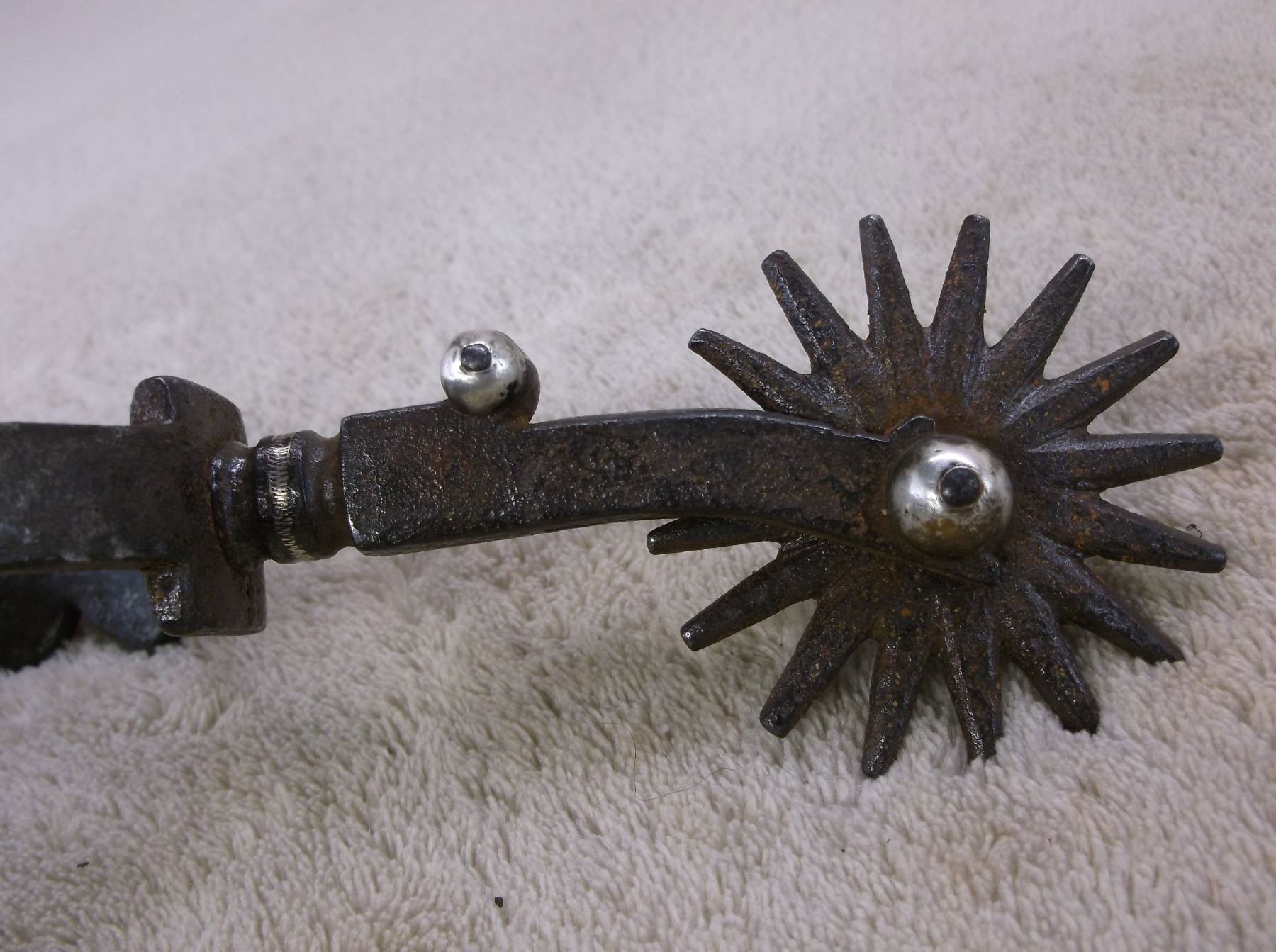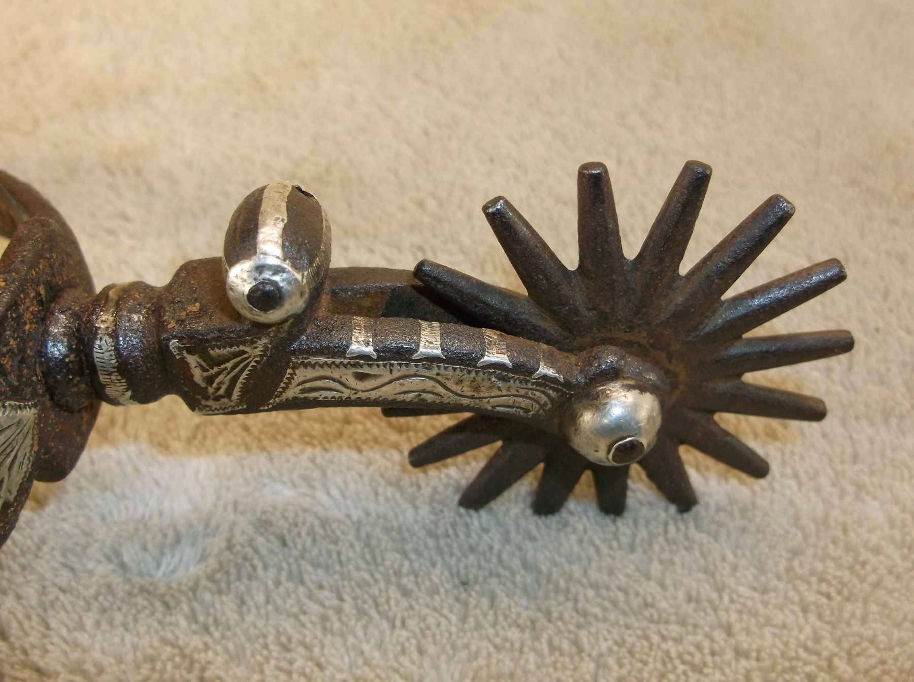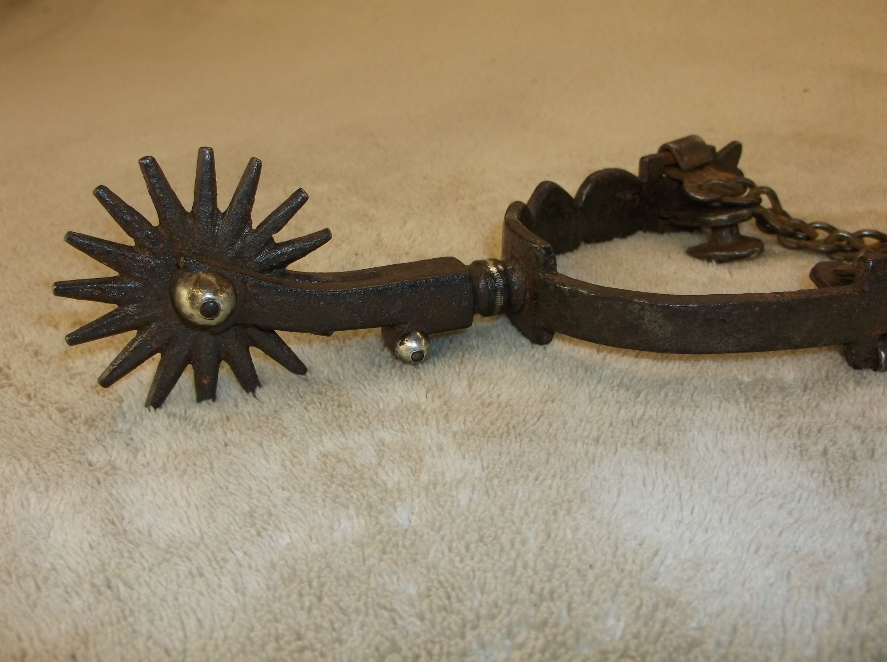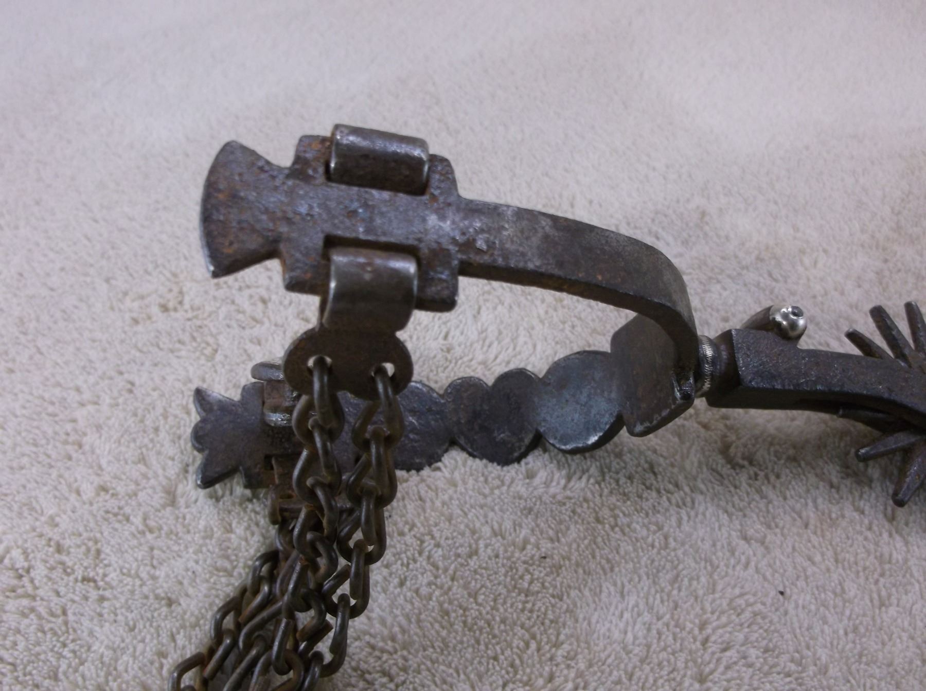Marked GS Garcia Elko Nev Silver Inlaid Spurs- Backwards N- 4 Heart Pattern- Barrel Chap Guards- Heel Chains- 16 Point Rowels- .75" Banks 2.5" Shanks- Slight Pitting On Inside Shank of Left Spur