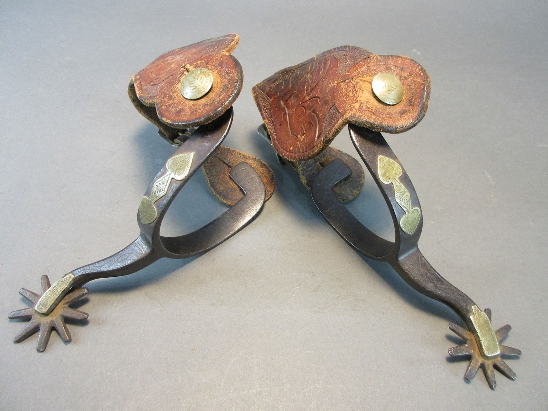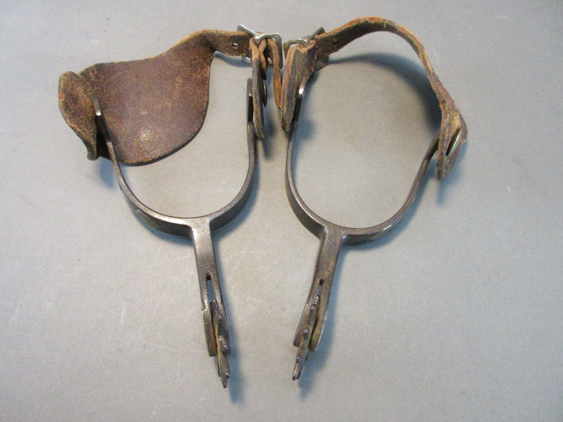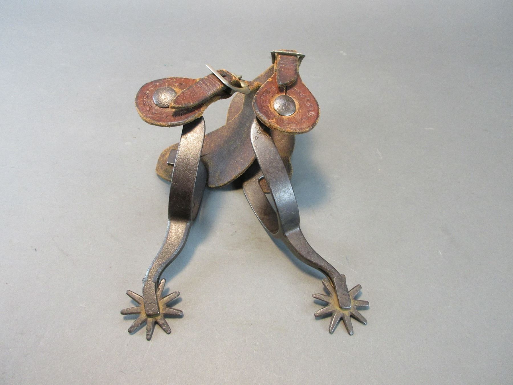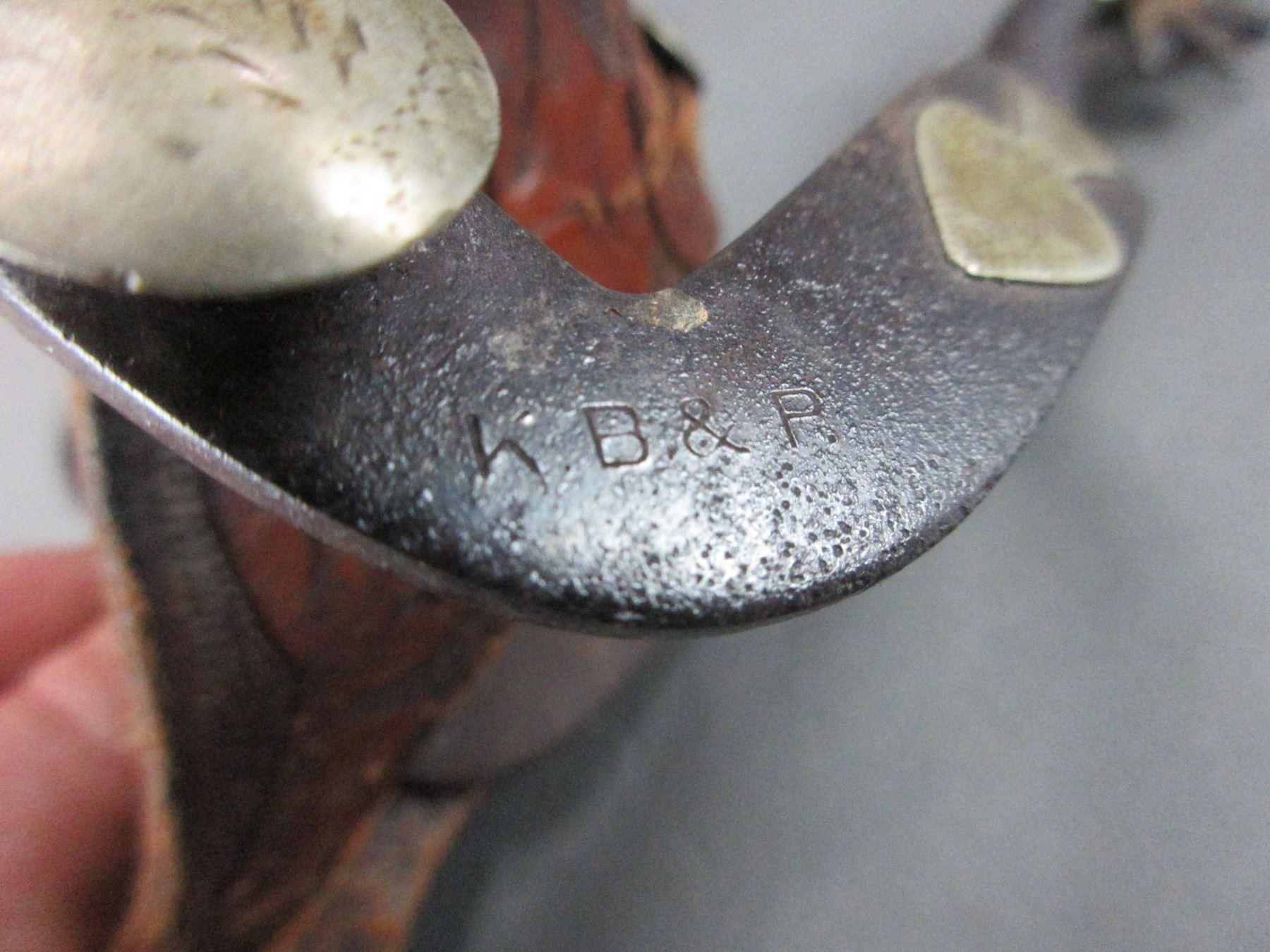 Marked KB+P Silver Overlaid Spurs- .6" Bands- 2.4" Shanks- 9 Point Rowels- Tooled Straps- Fair Condition