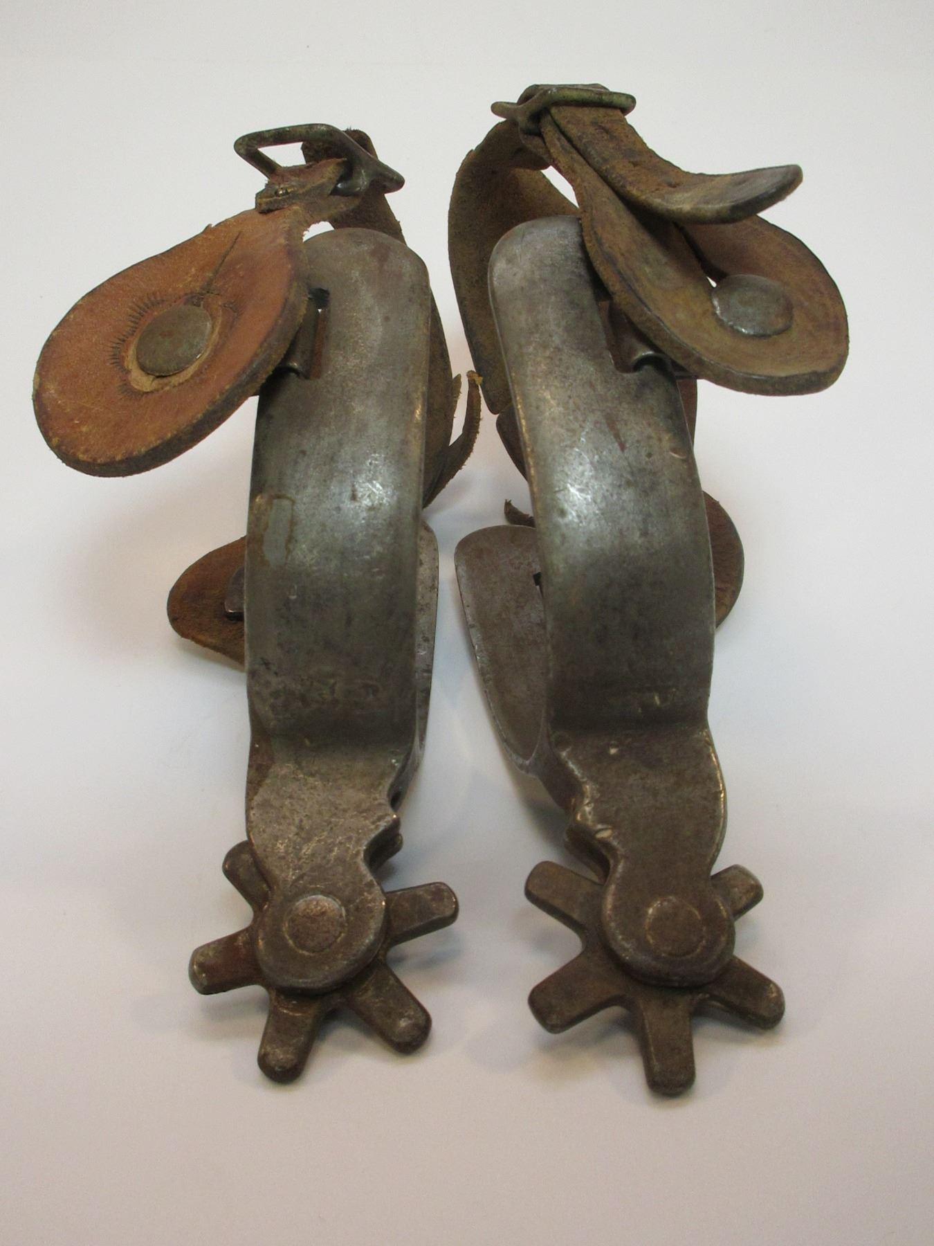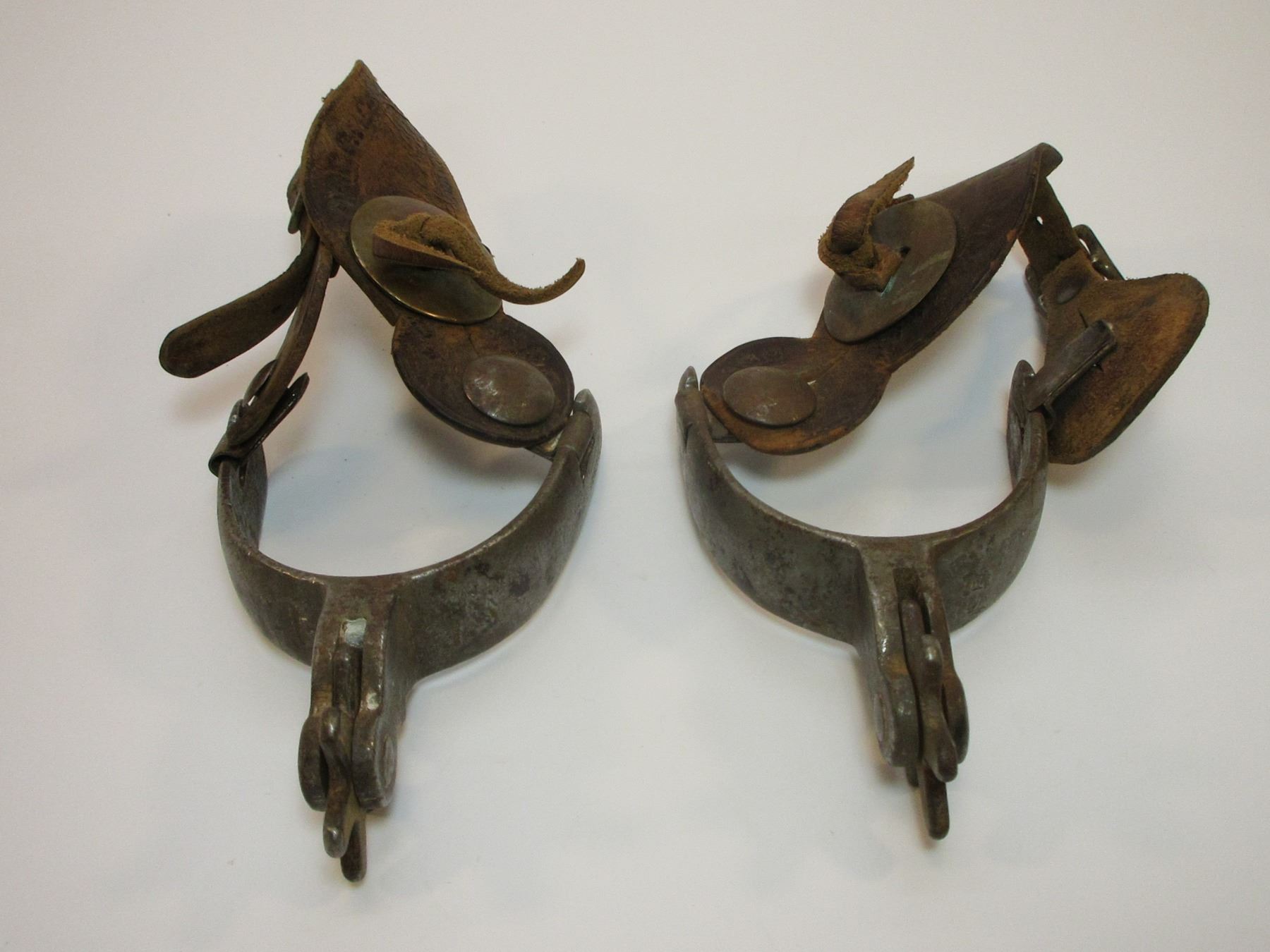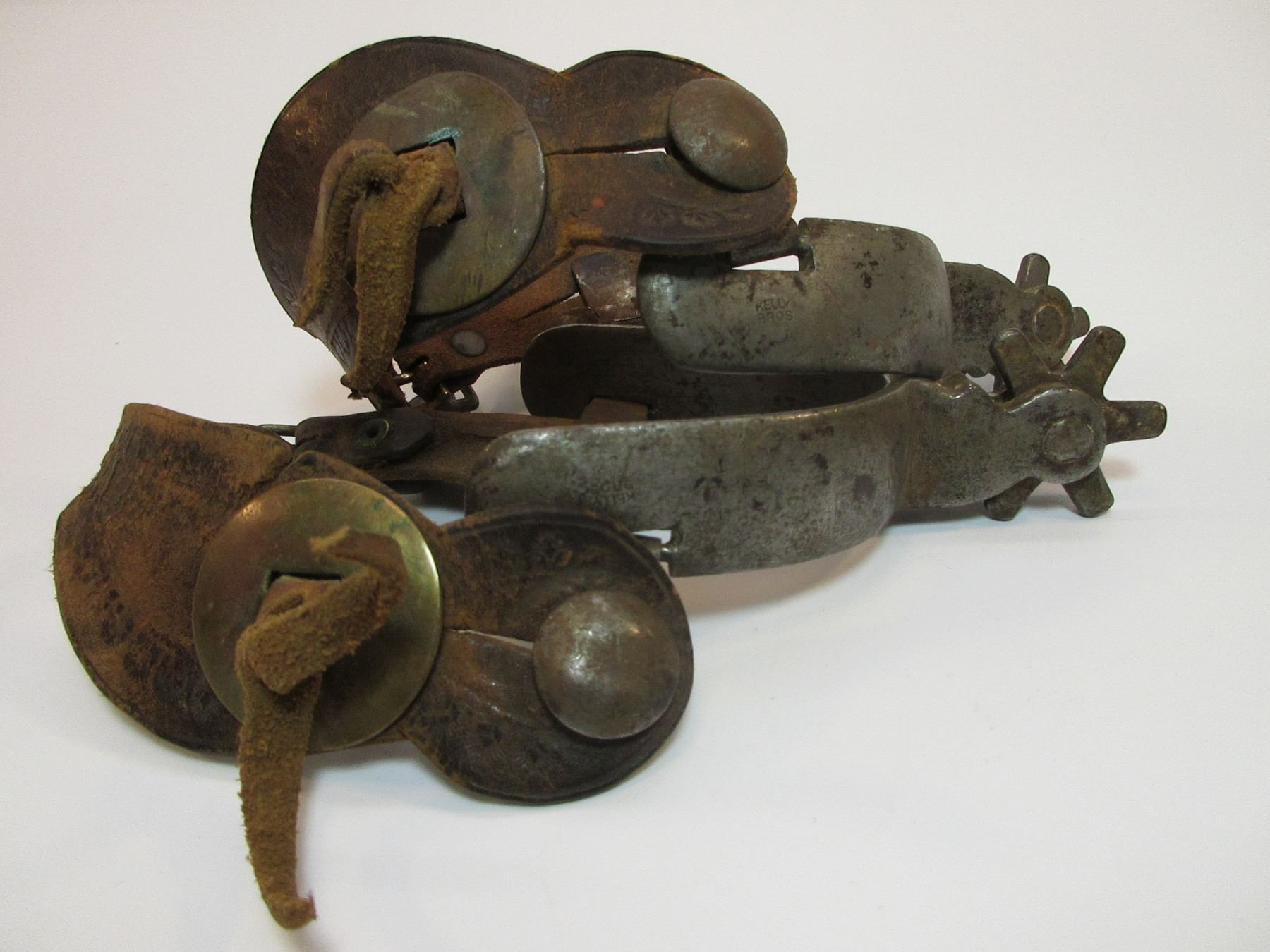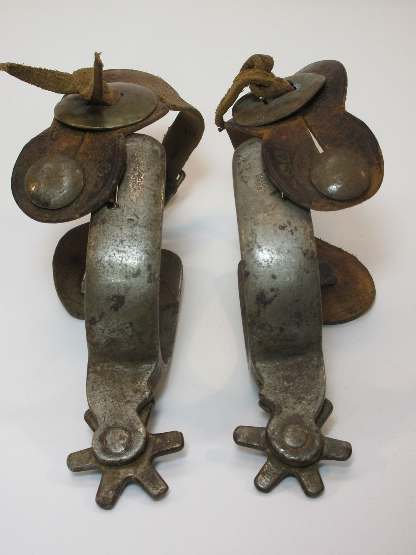 Marked Kelly Bros Heavy Beaded Spurs- 1.2" Bands- 1.5" Shanks- 6 Point Rowels- Original Stamped Straps with Copper Conchos