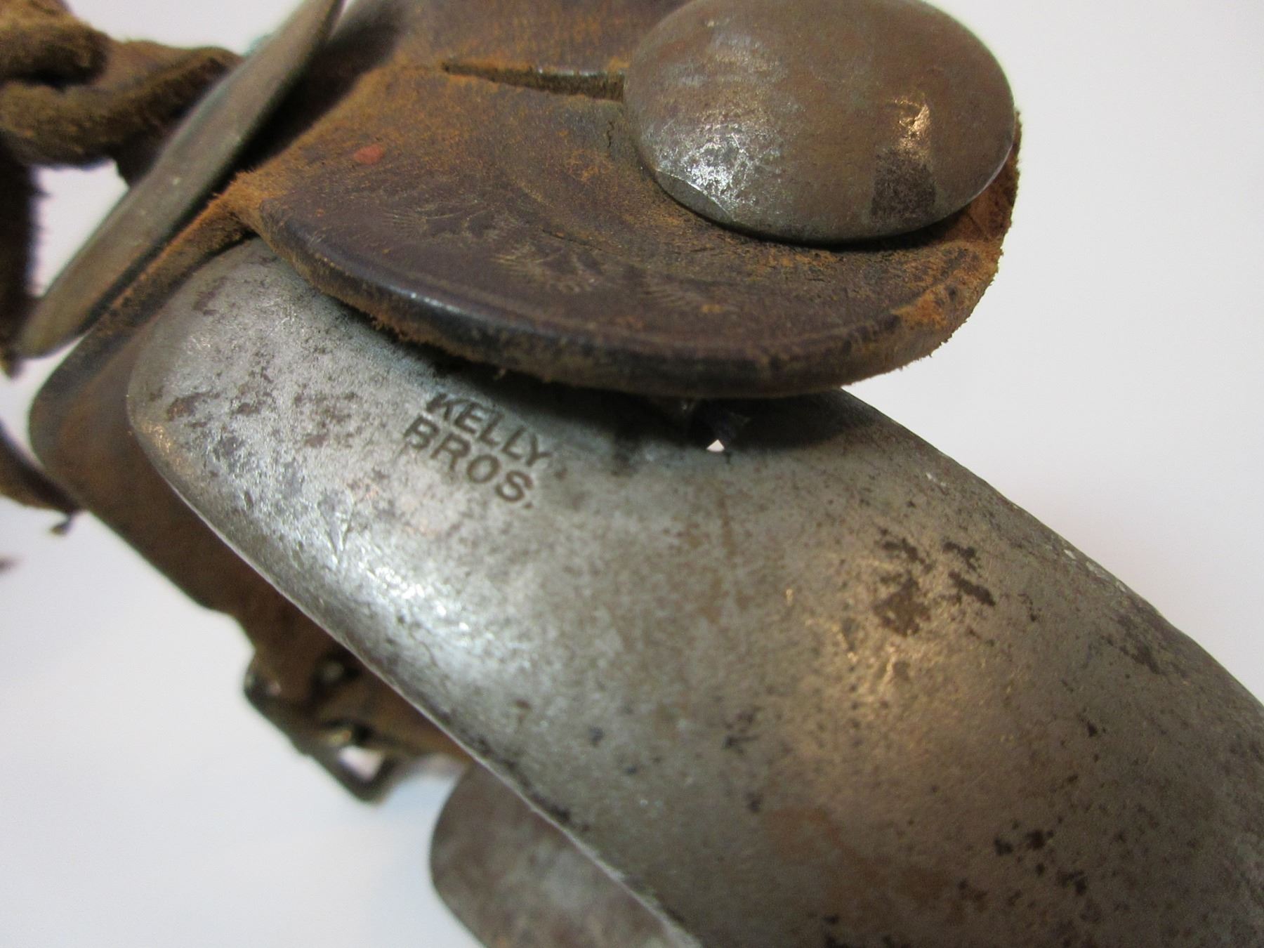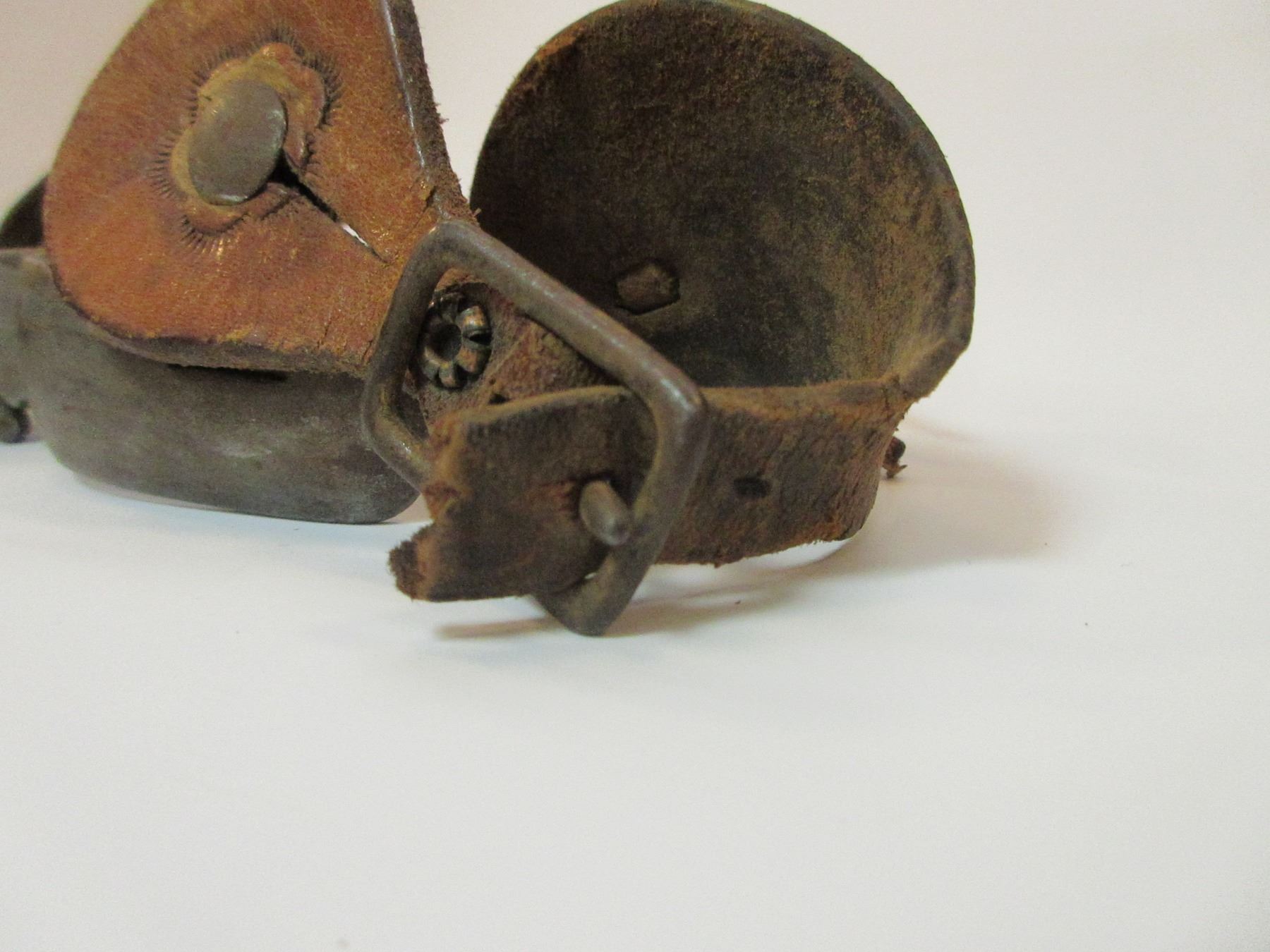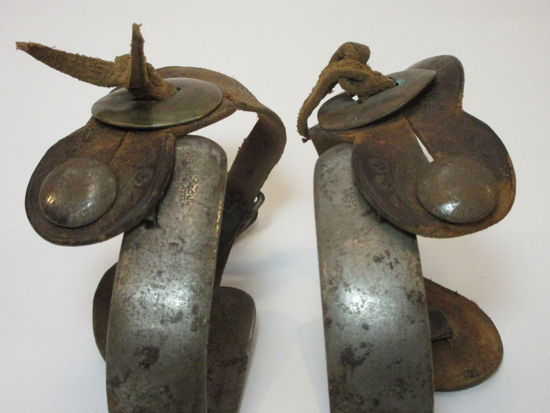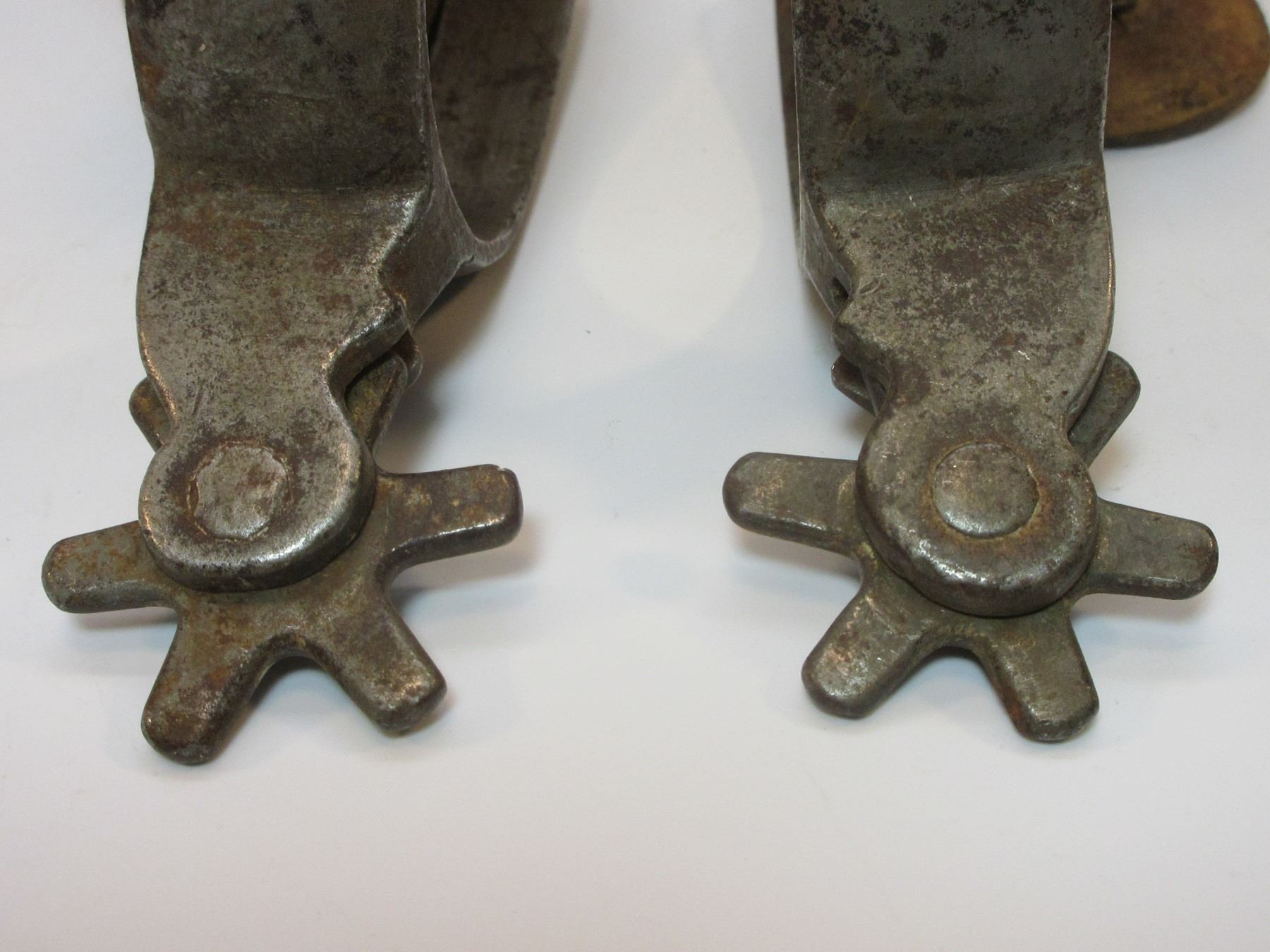 Marked Kelly Bros Heavy Beaded Spurs- 1.2" Bands- 1.5" Shanks- 6 Point Rowels- Original Stamped Straps with Copper Conchos