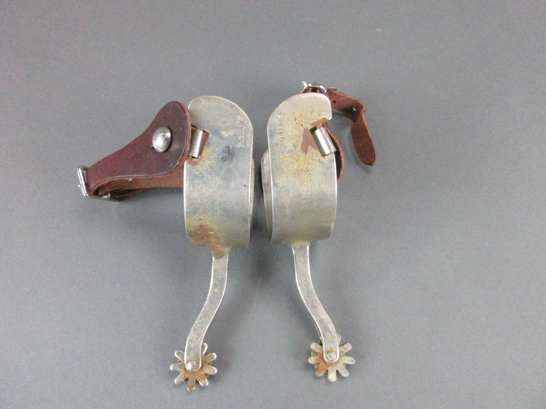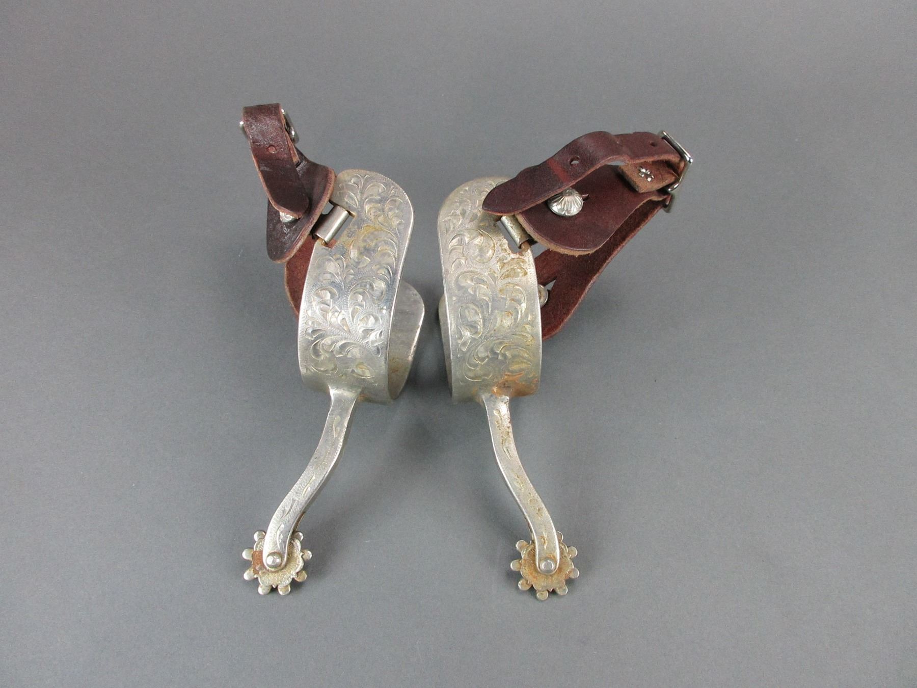Marked Kelly Silver Overlaid Spurs- 1.5" Bands- 3" Shanks- 9 Point Rowels With Covers- Straps- Fair Condition
