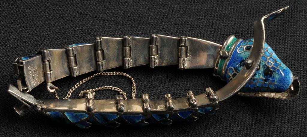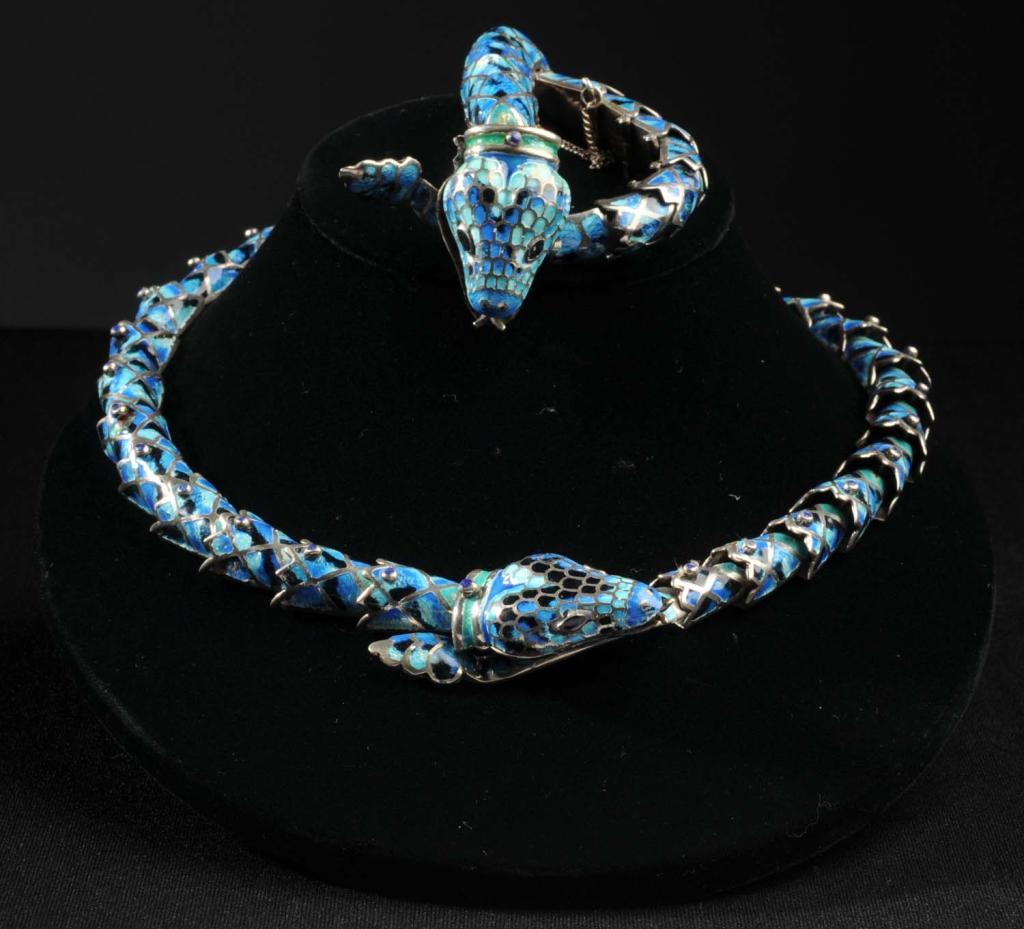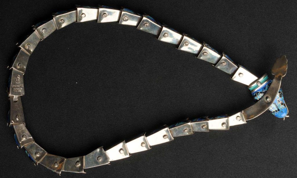 Description Hinged construction with enameled greens, blues, and black in the style of Margot. Slight wear to enamel. Condition (Excellent). Size Necklace: 18" L.