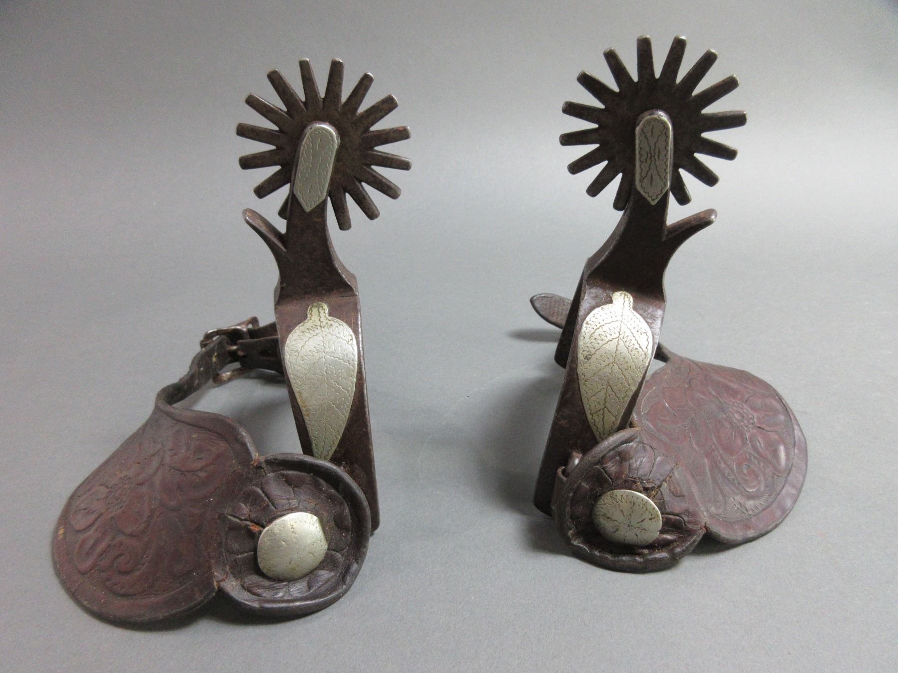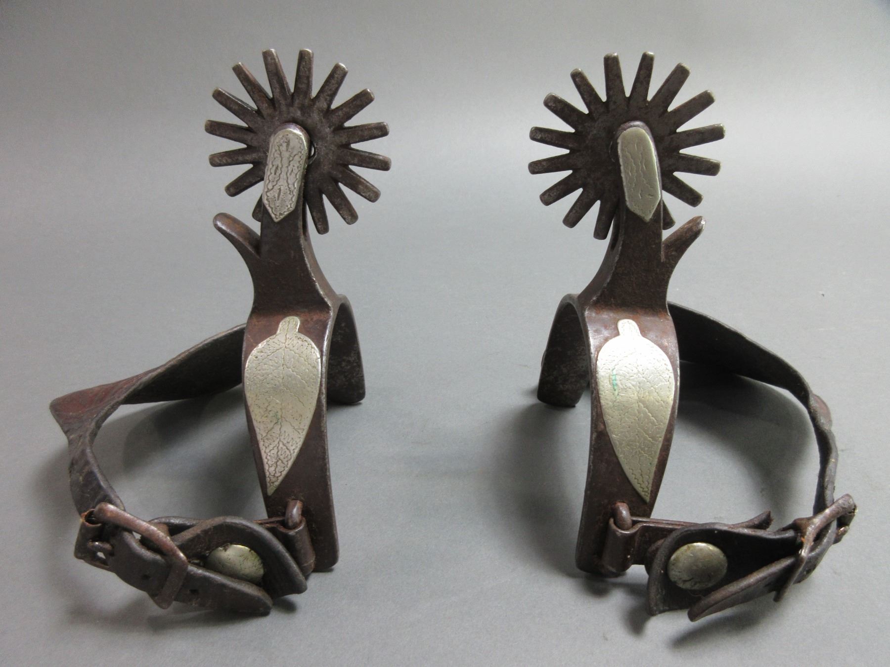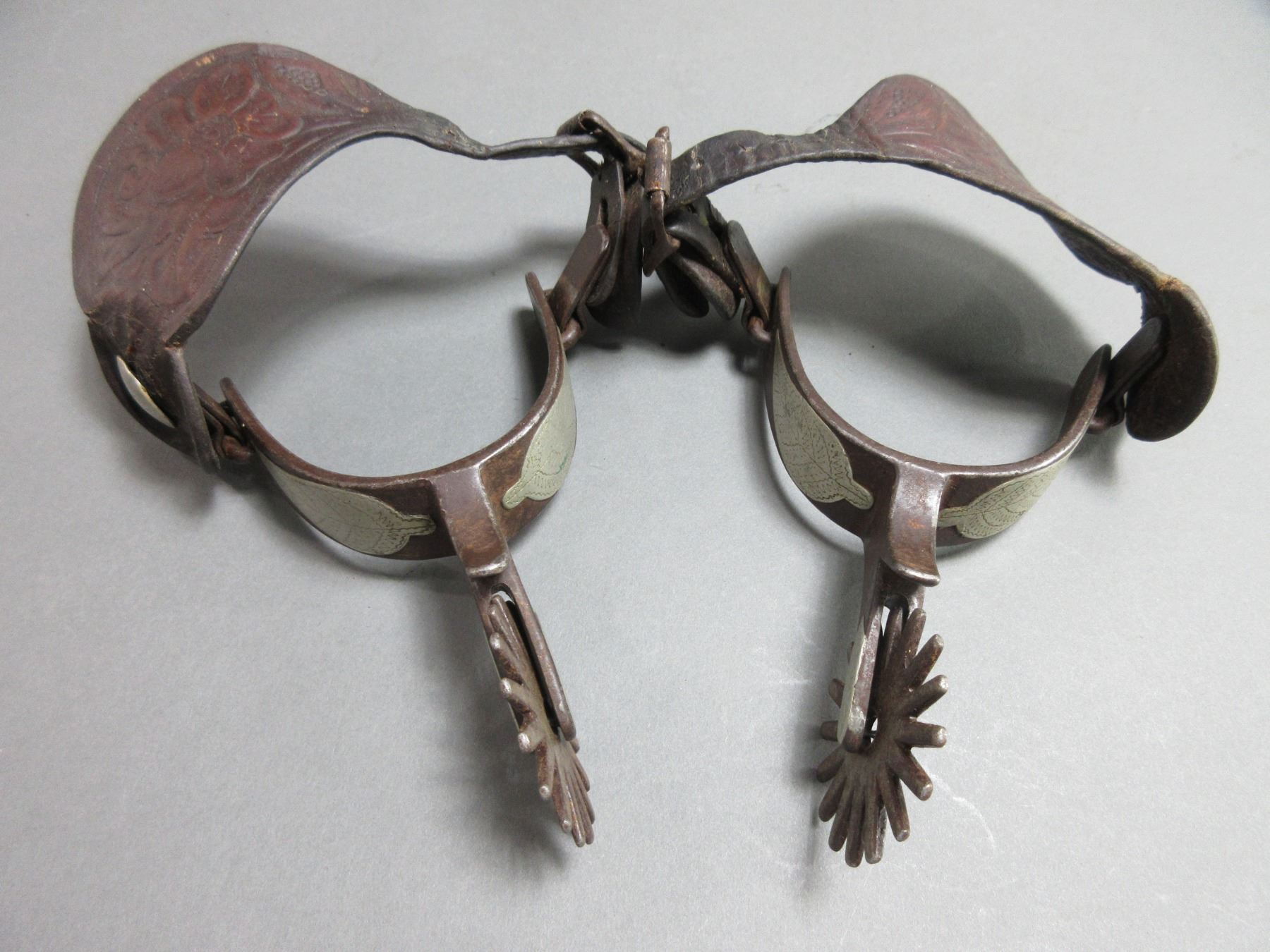 Marked O Crockett Inside The Band Silver Overlaid Double Mounted Spurs- 1.2" Heavy Bands- 2.5" Shanks- 2.25" 16 Point Rowels- Tooled Straps- Decent Condition